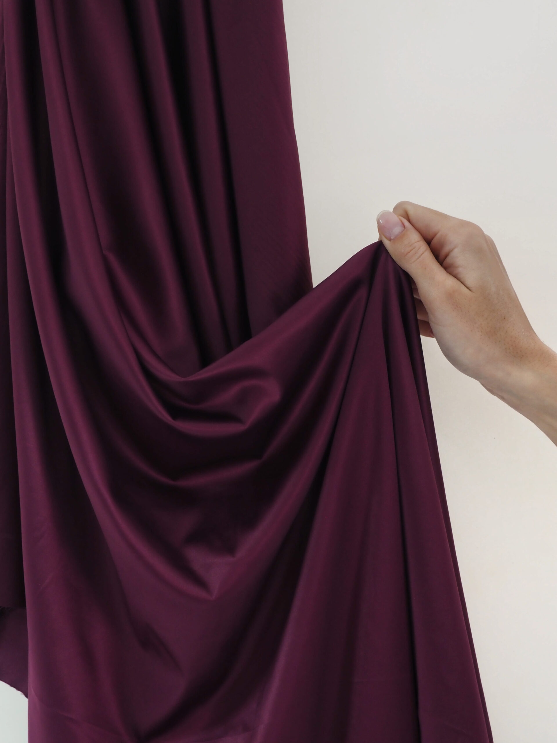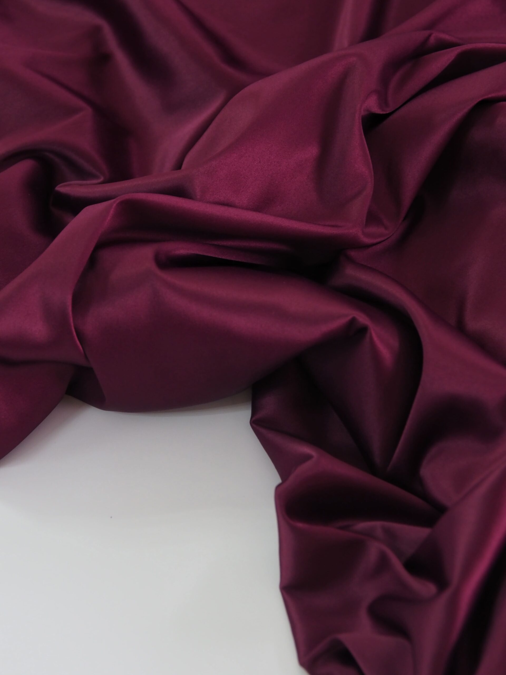 Атлас стрейч слива - лёгкая, приятная к телу ткань, основа состава это полиэстер и эластан. Ткань тянется по утку (поперечное сечение). Сатин очень тонкий, но при этом имеет достаточную плотность, что делает его упругим. Ткань хорошо "дышит", отводит влагу, а при низких температурах не холодит тело. Атлас эластичный, практичный, медленно изнашивается, не даёт усадку. Подходит для пошива купальников, нижнего белья, вечерних платьев, платков и другой повседневной одежды.