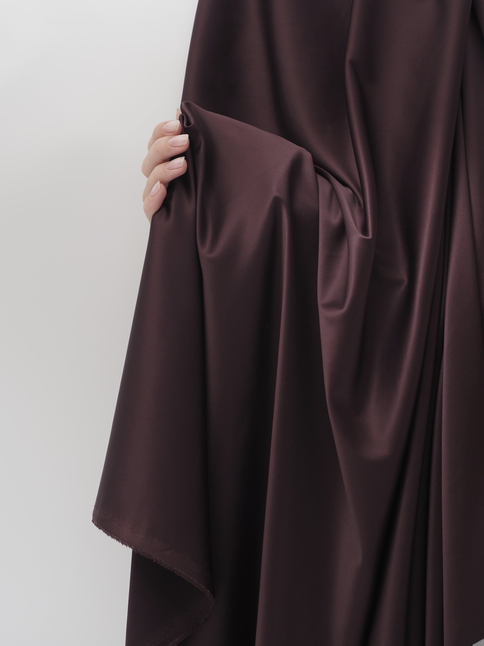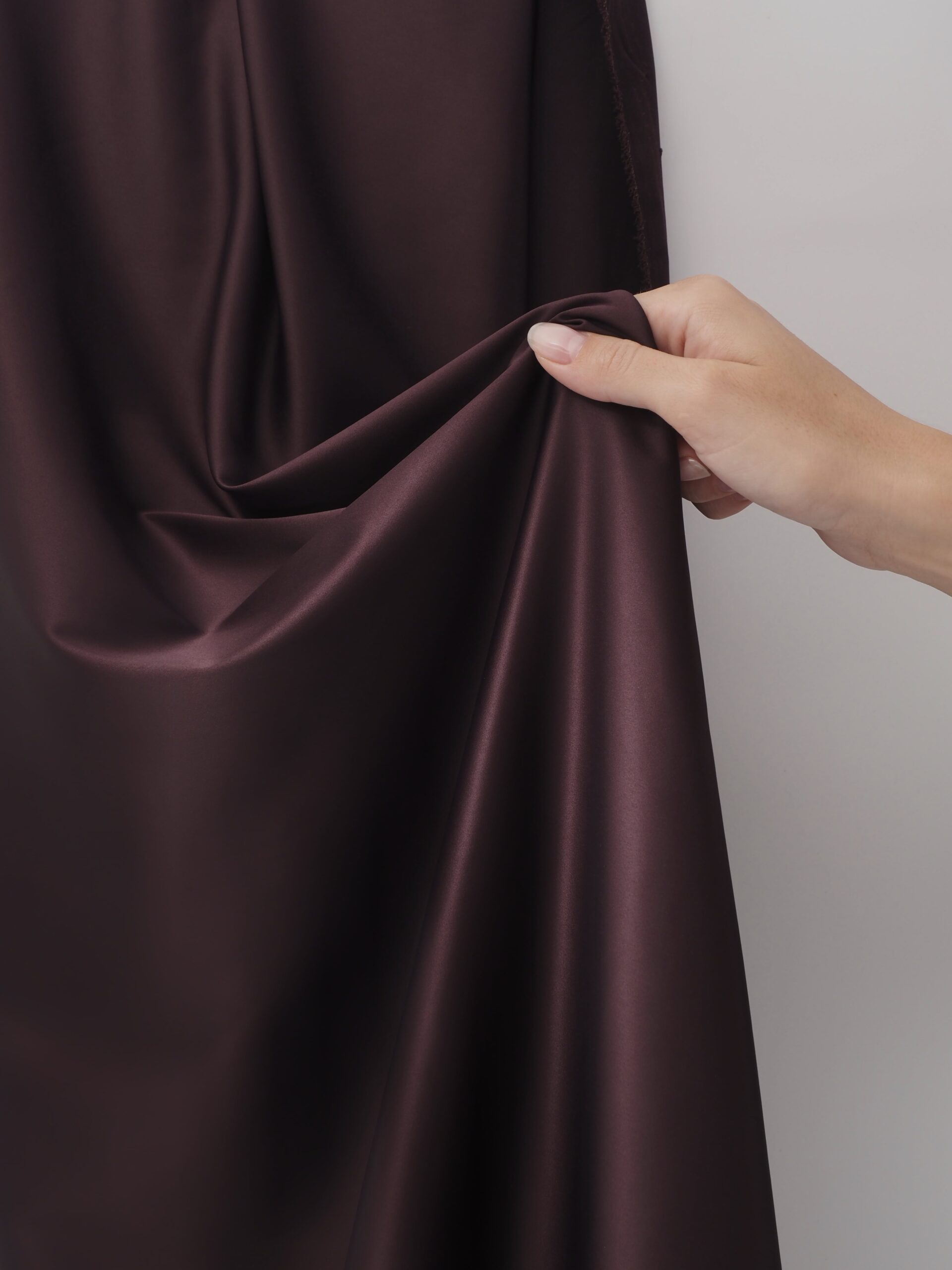 Атлас стрейч горький шоколад - лёгкая, приятная к телу ткань, основа состава это полиэстер и эластан. Ткань тянется по утку (поперечное сечение). Сатин очень тонкий, но при этом имеет достаточную плотность, что делает его упругим. Ткань хорошо "дышит", отводит влагу, а при низких температурах не холодит тело. Атлас эластичный, практичный, медленно изнашивается, не даёт усадку. Подходит для пошива купальников, нижнего белья, вечерних платьев, платков и другой повседневной одежды.
