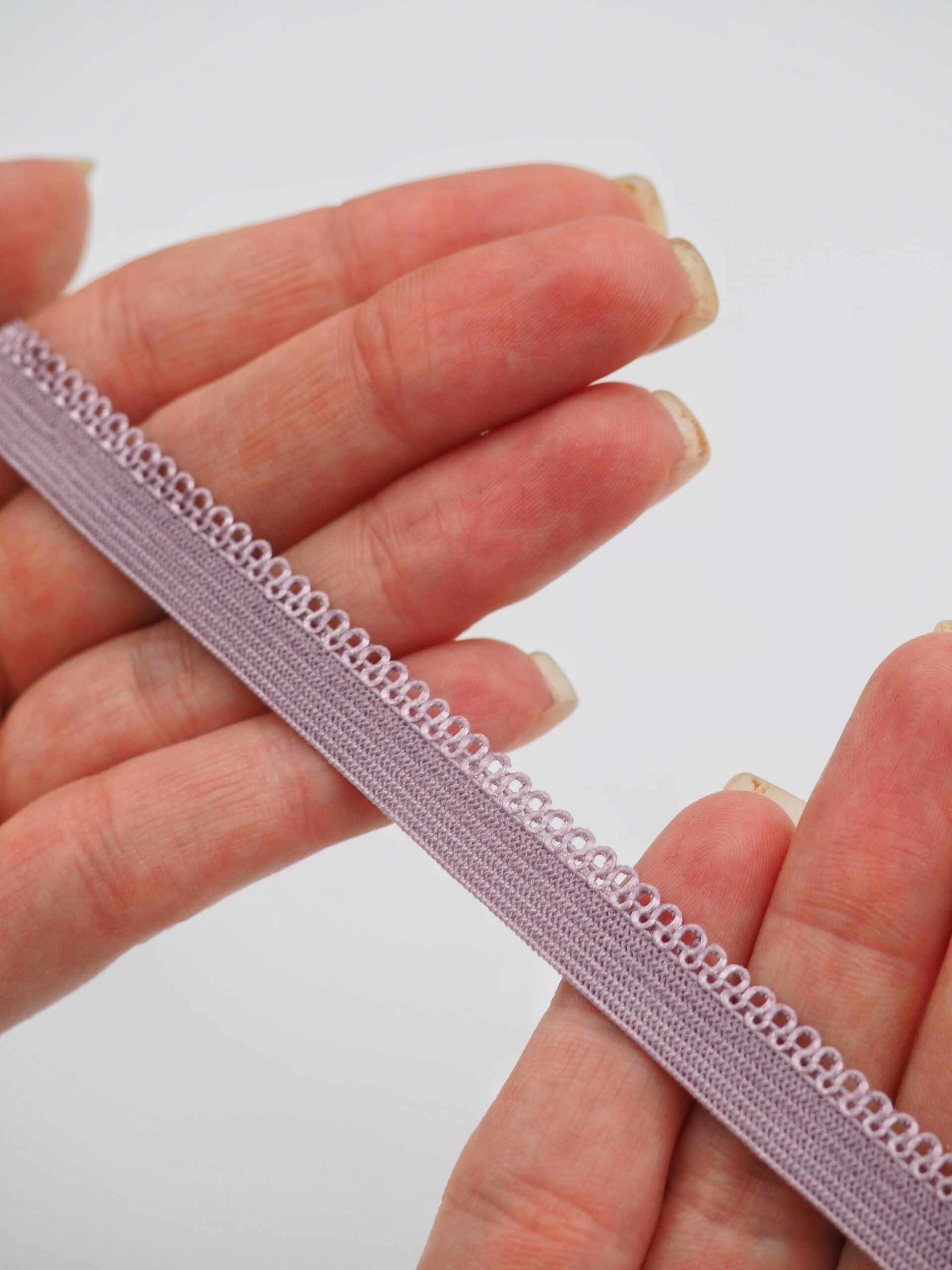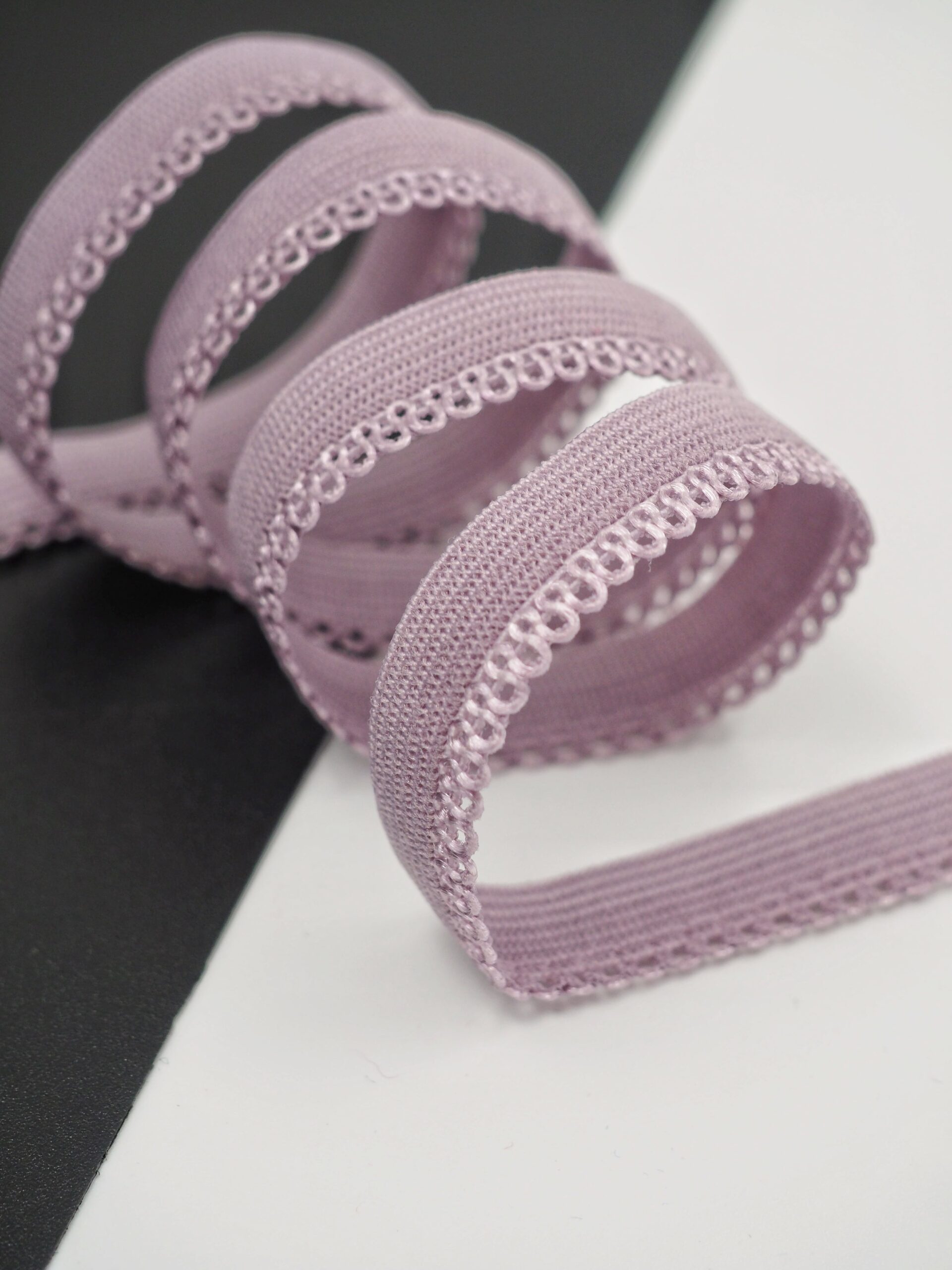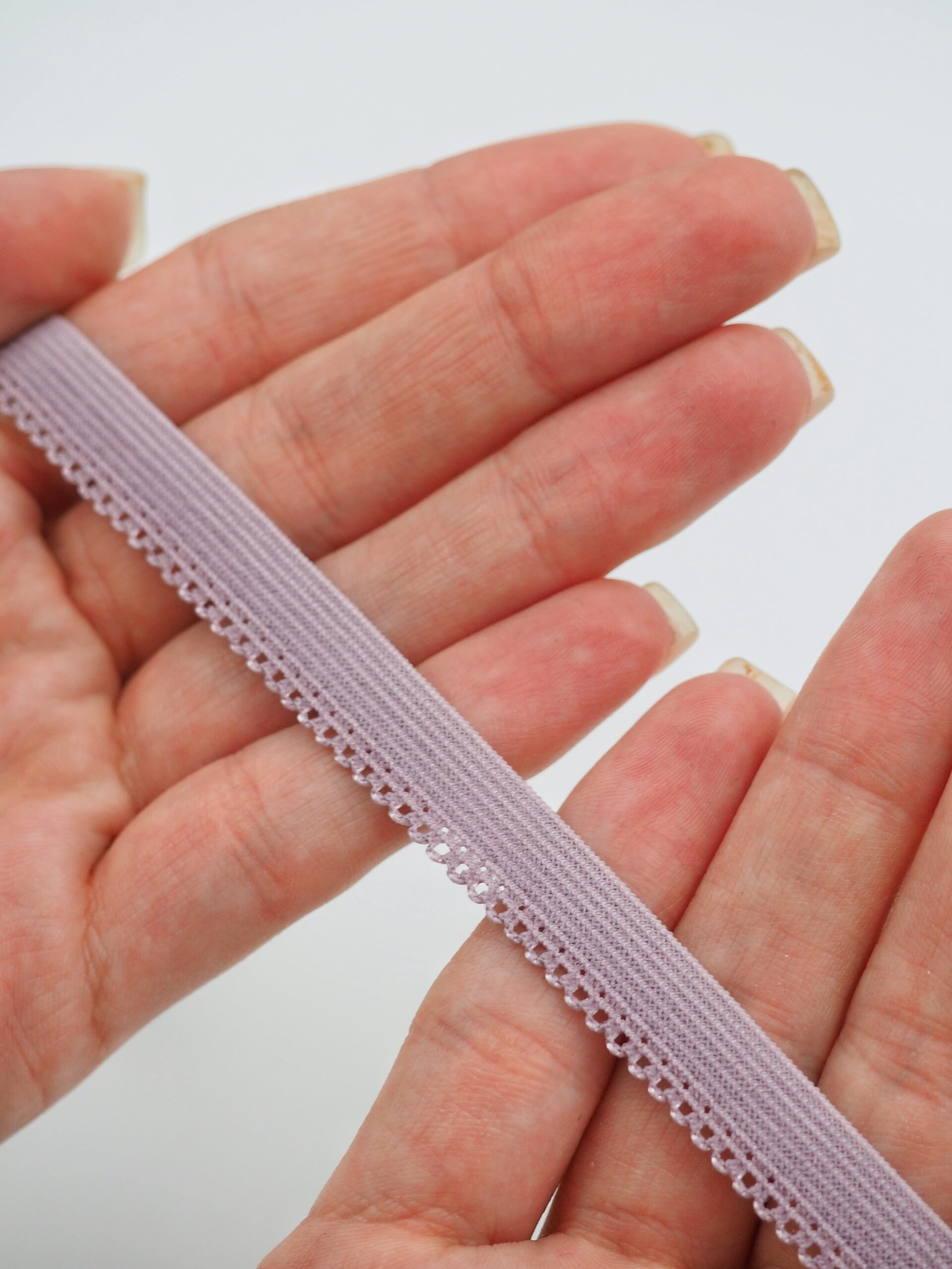 Резинка бельевая отделочная ажурная тонкая фиолетового оттенка. Лента эластичная тонкая морской туман.