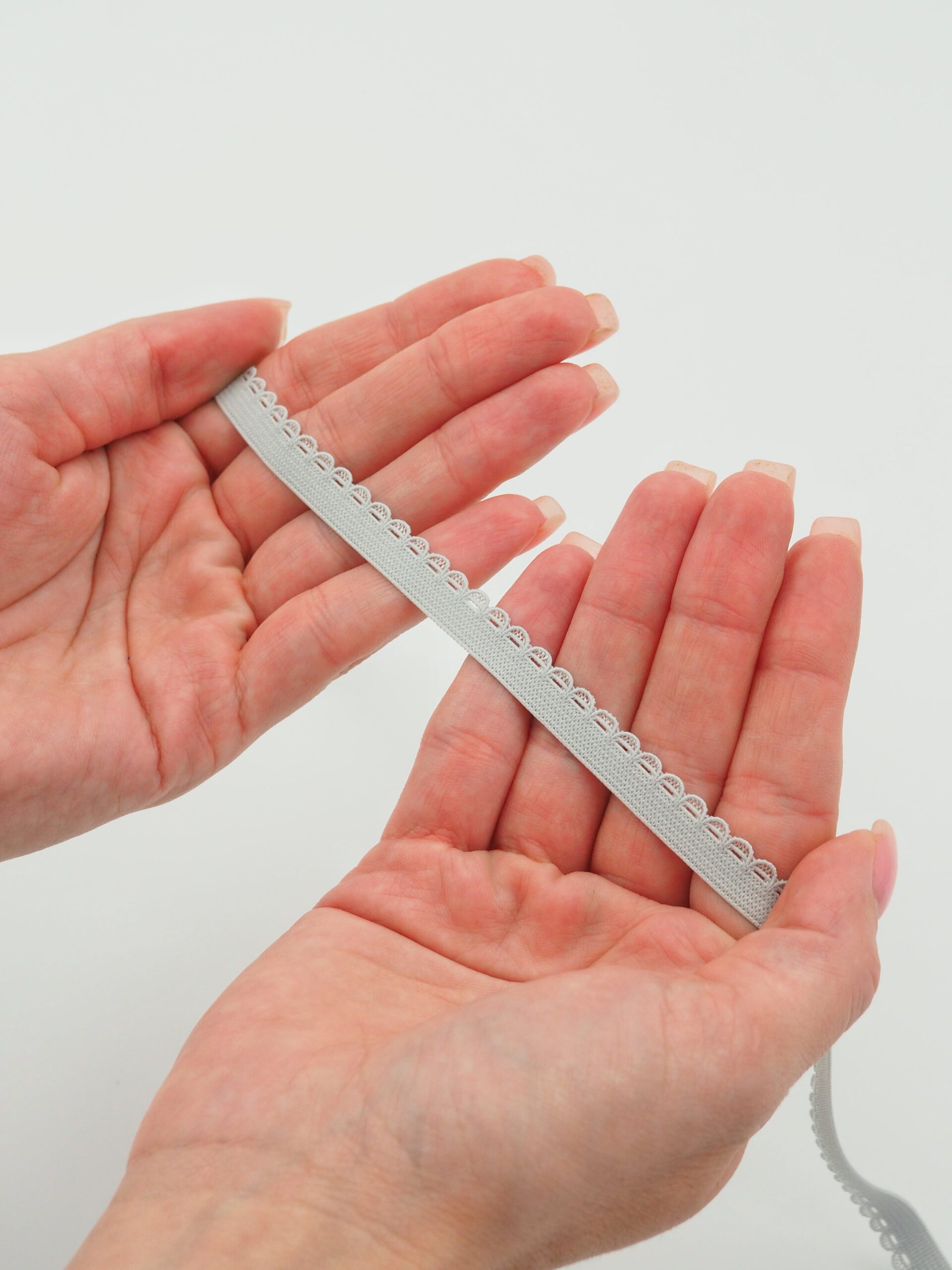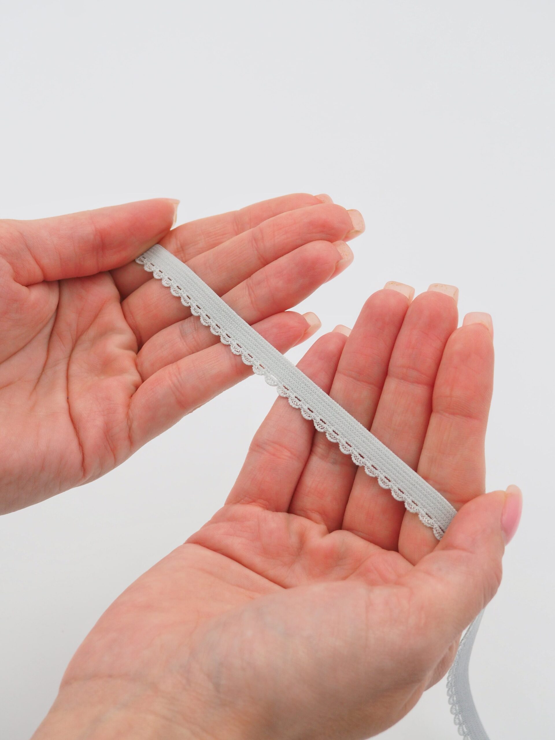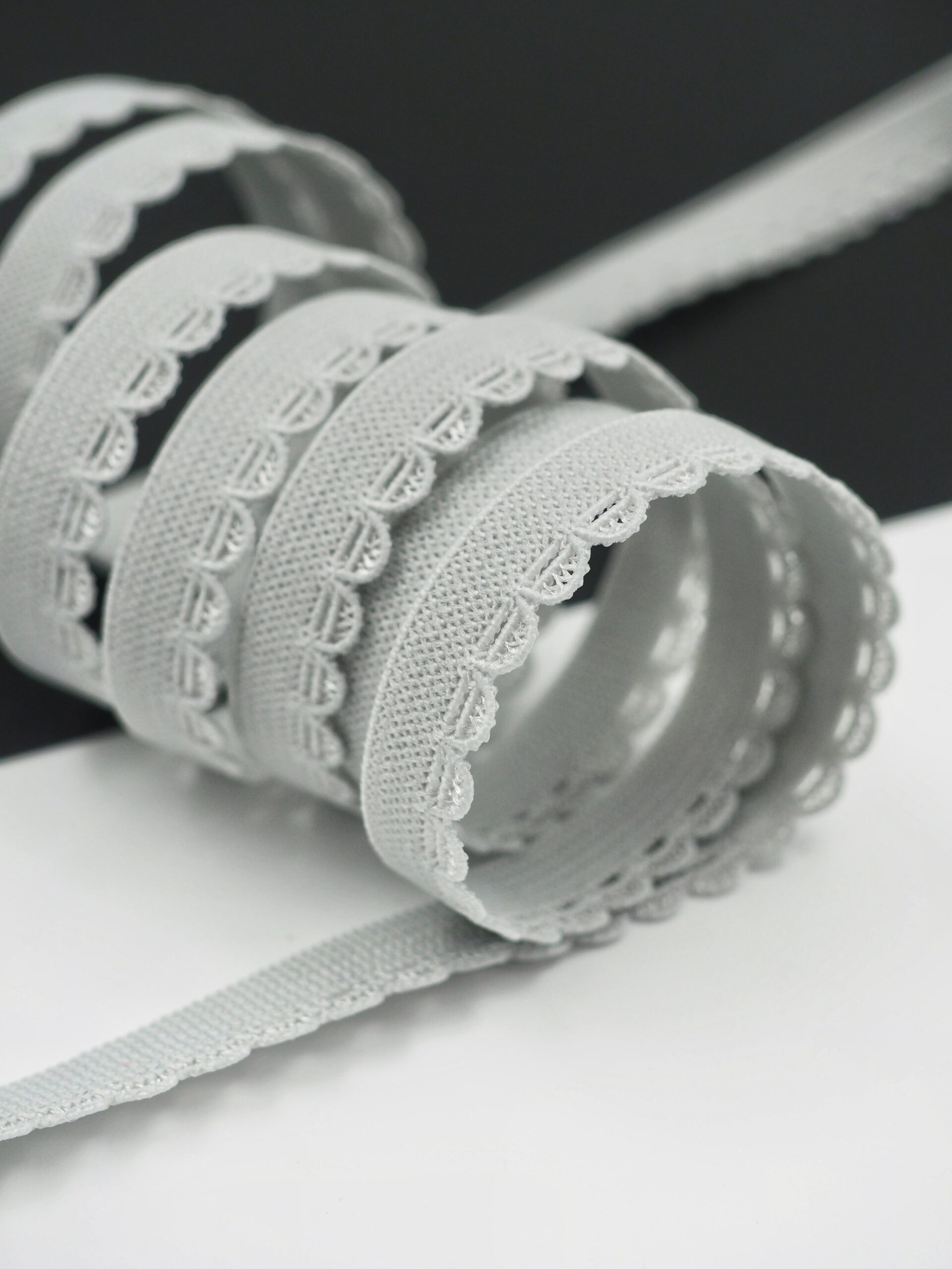 Резинка бельевая отделочная ажурная тонкая серого оттенка. Лента эластичная тонкая светло-серая.