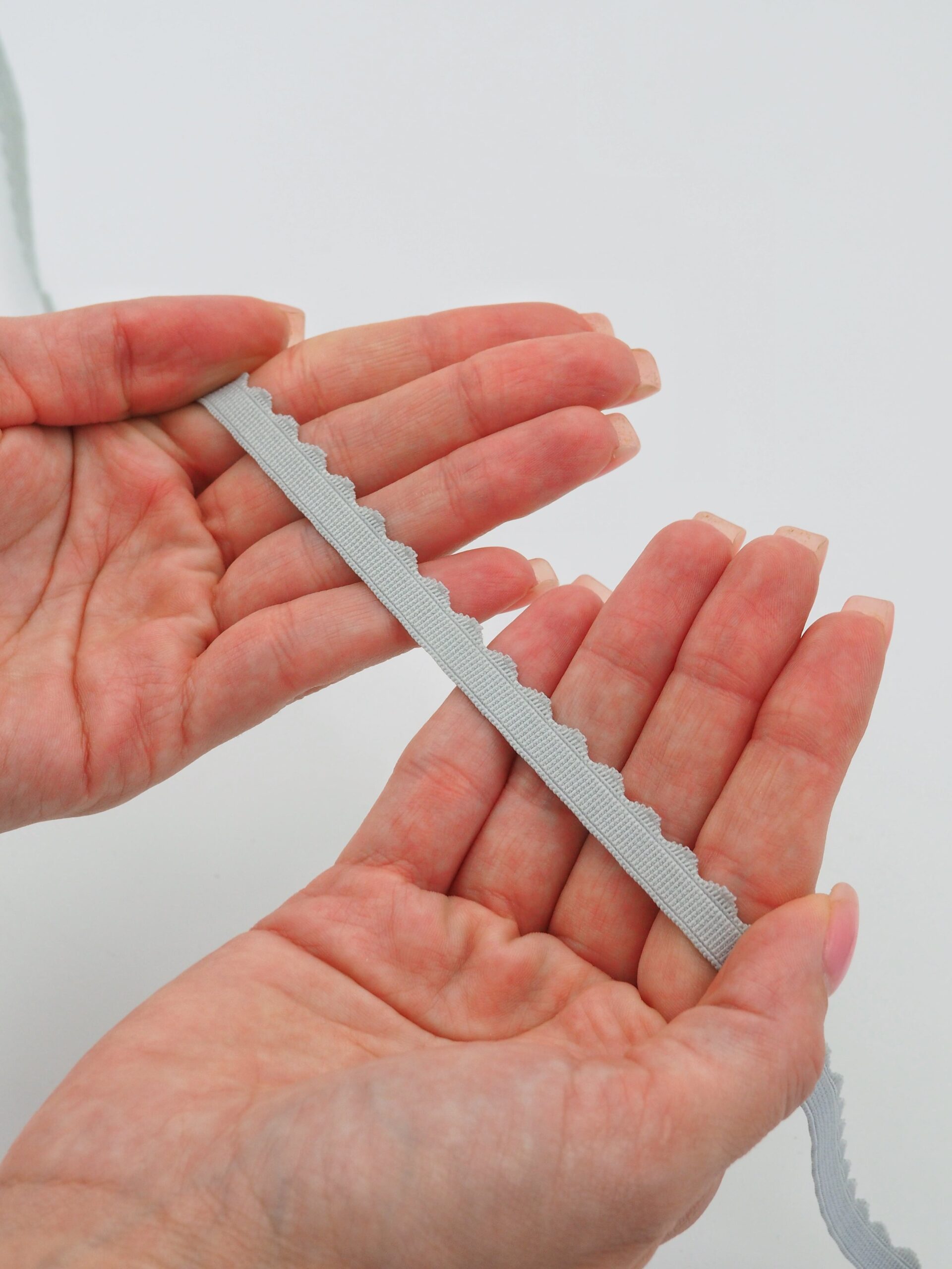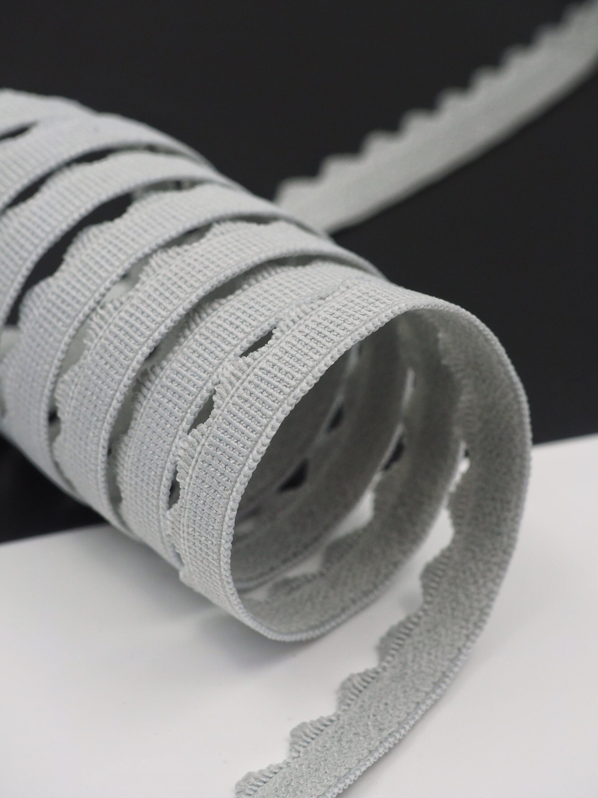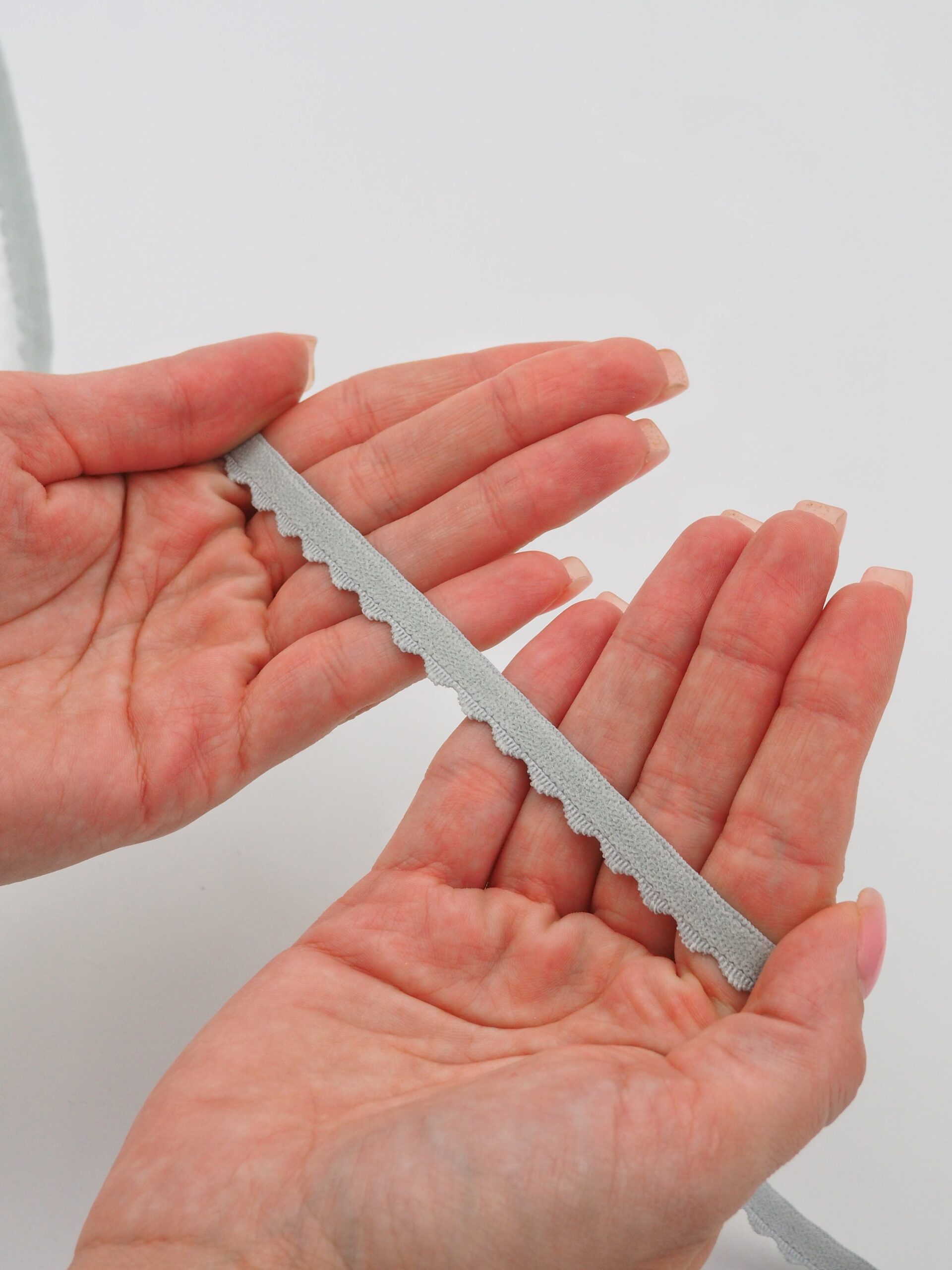 Резинка бельевая отделочная ажурная тонкая серого оттенка. Лента эластичная тонкая светло-серая.