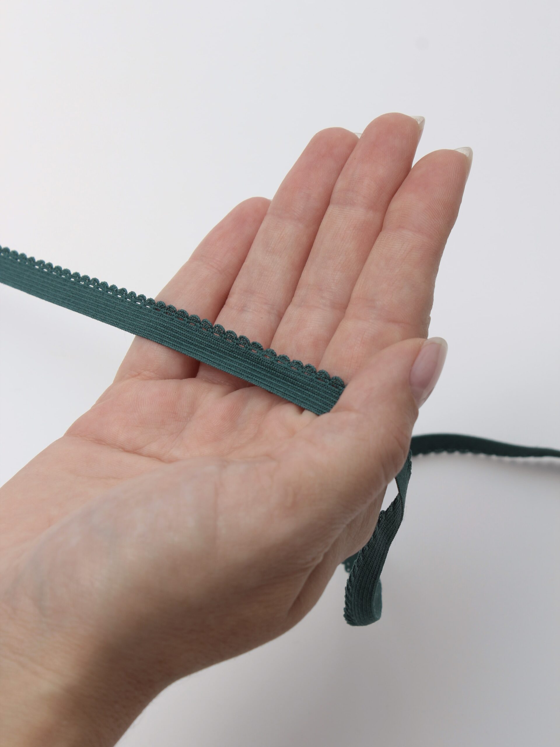 Резинка бельевая отделочная ажурная тонкая зеленого оттенка. Лента эластичная тонкая темно-зеленая.