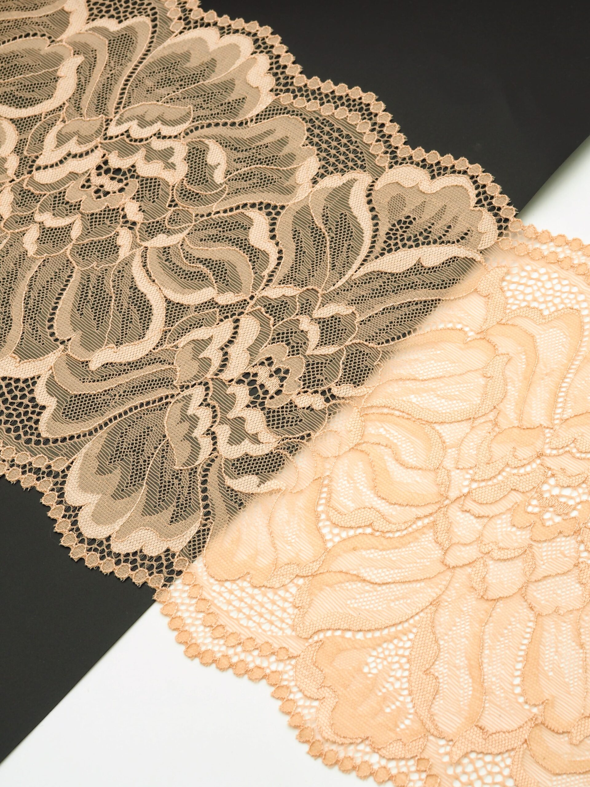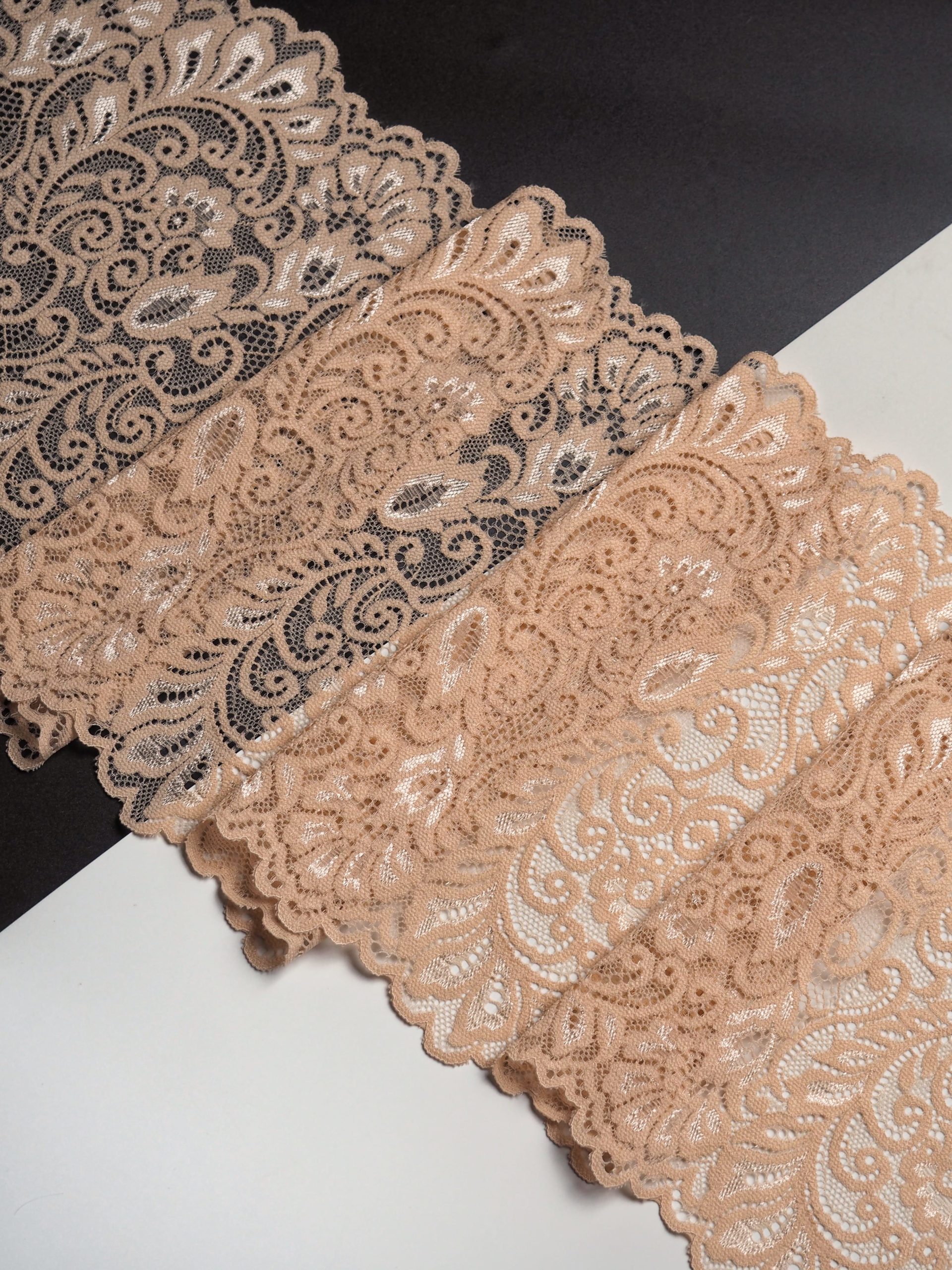 Эластичное кружево бежевое используется для изготовления разнообразной одежды и предметов декора. Данный материал, как правило, хорошо сохраняет форму, но при этом неплохо тянется. Такие свойства делают его действительно универсальным в применении. Кружево стрейч можно использовать для пошива нижнего белья, чулков, сценических костюмов, элементов декора. С материалом достаточно просто работать - не только профессионалам, но и новичкам.