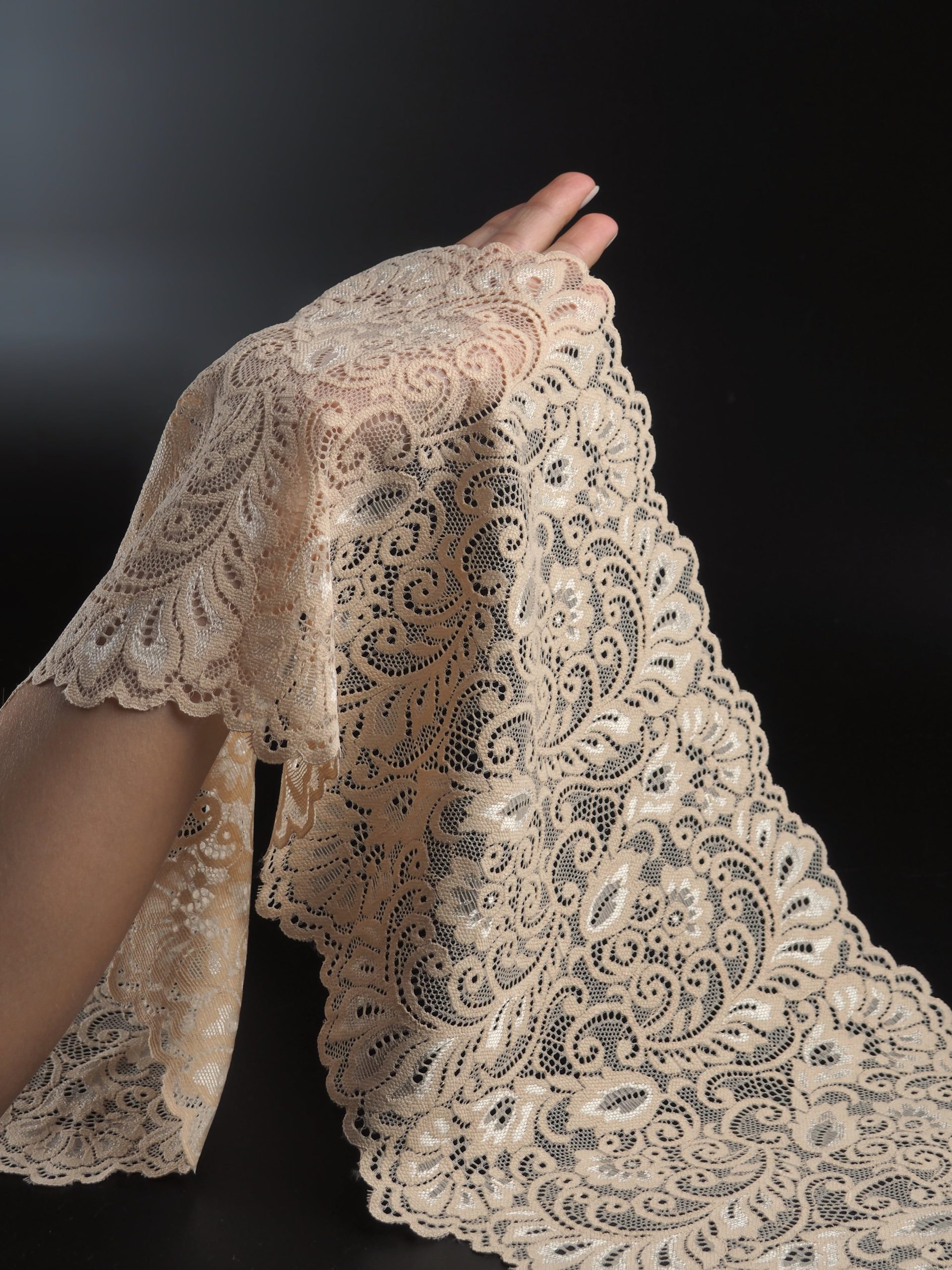 Кружево эластичное бежевого цвета. Стрейч кружево бежевое с цветочным рисунком.