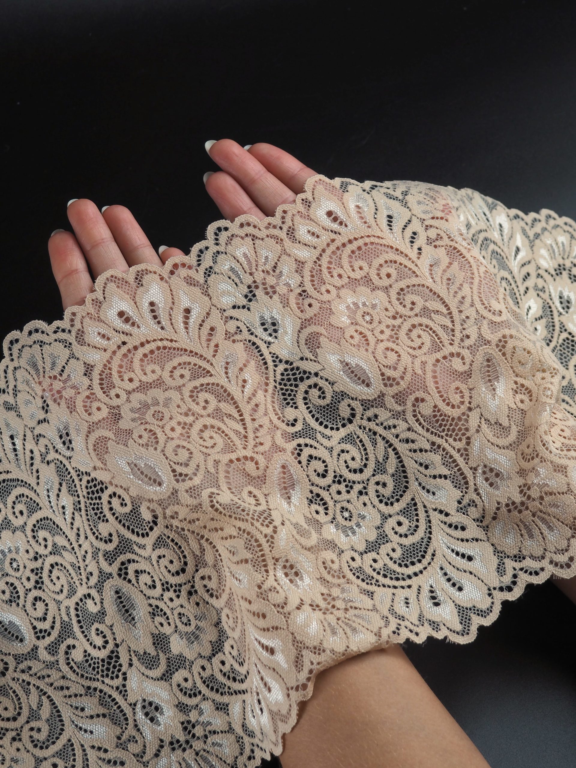 Эластичное кружево бежевое используется для изготовления разнообразной одежды и предметов декора. Данный материал, как правило, хорошо сохраняет форму, но при этом неплохо тянется. Такие свойства делают его действительно универсальным в применении. Кружево стрейч можно использовать для пошива нижнего белья, чулков, сценических костюмов, элементов декора. С материалом достаточно просто работать - не только профессионалам, но и новичкам.