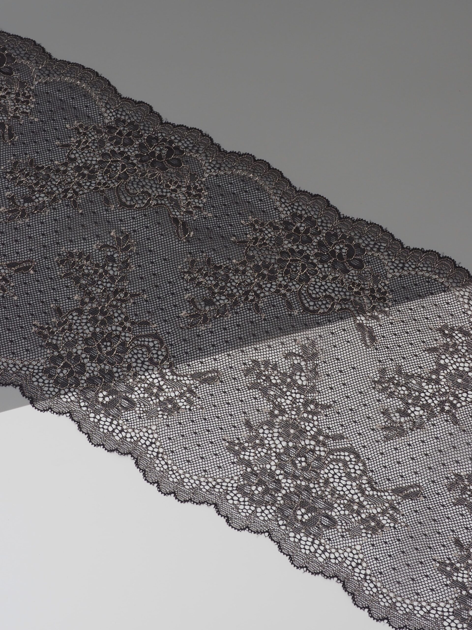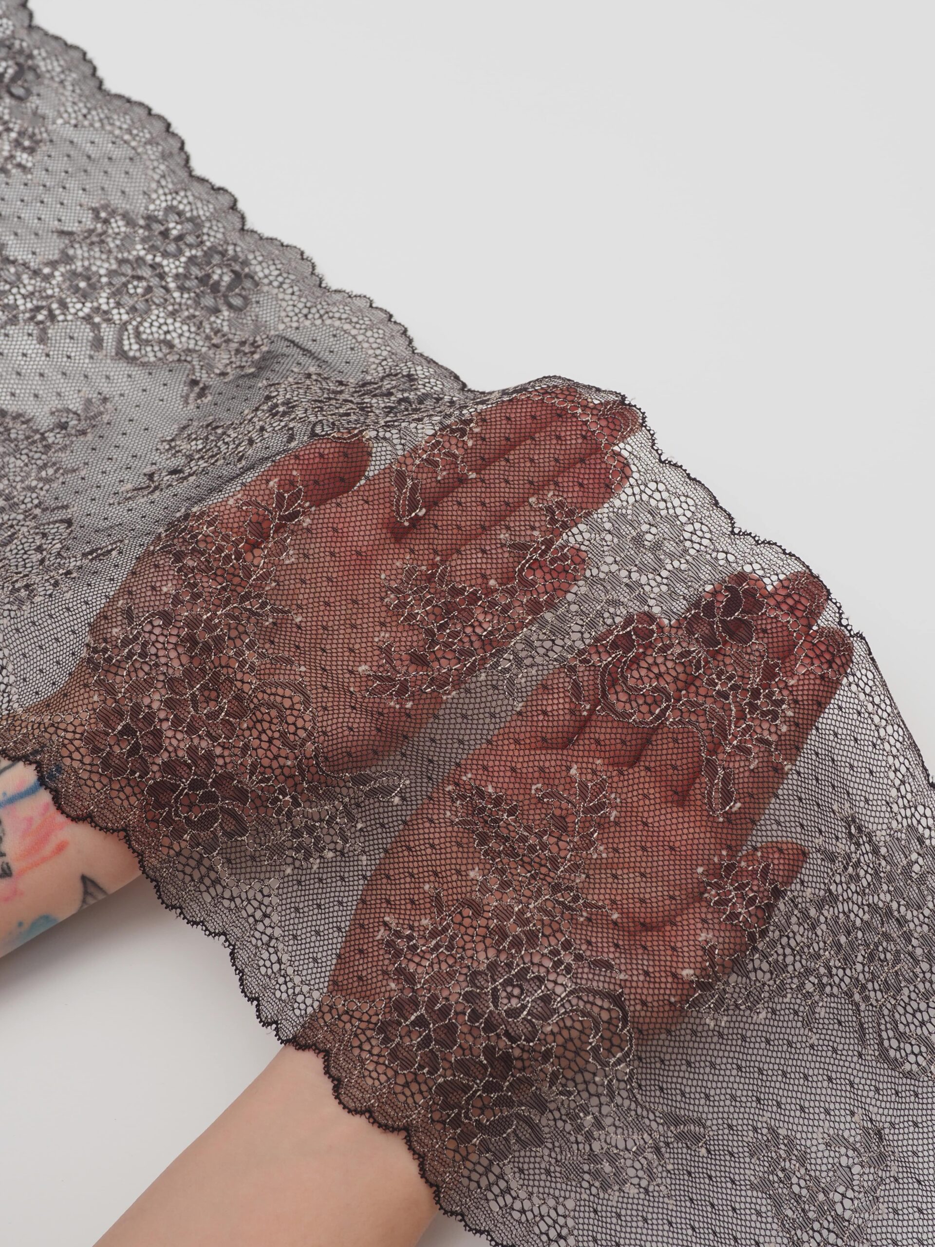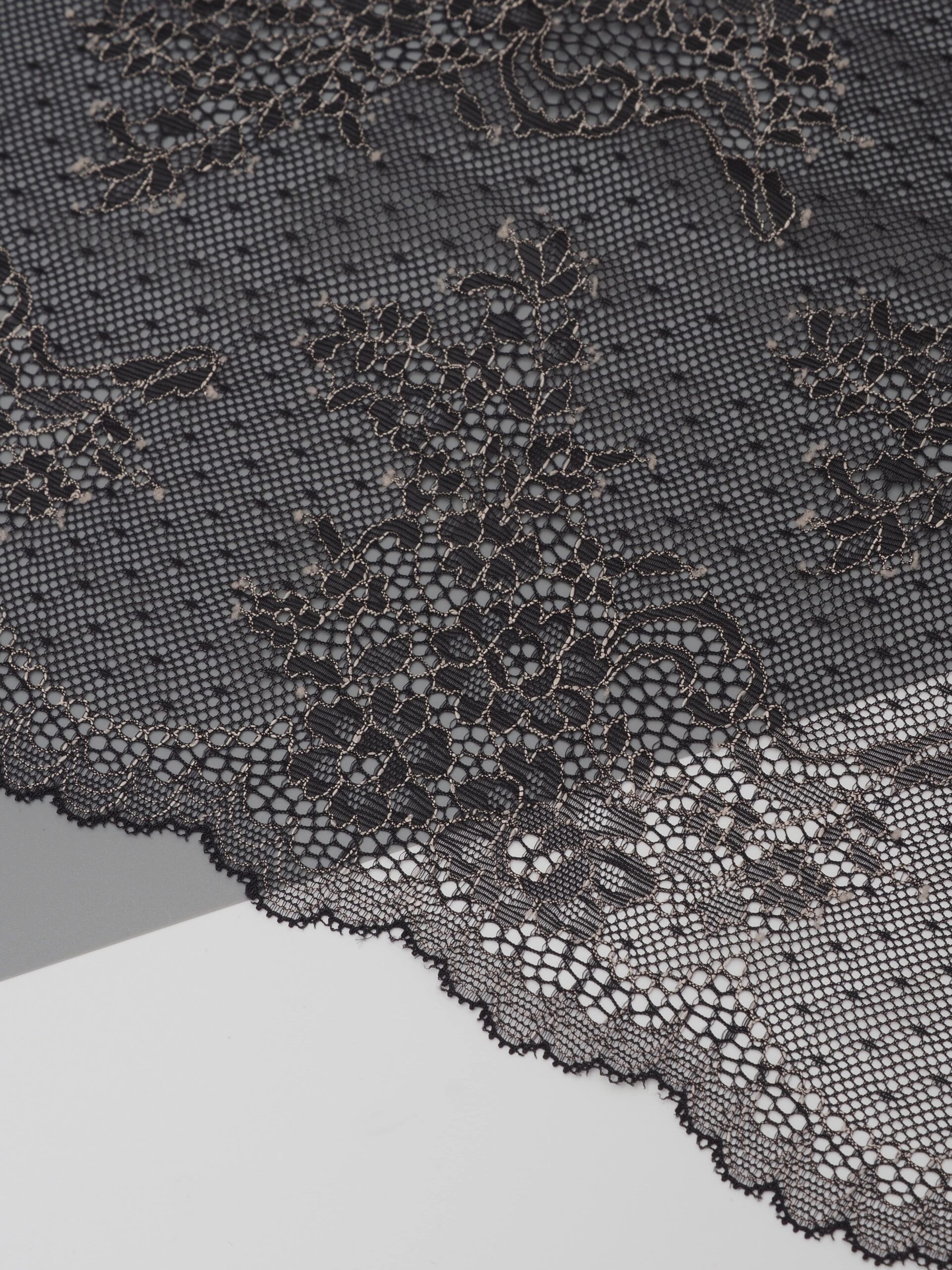 Кружево эластичное черного цвета с бежевой нитью. Стрейч кружево черное с бежевым узорчатым рисунком.