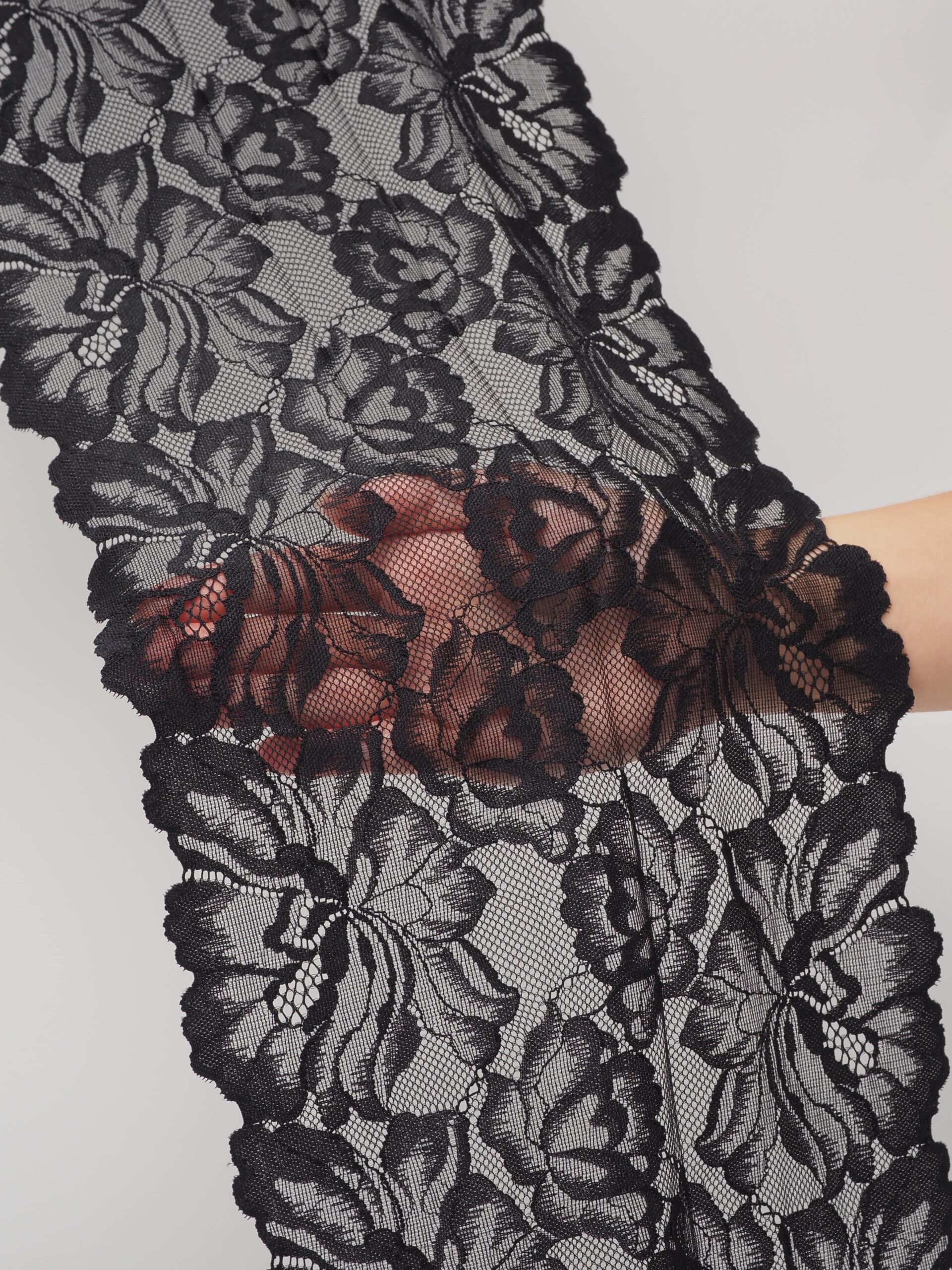 Кружево эластичное черного цвета. Стрейч кружево черного оттенка с цветочным рисунком.