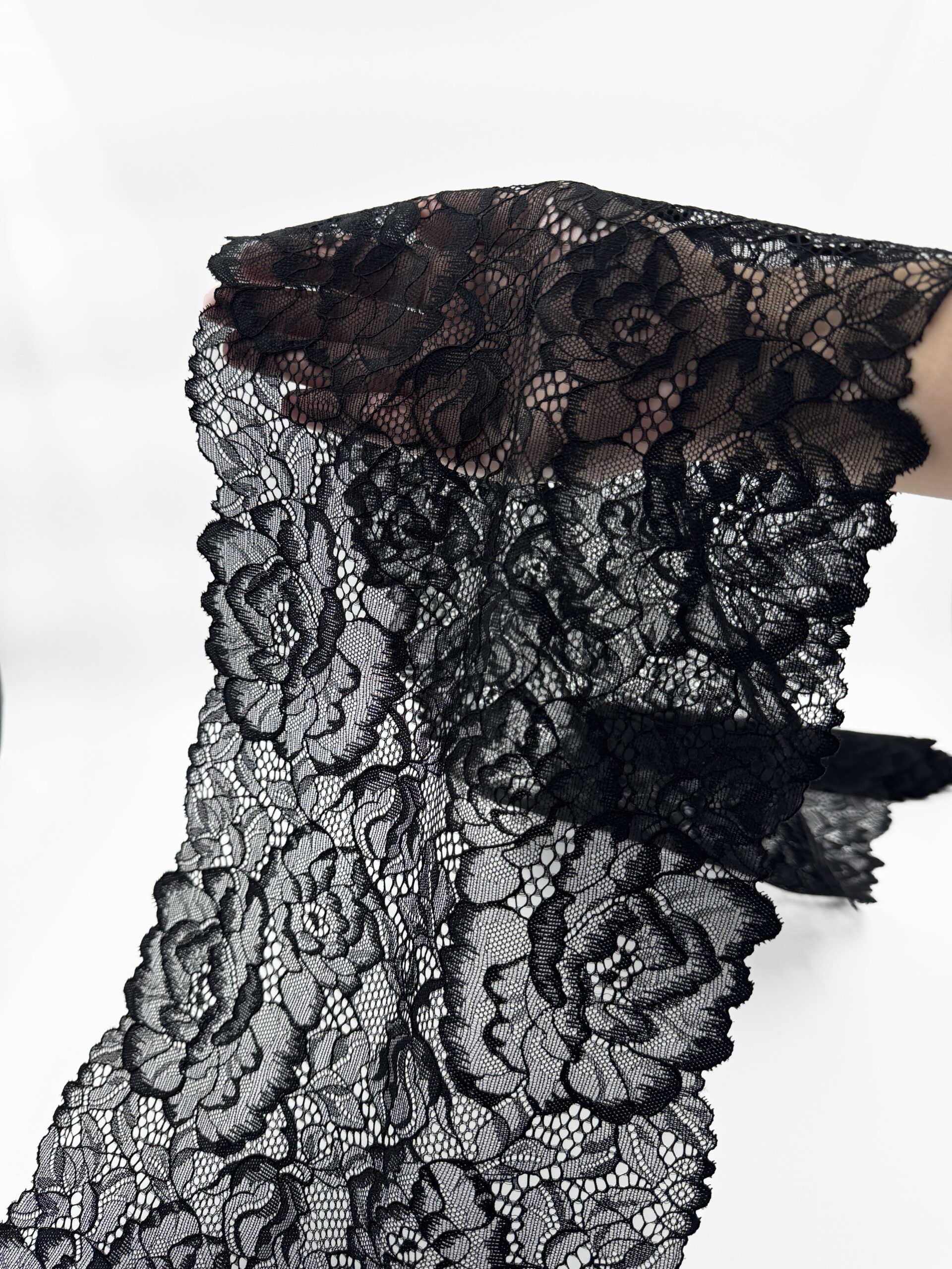 Кружево эластичное черное. Кружево стрейч черное с цветочным рисунком.