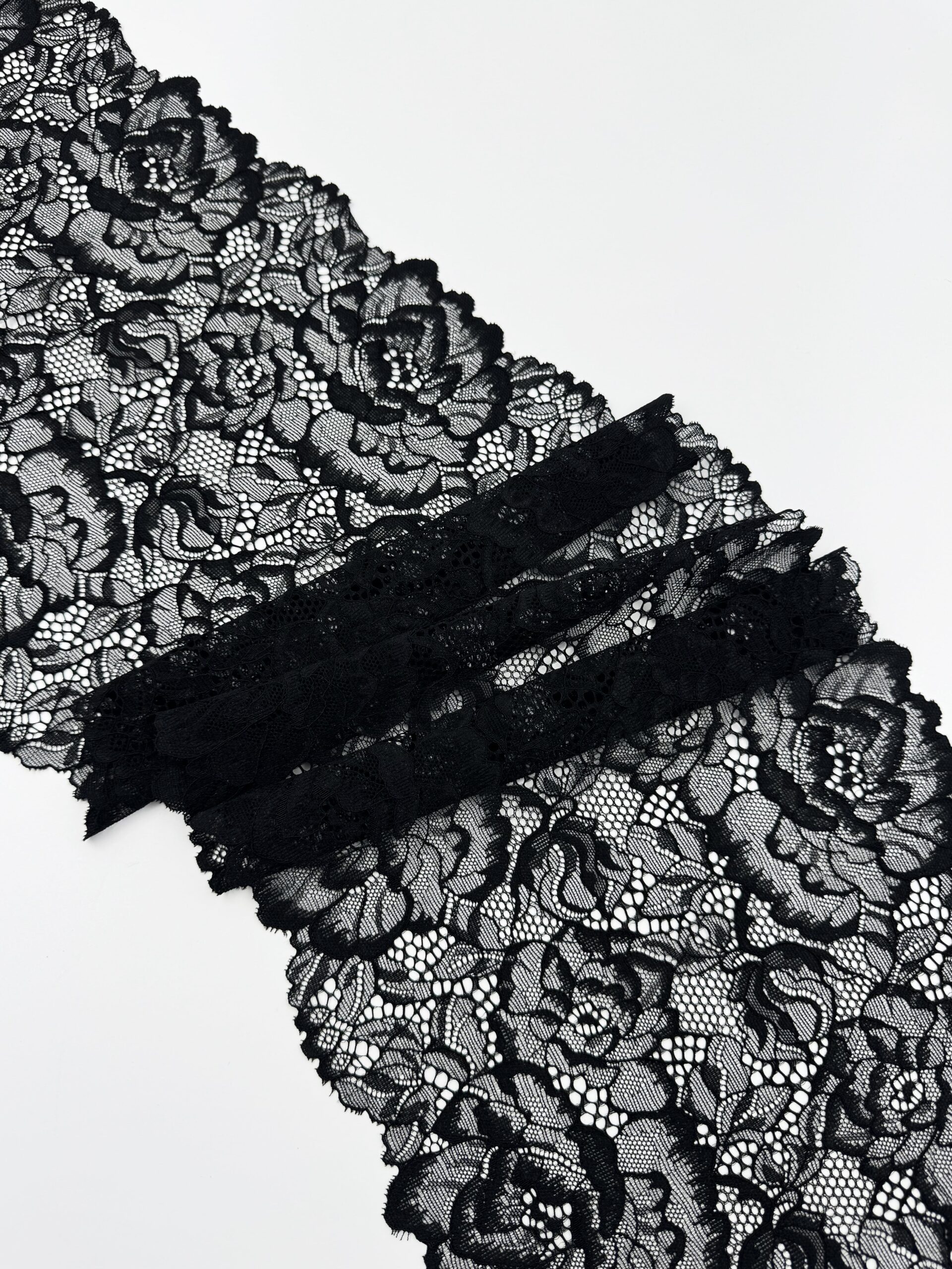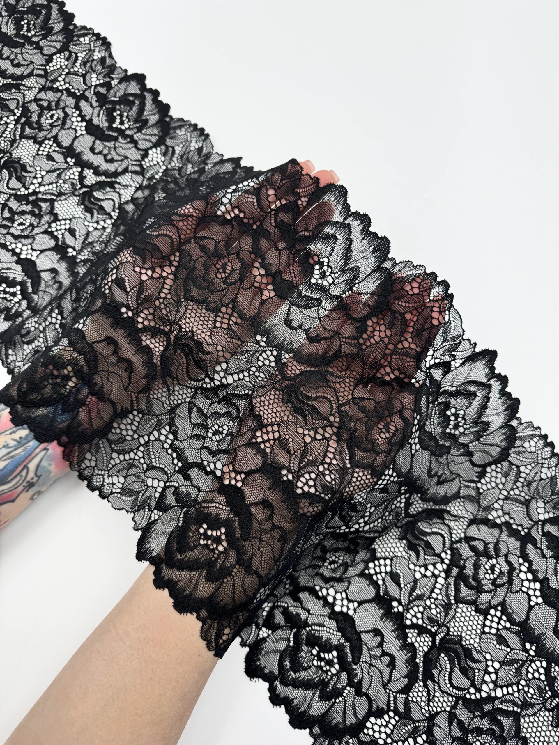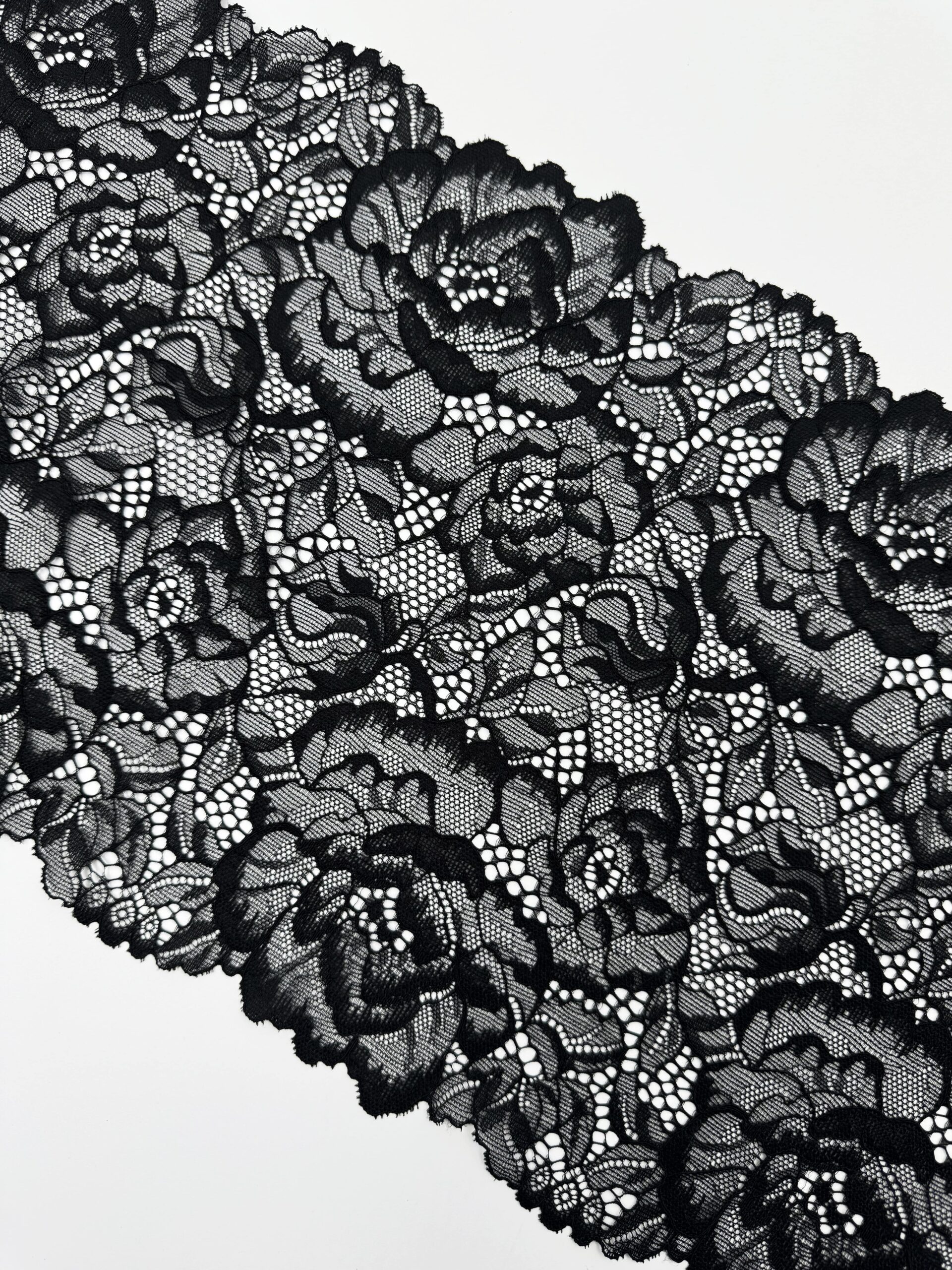 Кружево эластичное черное. Кружево стрейч черное с цветочным рисунком.