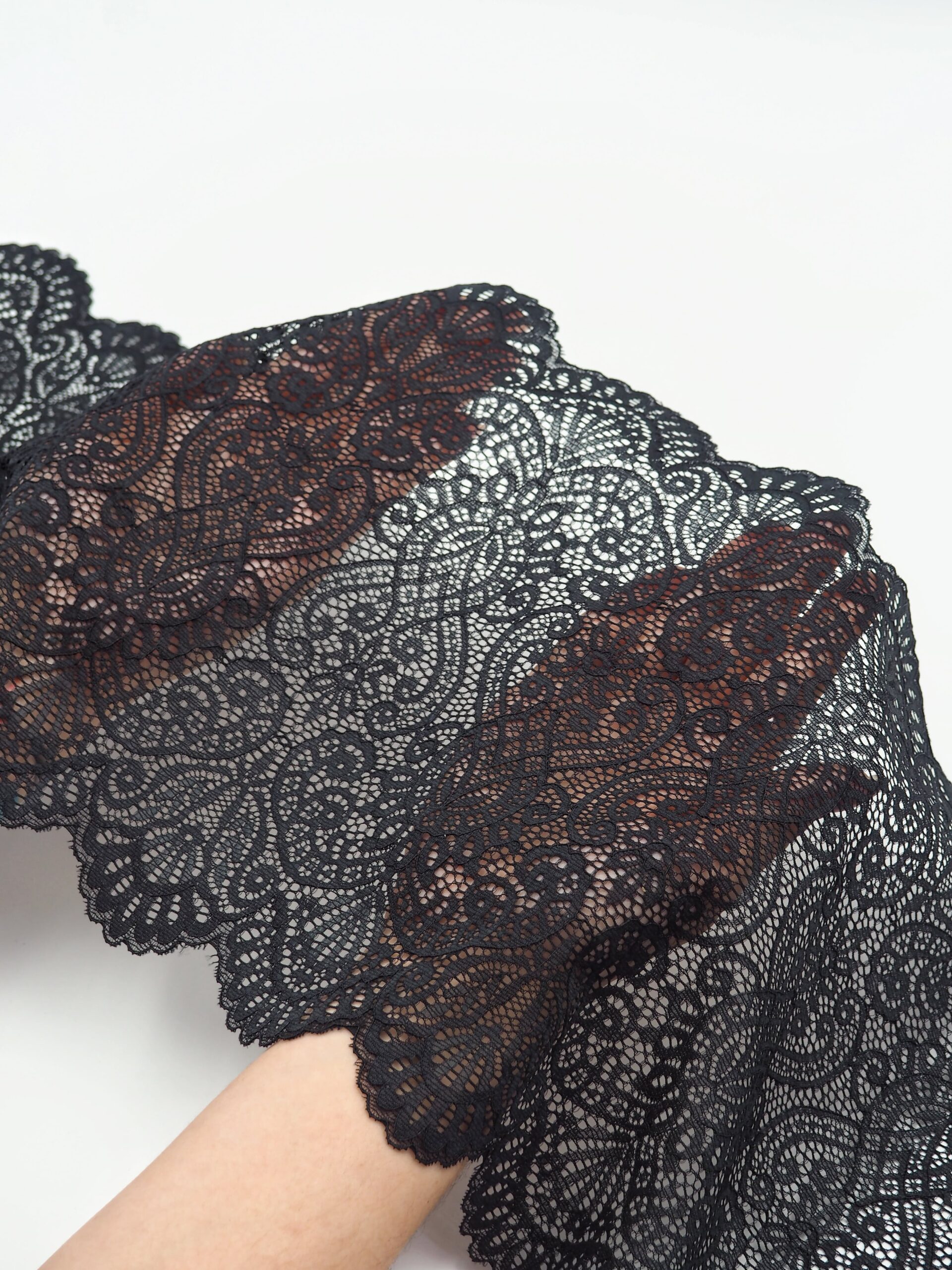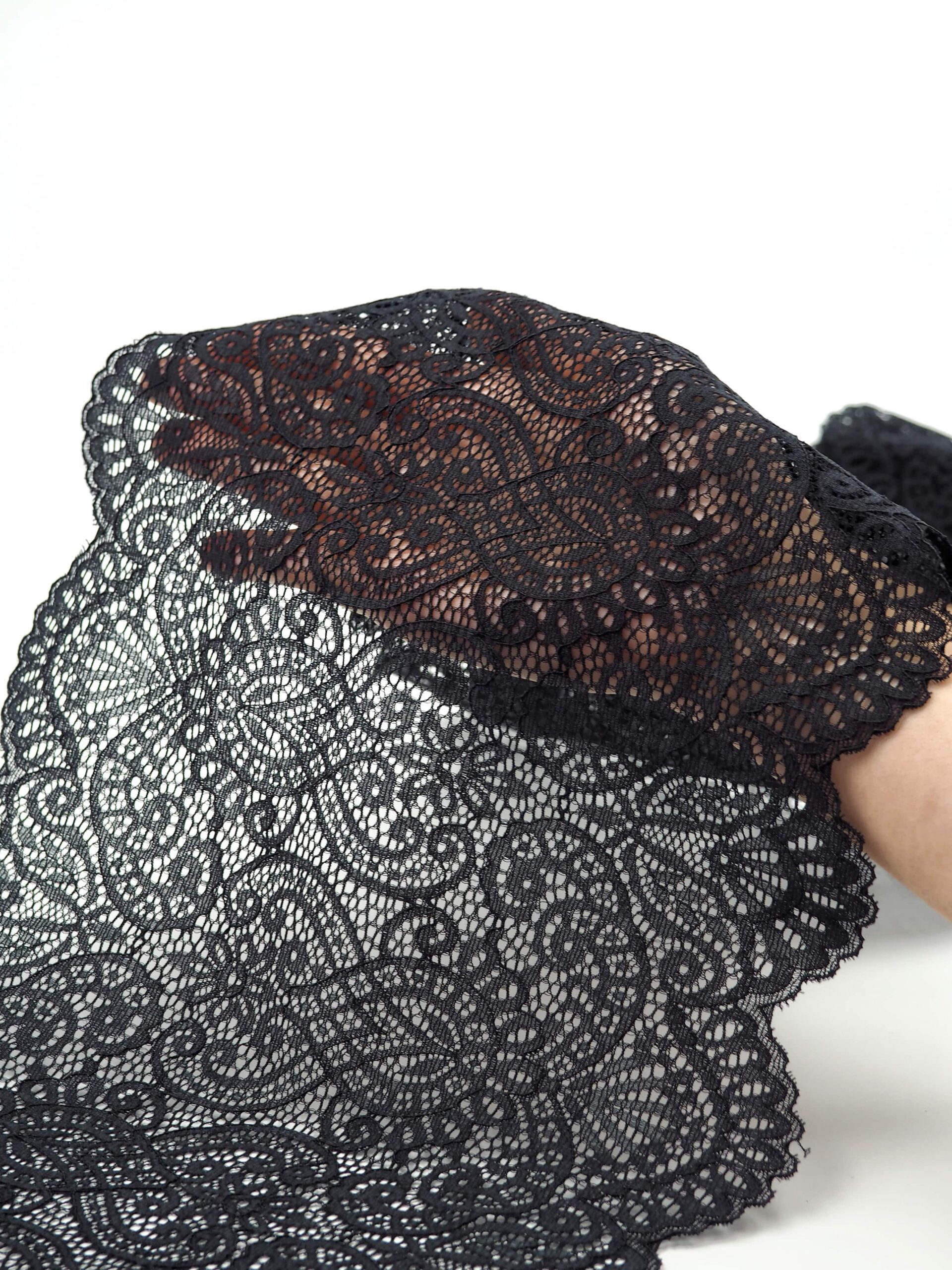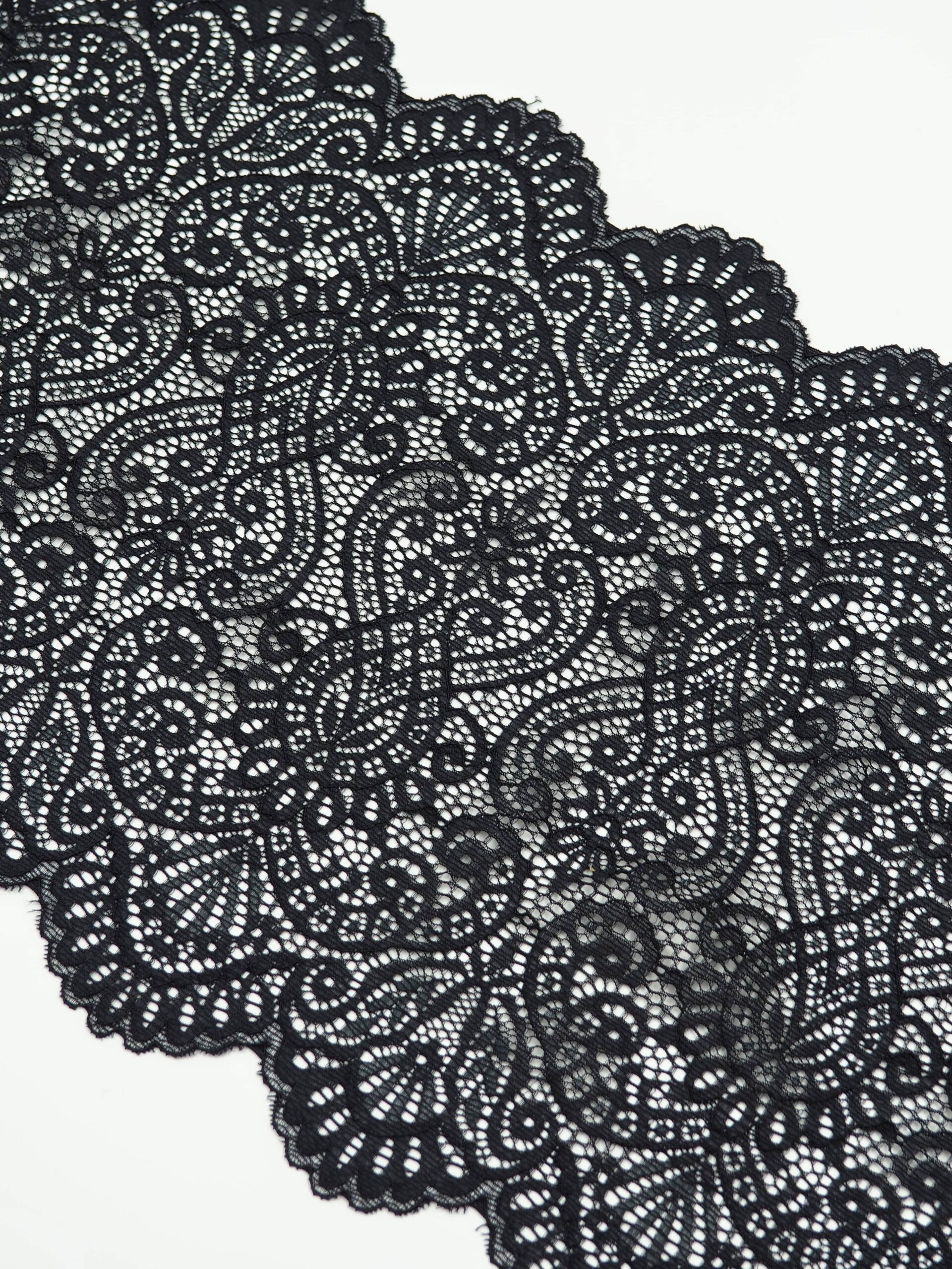 Кружево эластичное черного цвета. Стрейч кружево черное с узорчатым рисунком.