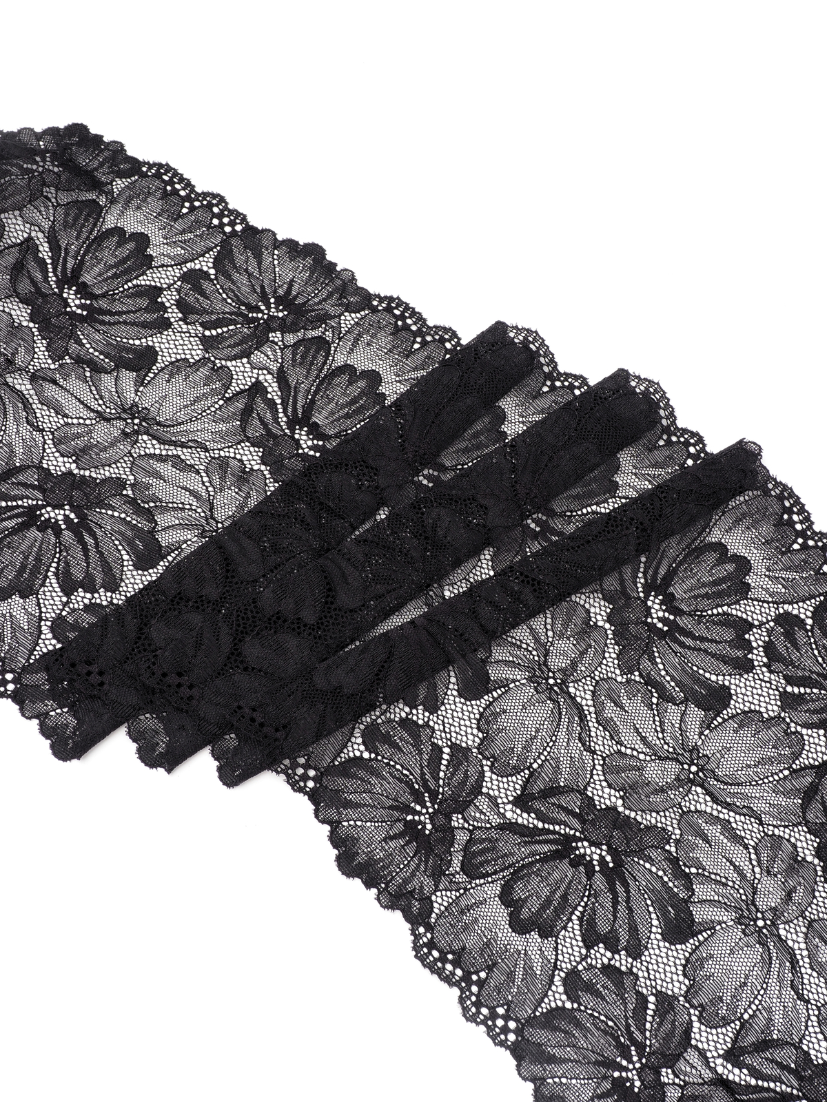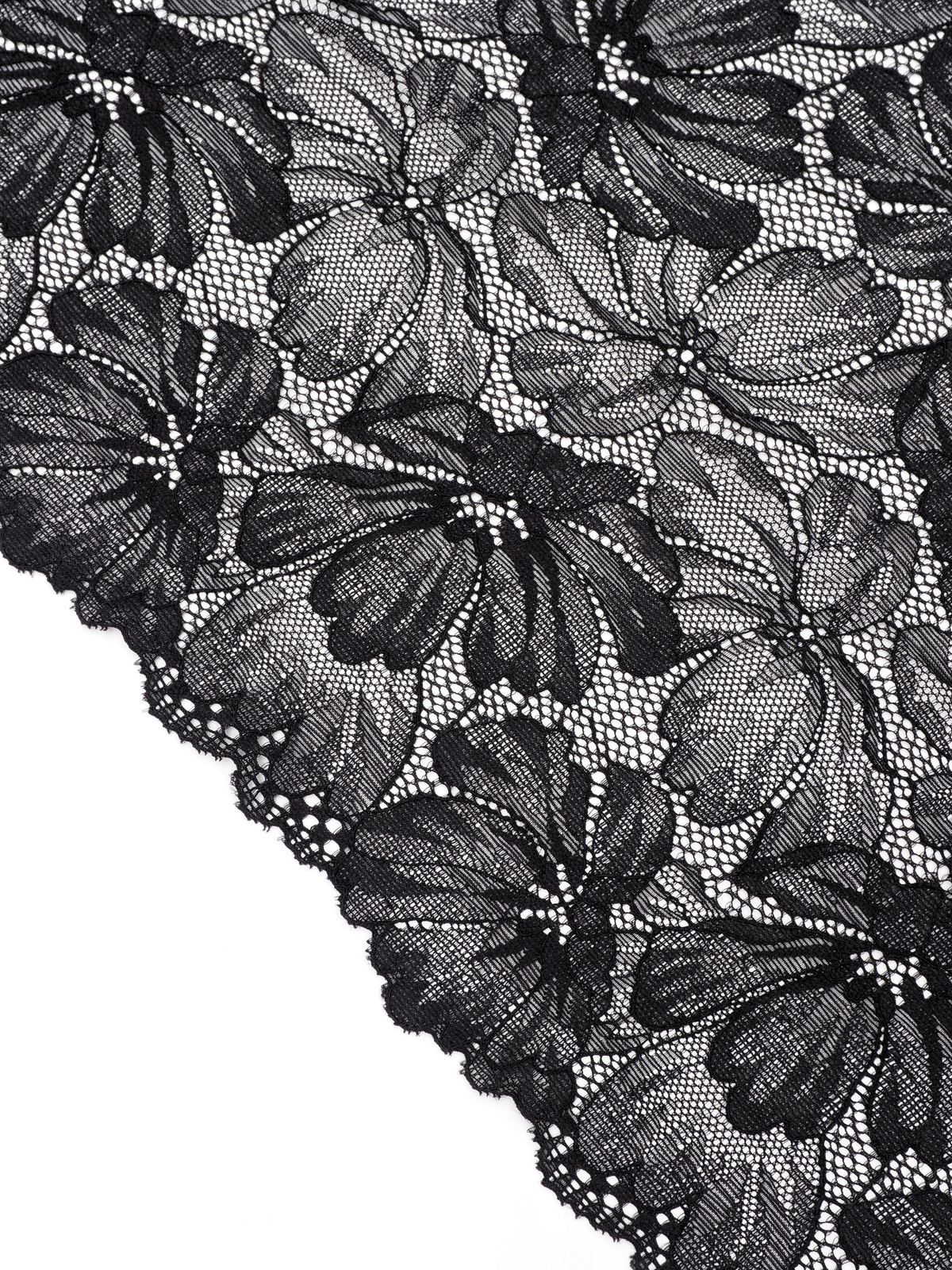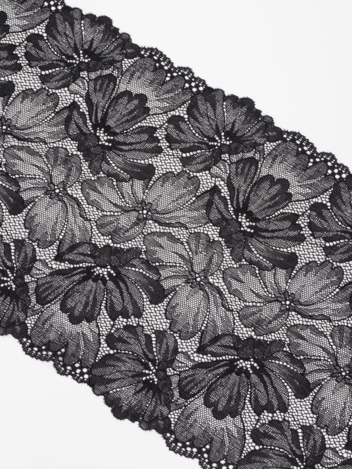 Изысканное стрейч кружево в черном цвете станет идеальным выбором для создания роскошного нижнего белья. Ширина полотна позволяет использовать материал как для декоративных элементов, так и для основного кроя.