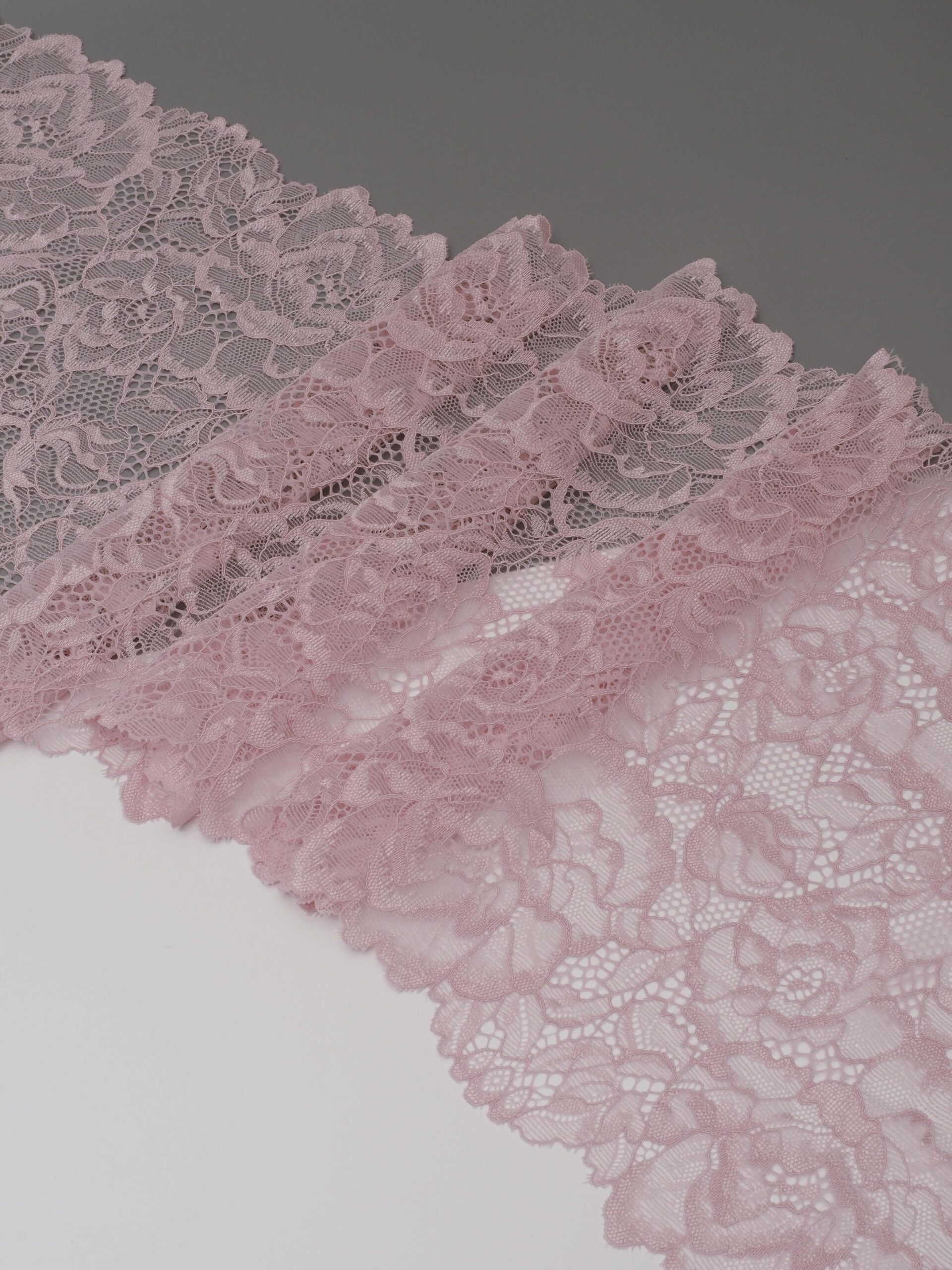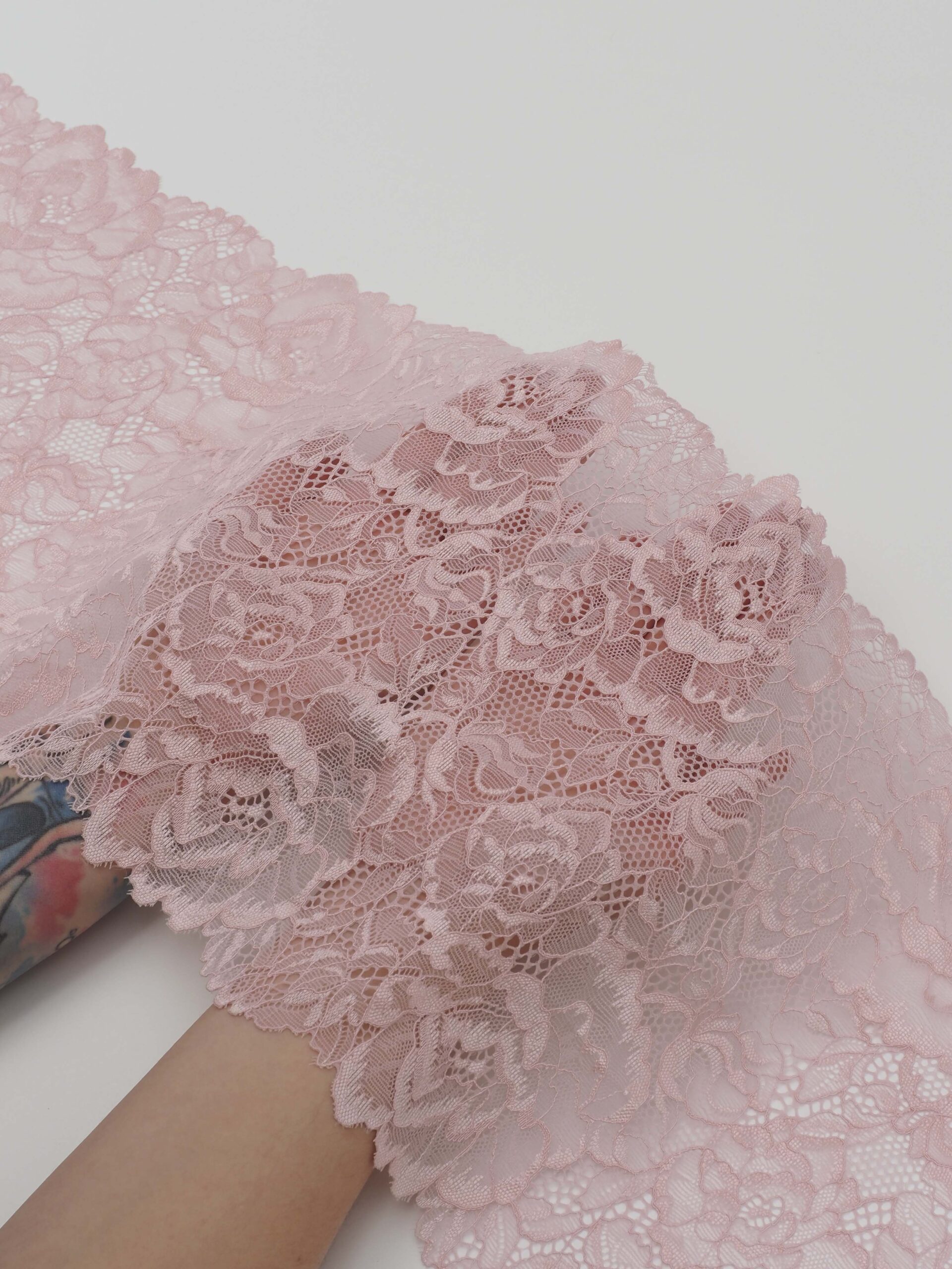 Кружево эластичное пудровое. Кружево стрейч пудровое с цветочным рисунком.