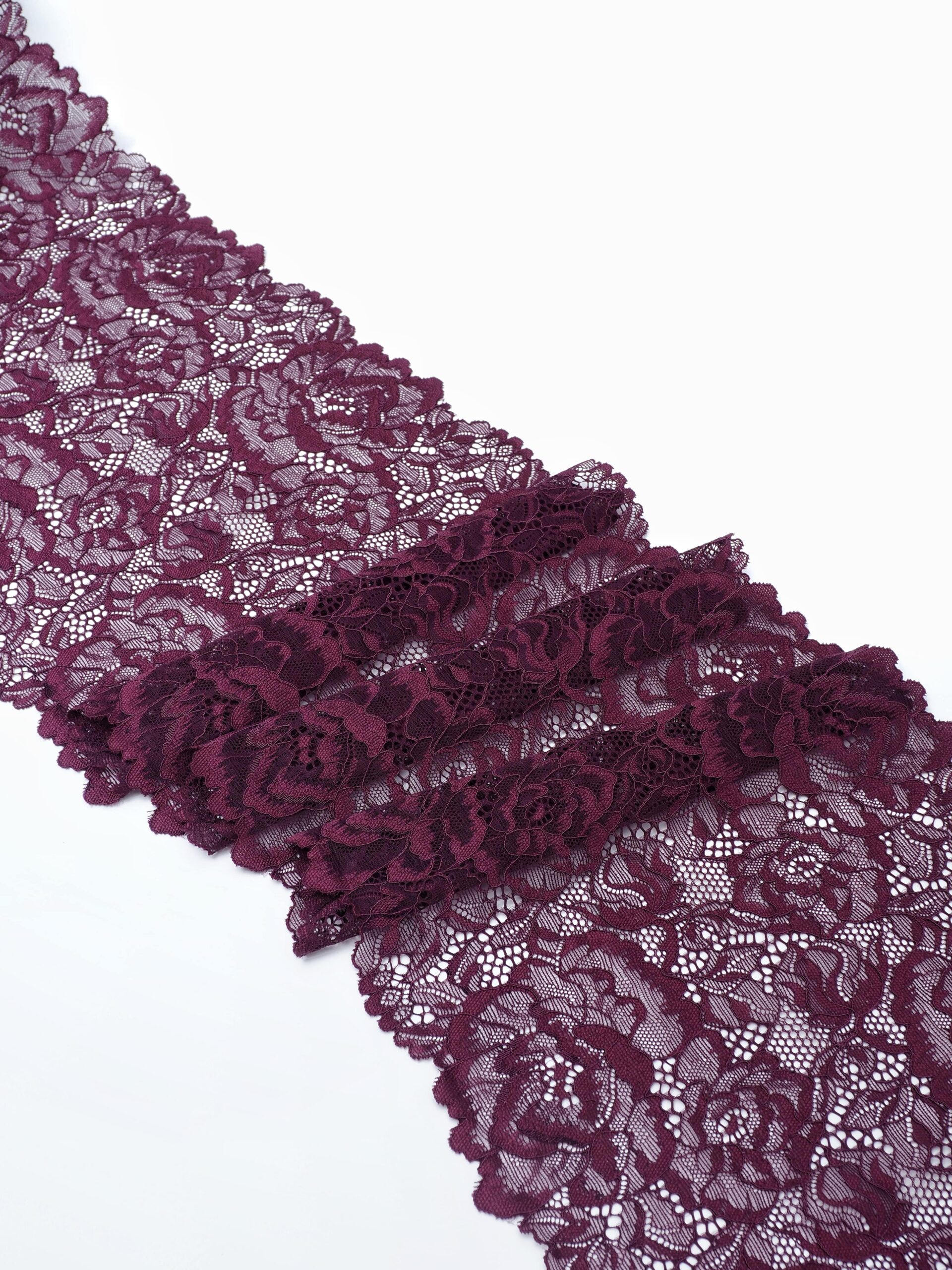 Кружево эластичное фиолетового цвета. Кружево стрейч слива с цветочным рисунком.