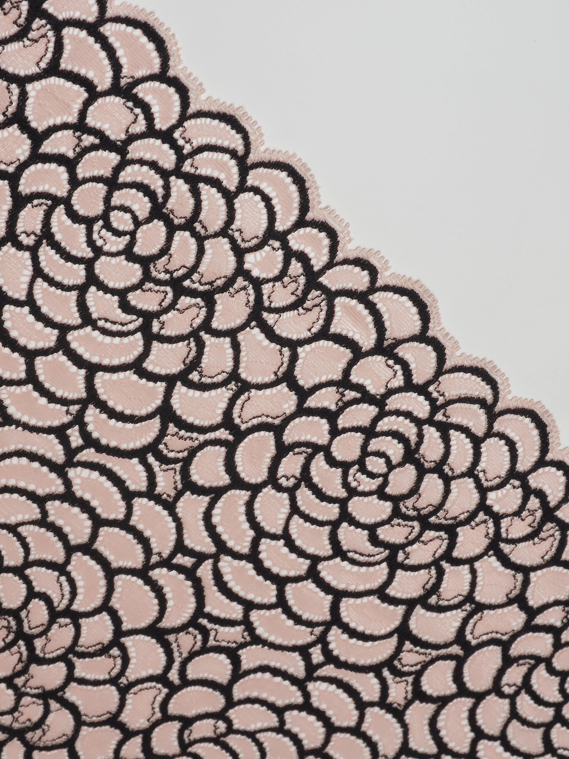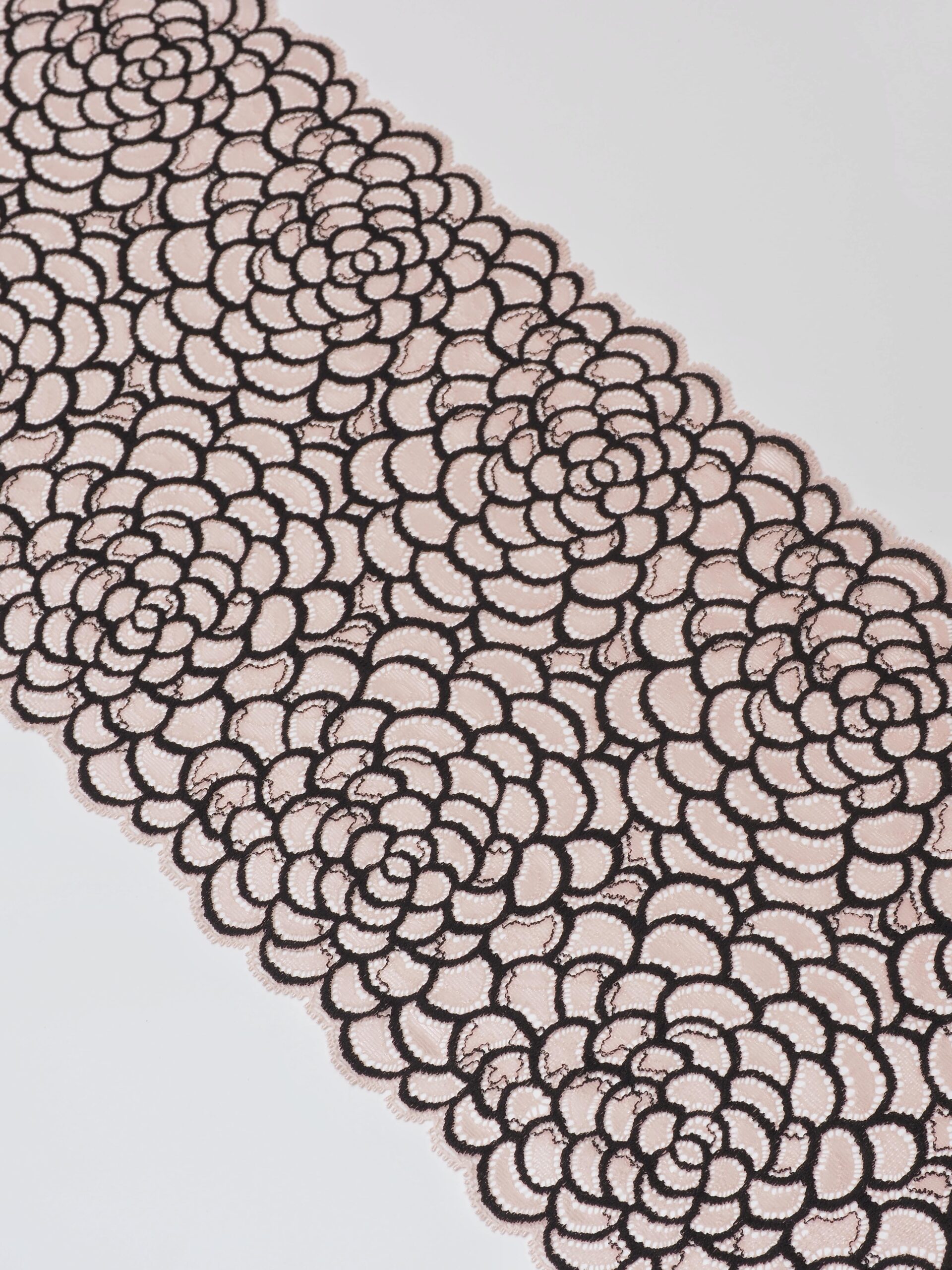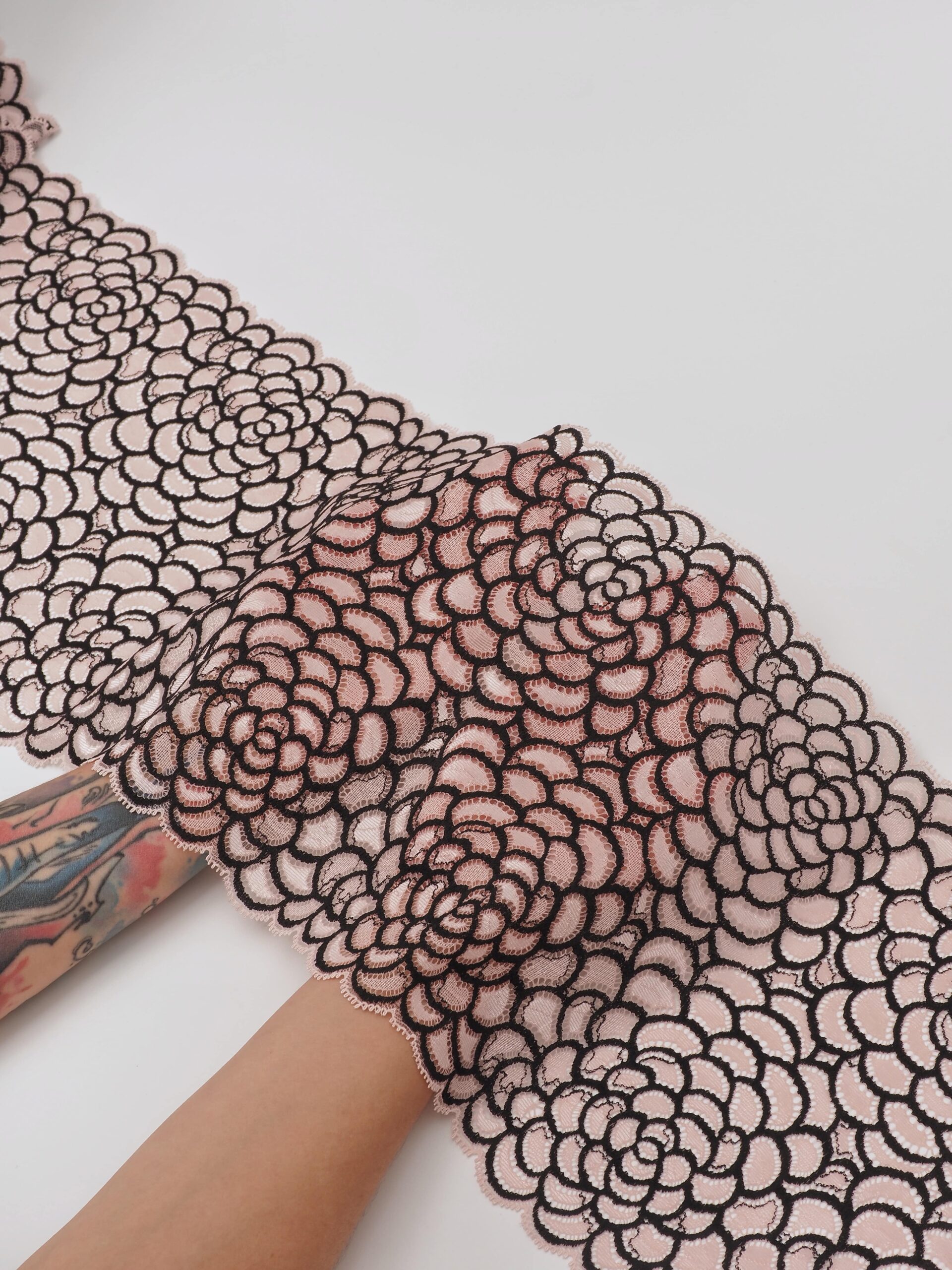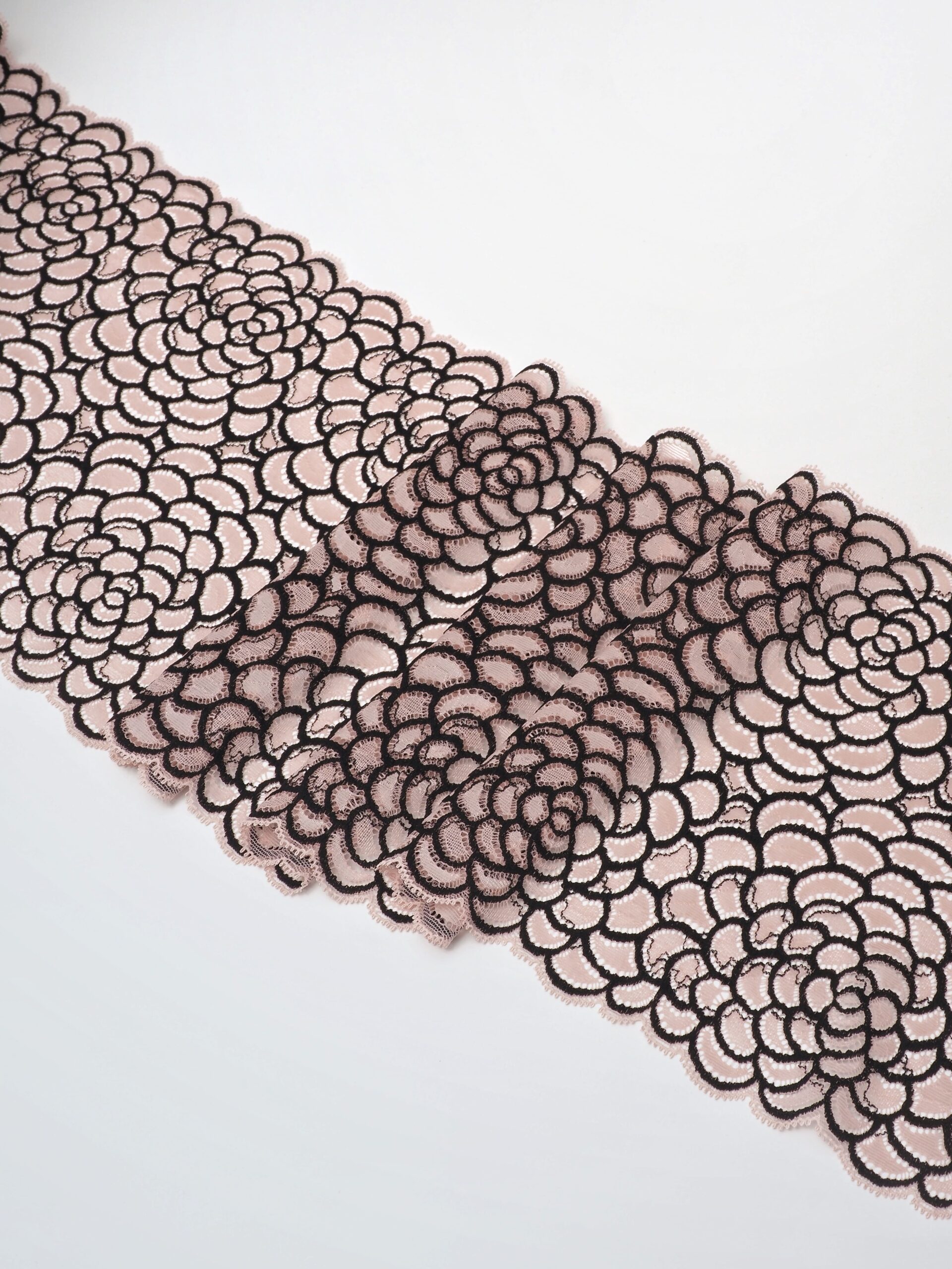 Изысканное стрейч кружево в нежном оттенке светлая пудра с черным цветом станет идеальным выбором для создания роскошного нижнего белья. Ширина полотна позволяет использовать материал как для декоративных элементов, так и для основного кроя.