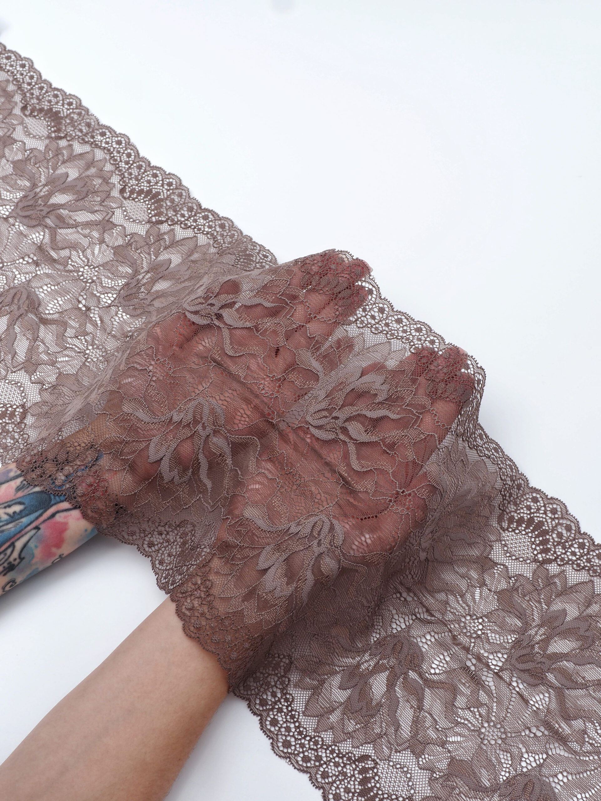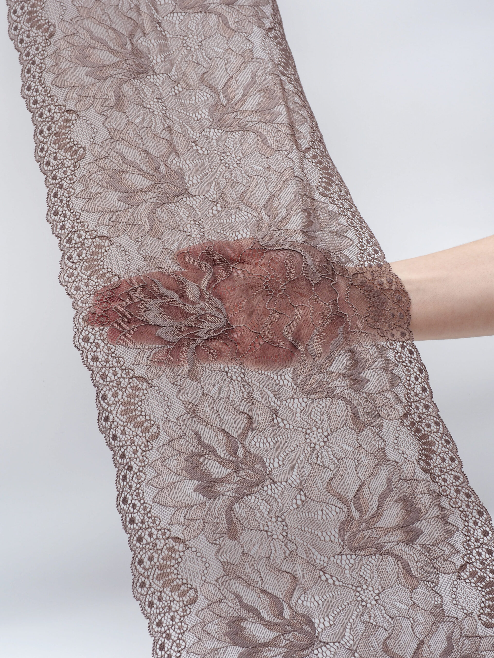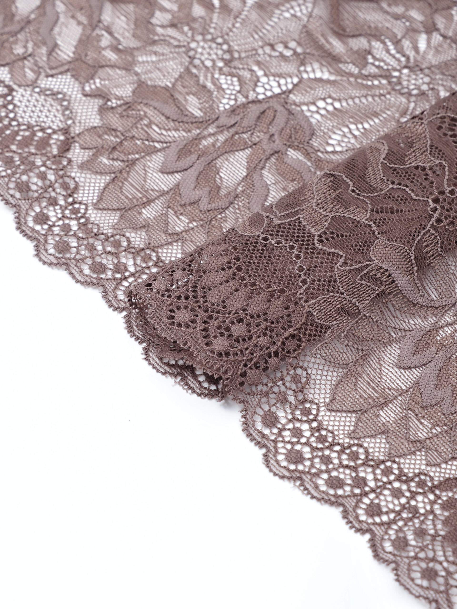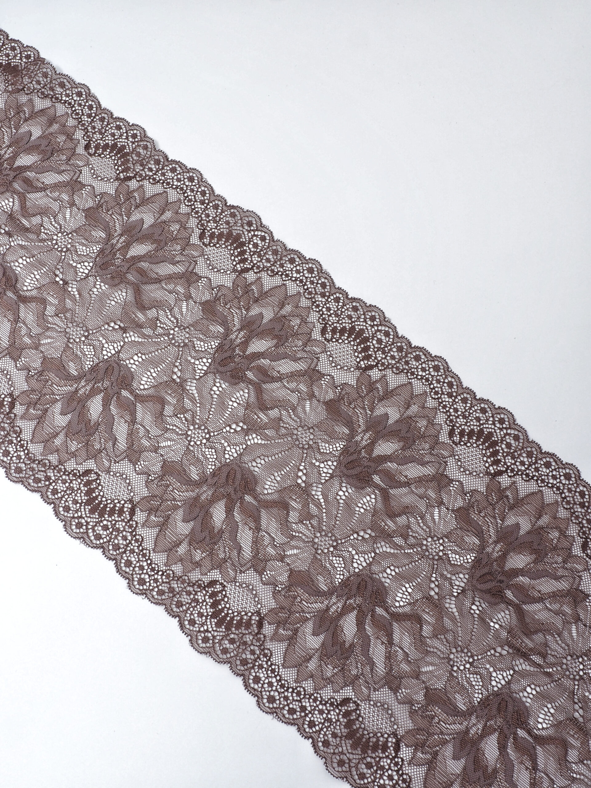 Изысканное стрейч кружево в коричневом цвете станет идеальным выбором для создания роскошного нижнего белья. Ширина полотна позволяет использовать материал как для декоративных элементов, так и для основного кроя.