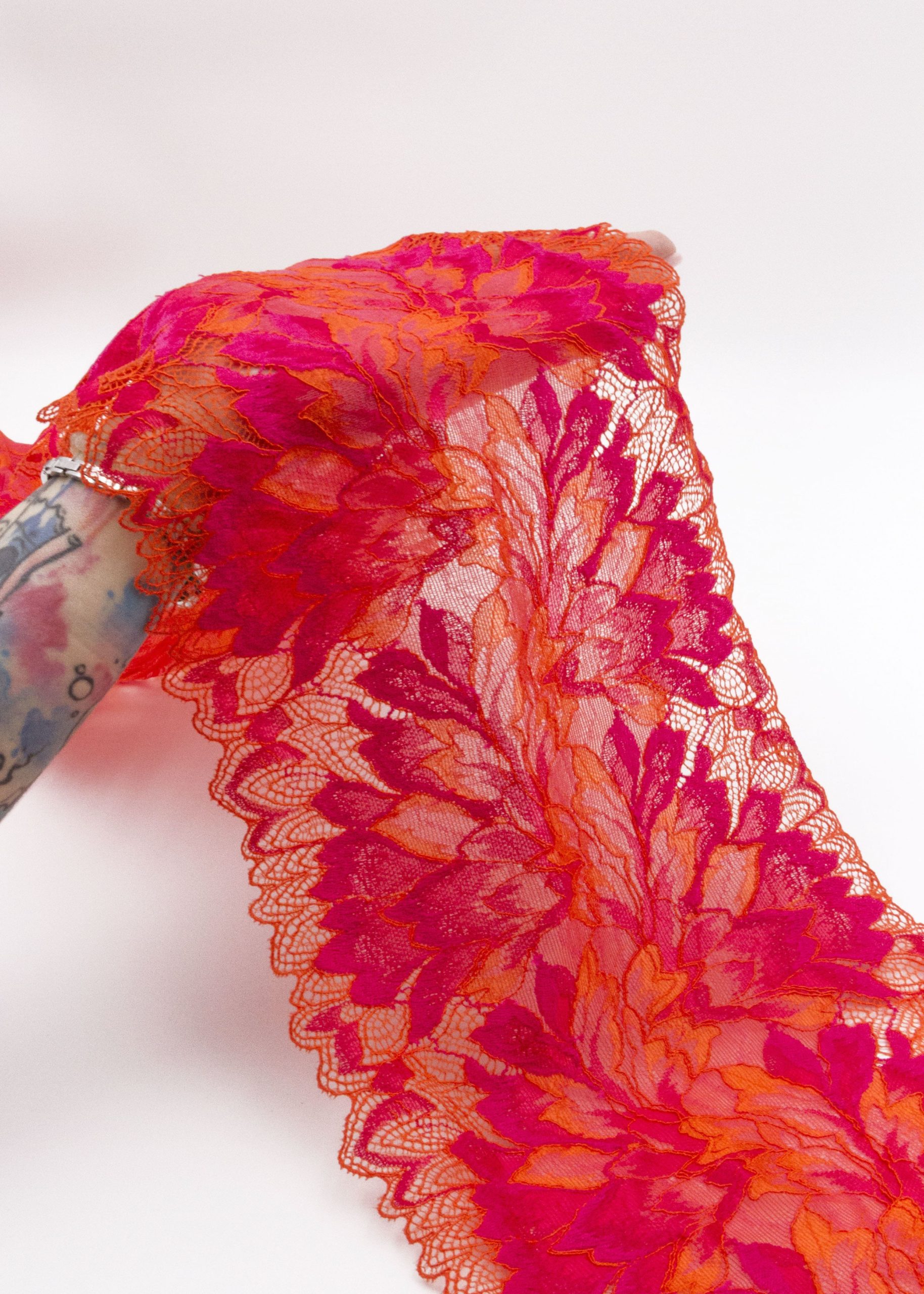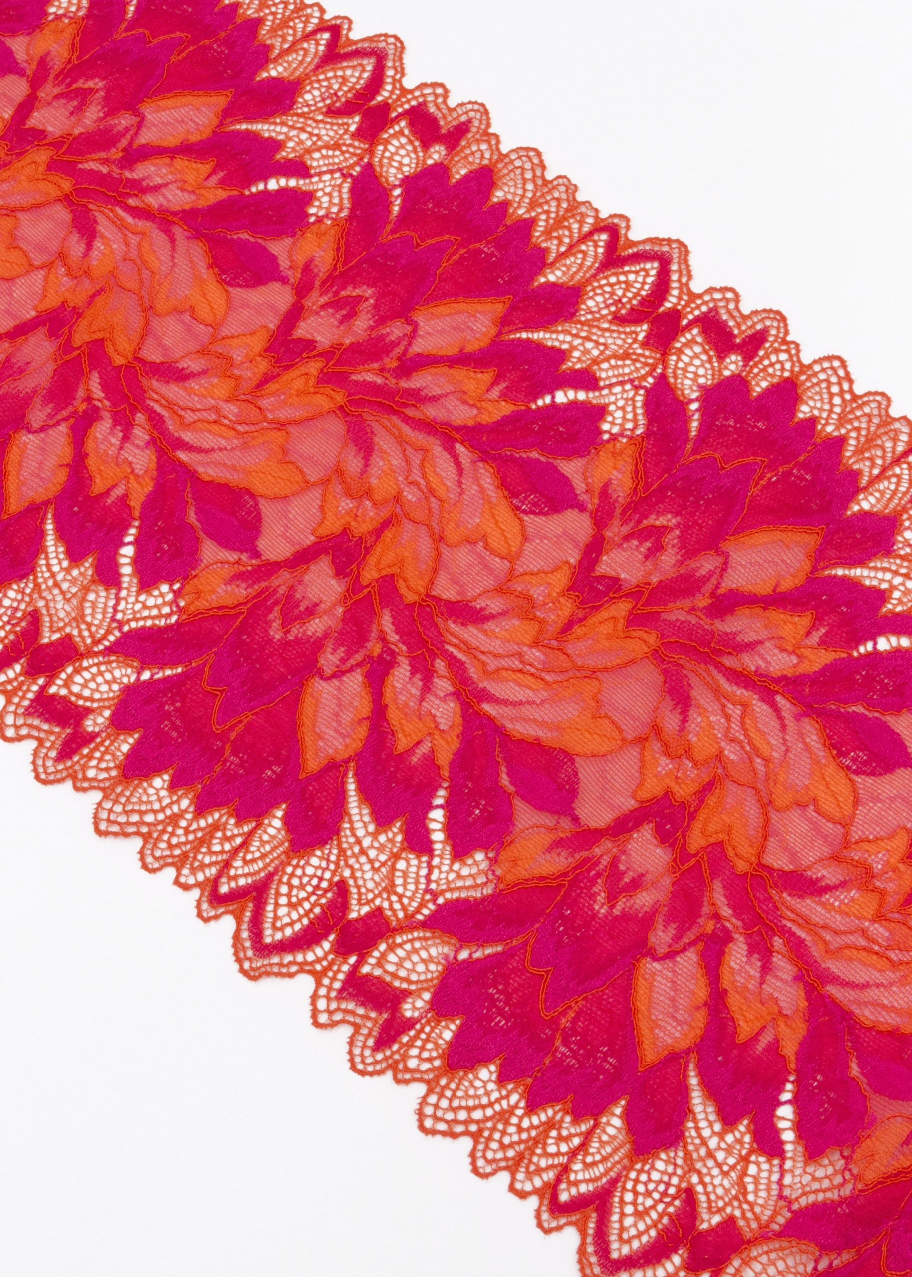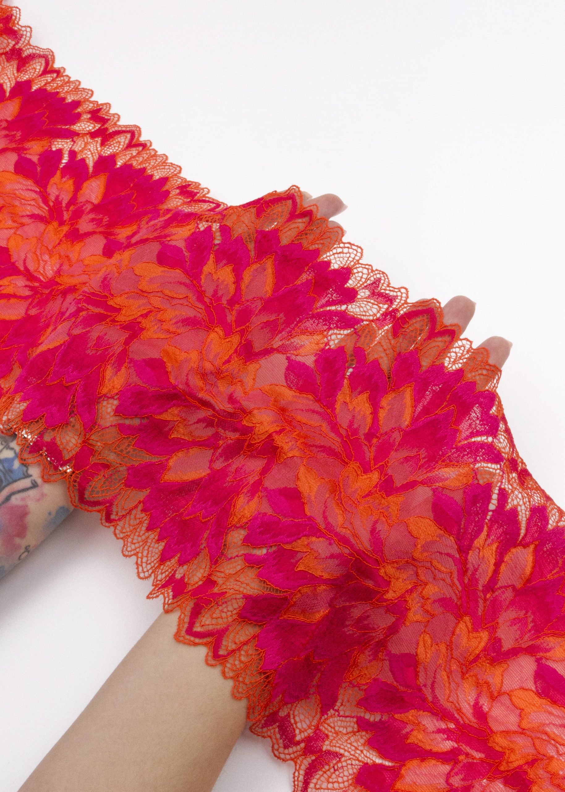 Кружево эластичное розового и оранжевого цвета. Кружево стрейч фуксия с оранжевым цветочным рисунком.