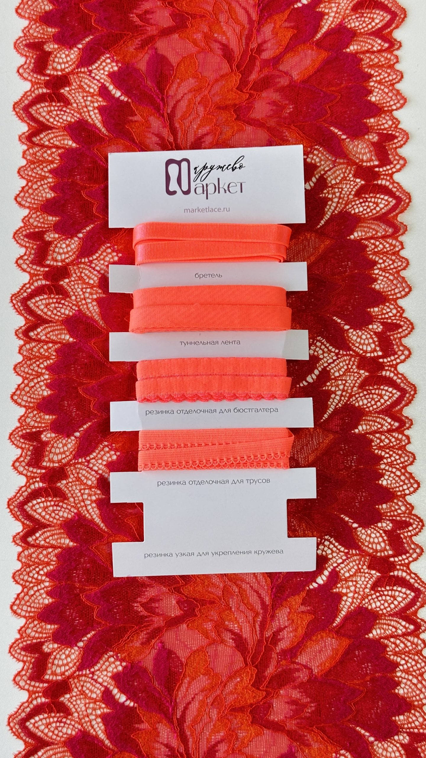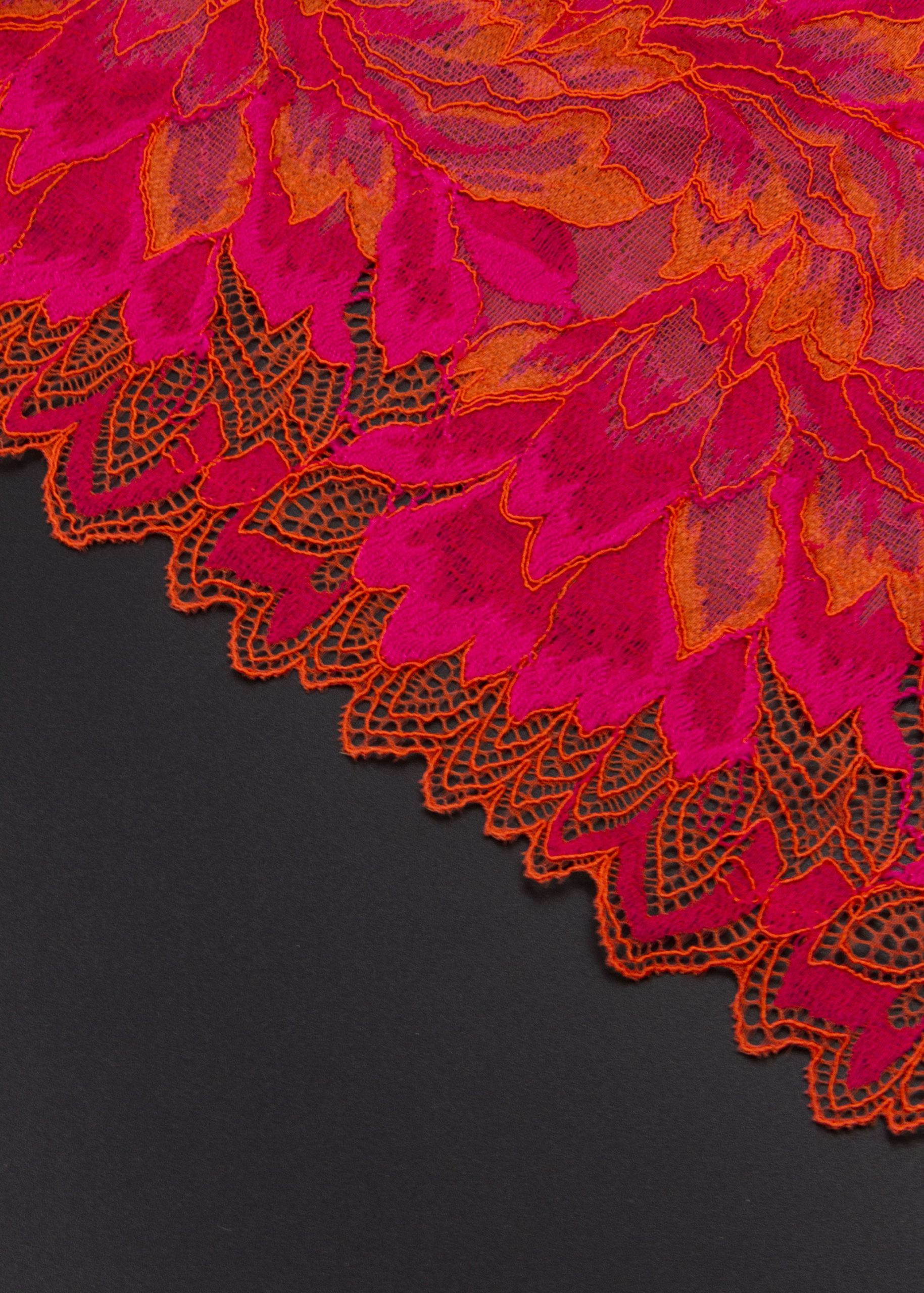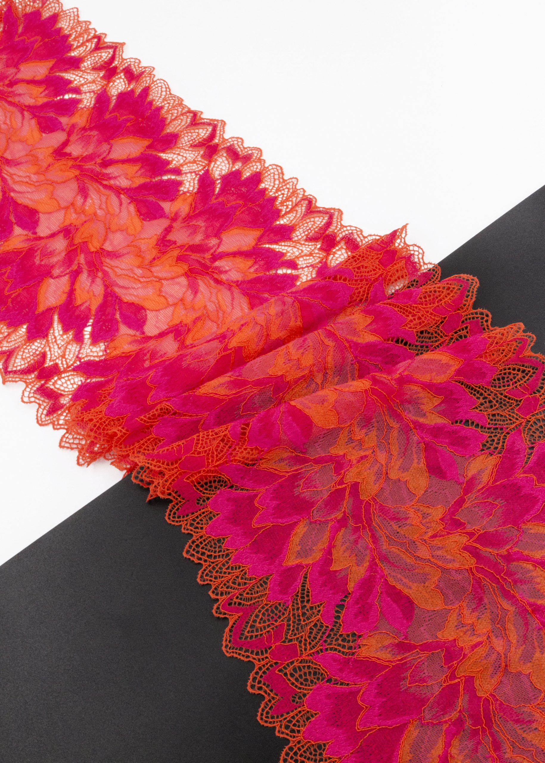 Кружево эластичное розового и оранжевого цвета. Кружево стрейч фуксия с оранжевым цветочным рисунком.