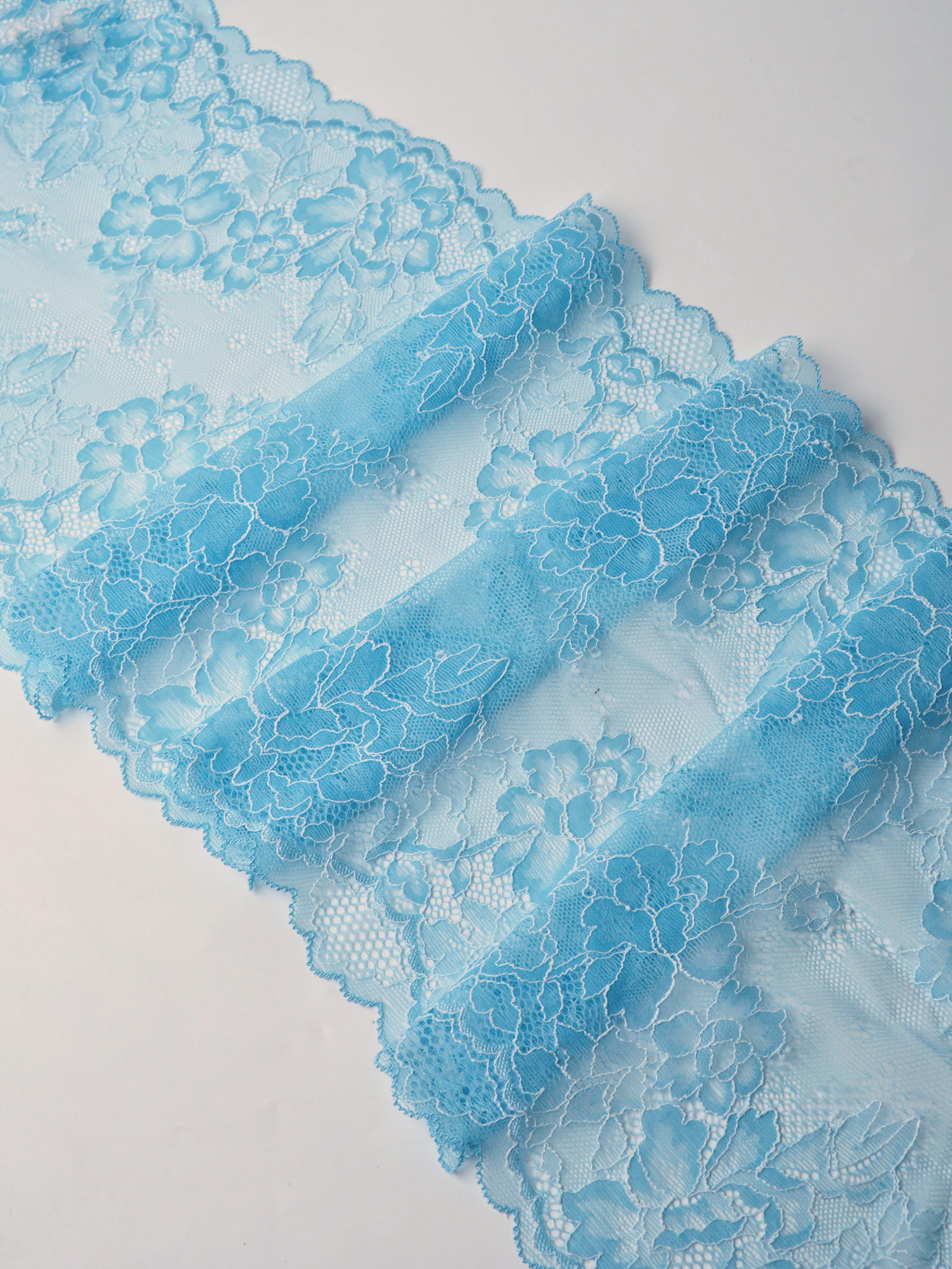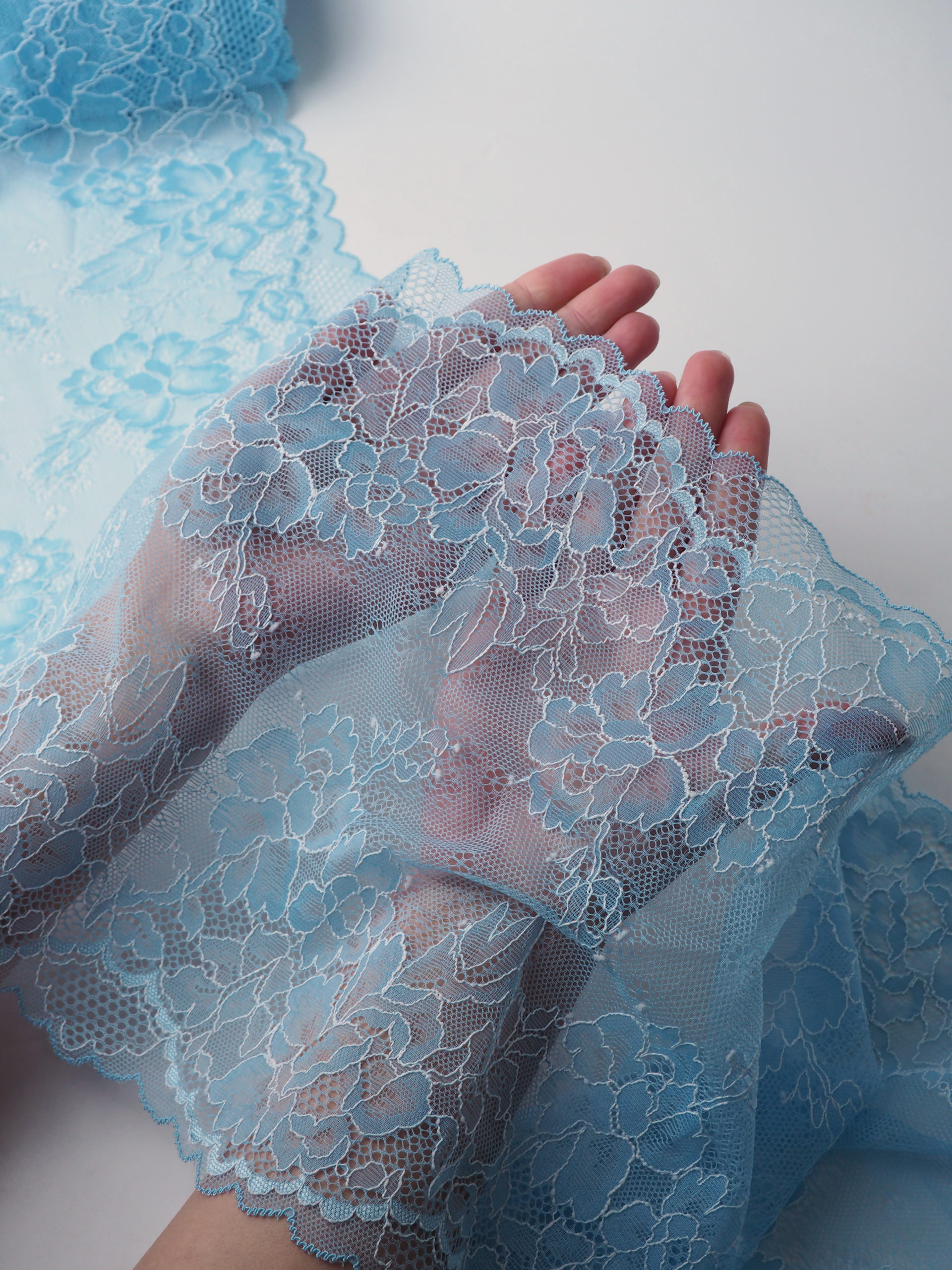 Кружево эластичное стрейч голубого цвета с белым. Рисунок цветочный.