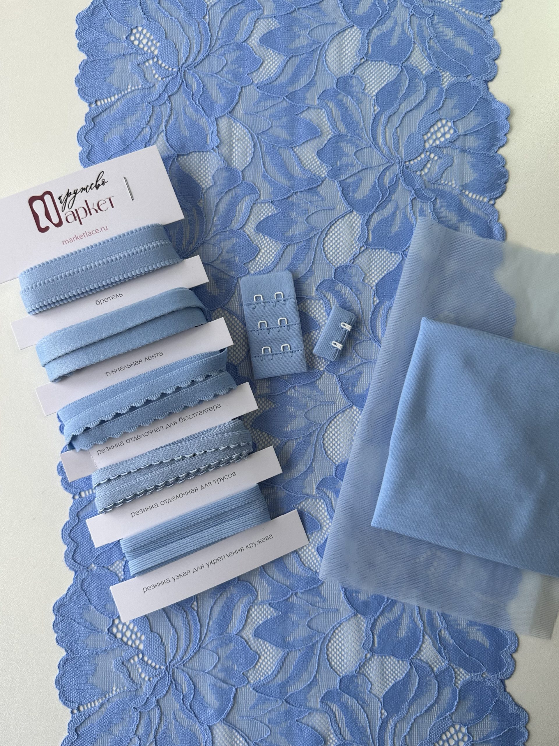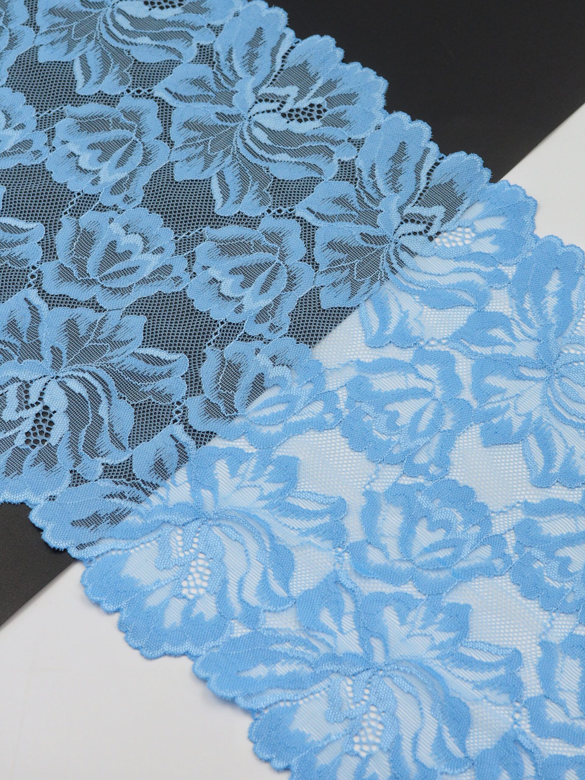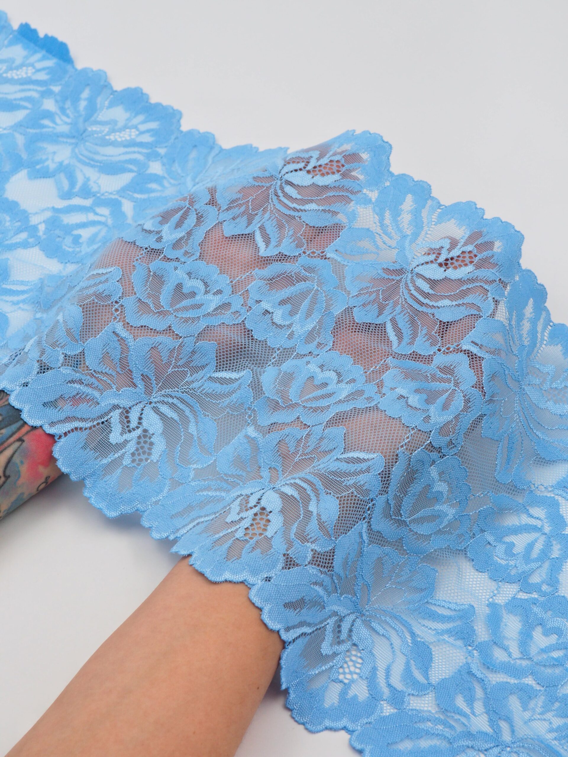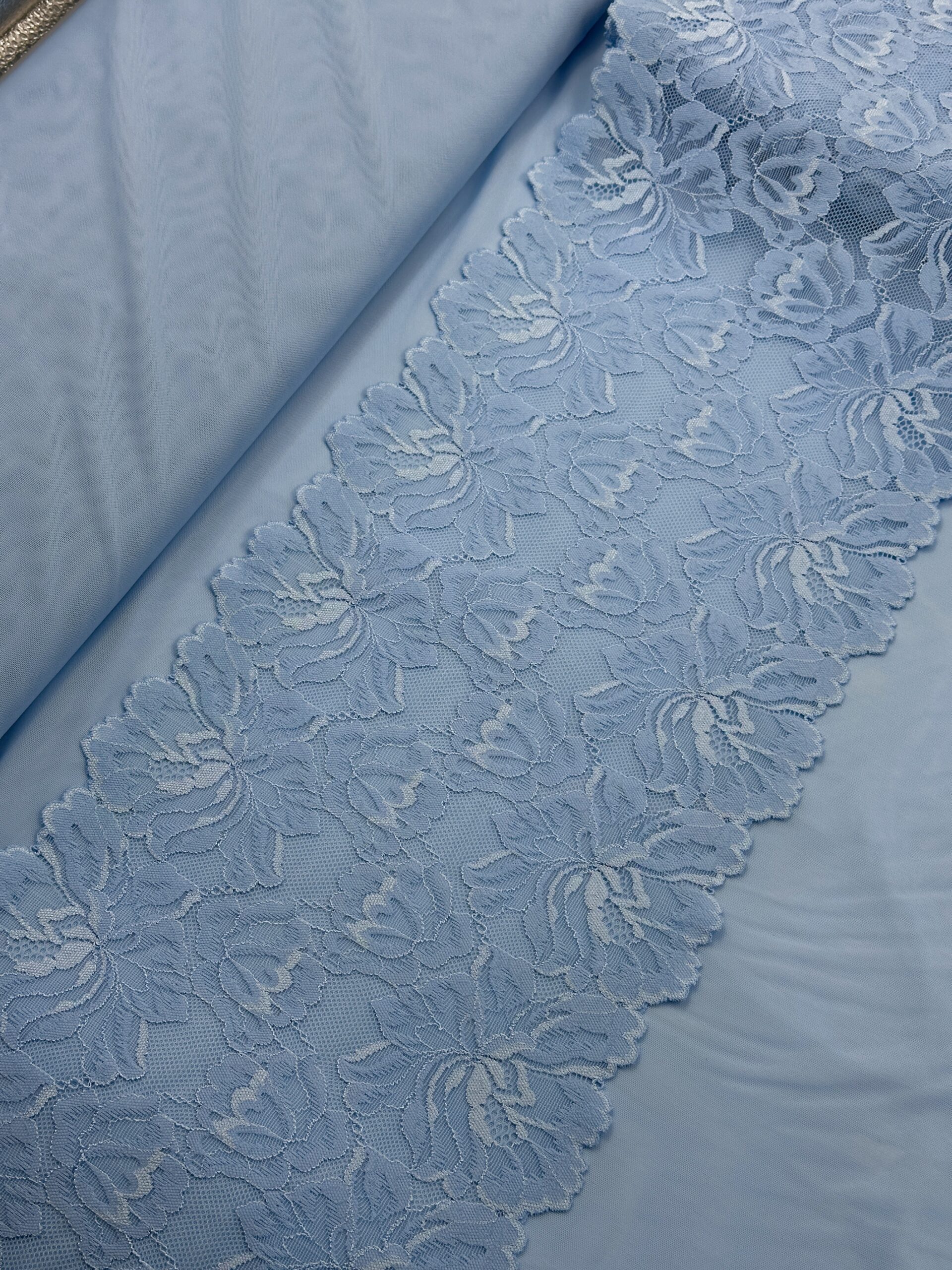 Кружево эластичное стрейч голубого цвета. Рисунок цветочный.