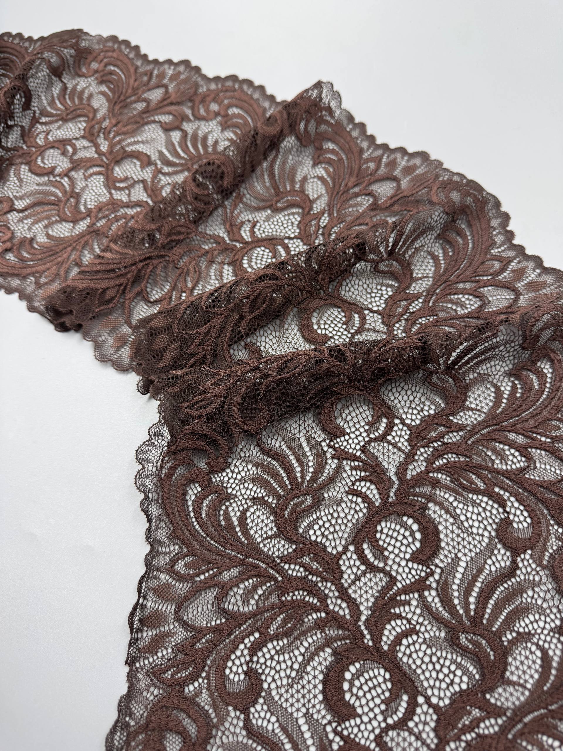 Кружево эластичное коричневое. Стрейч кружево шоколадное с цветочным узором.