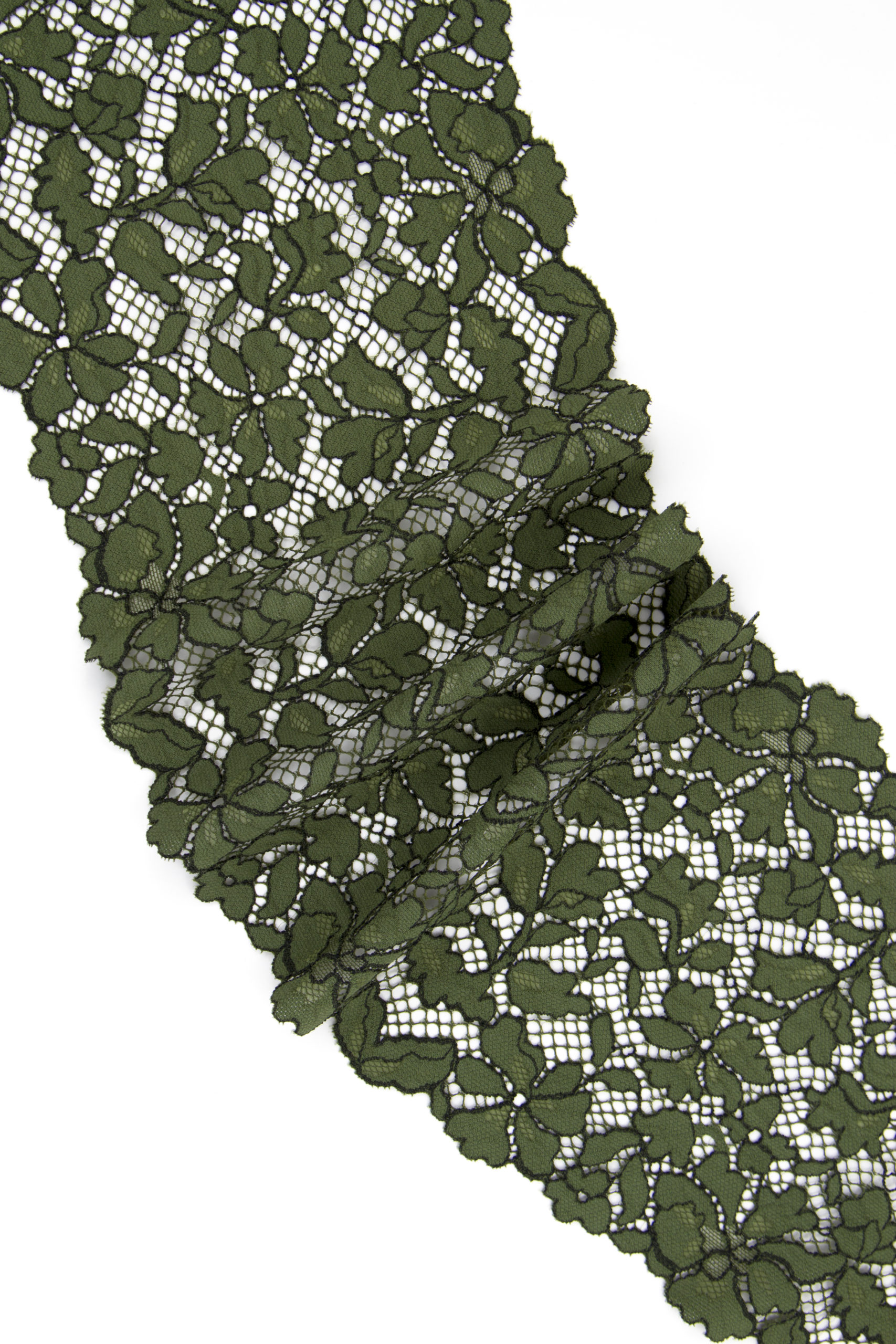 Кружево эластичное зеленое. Стрейч кружево хаки с цветочным рисунком.