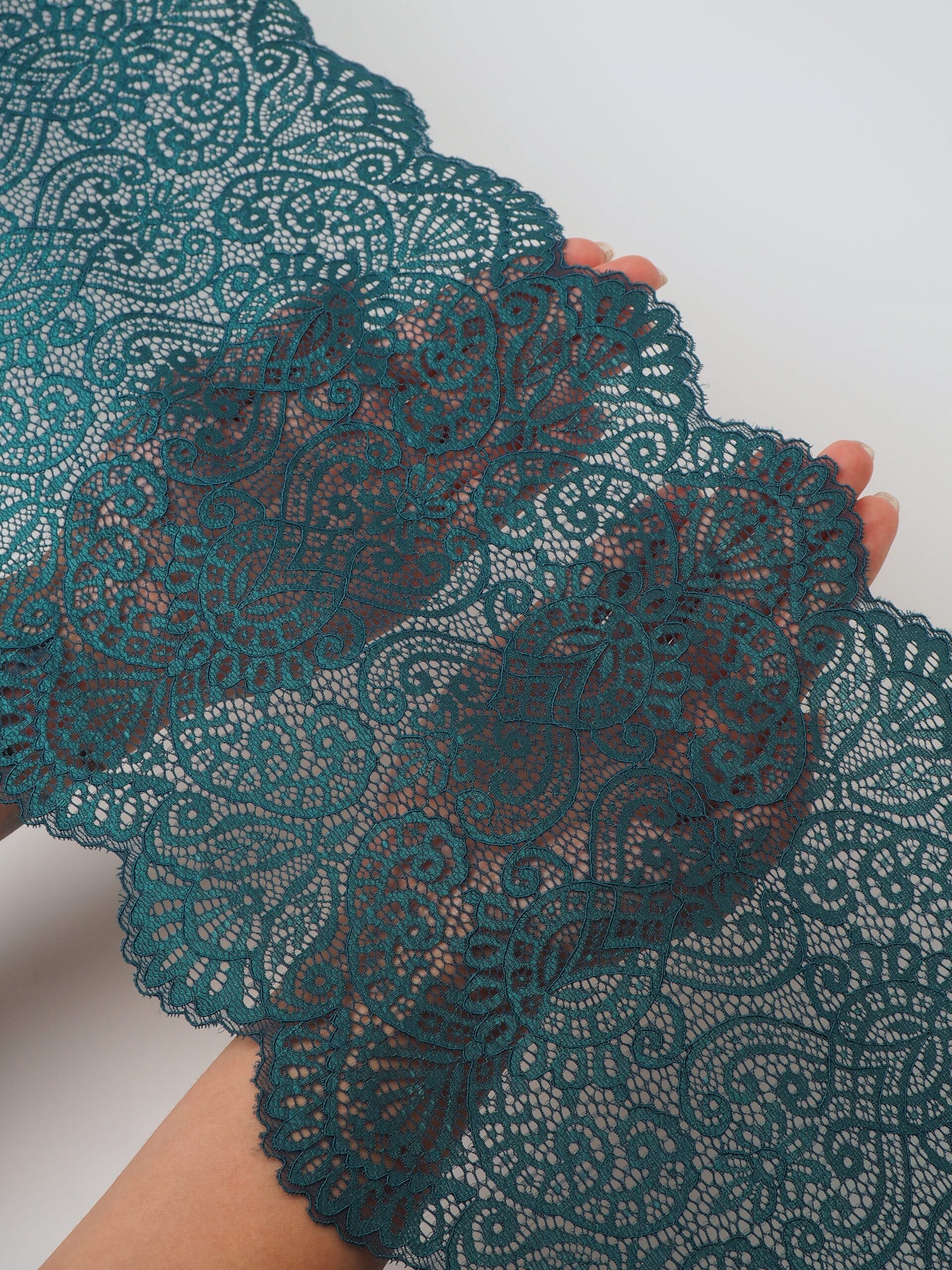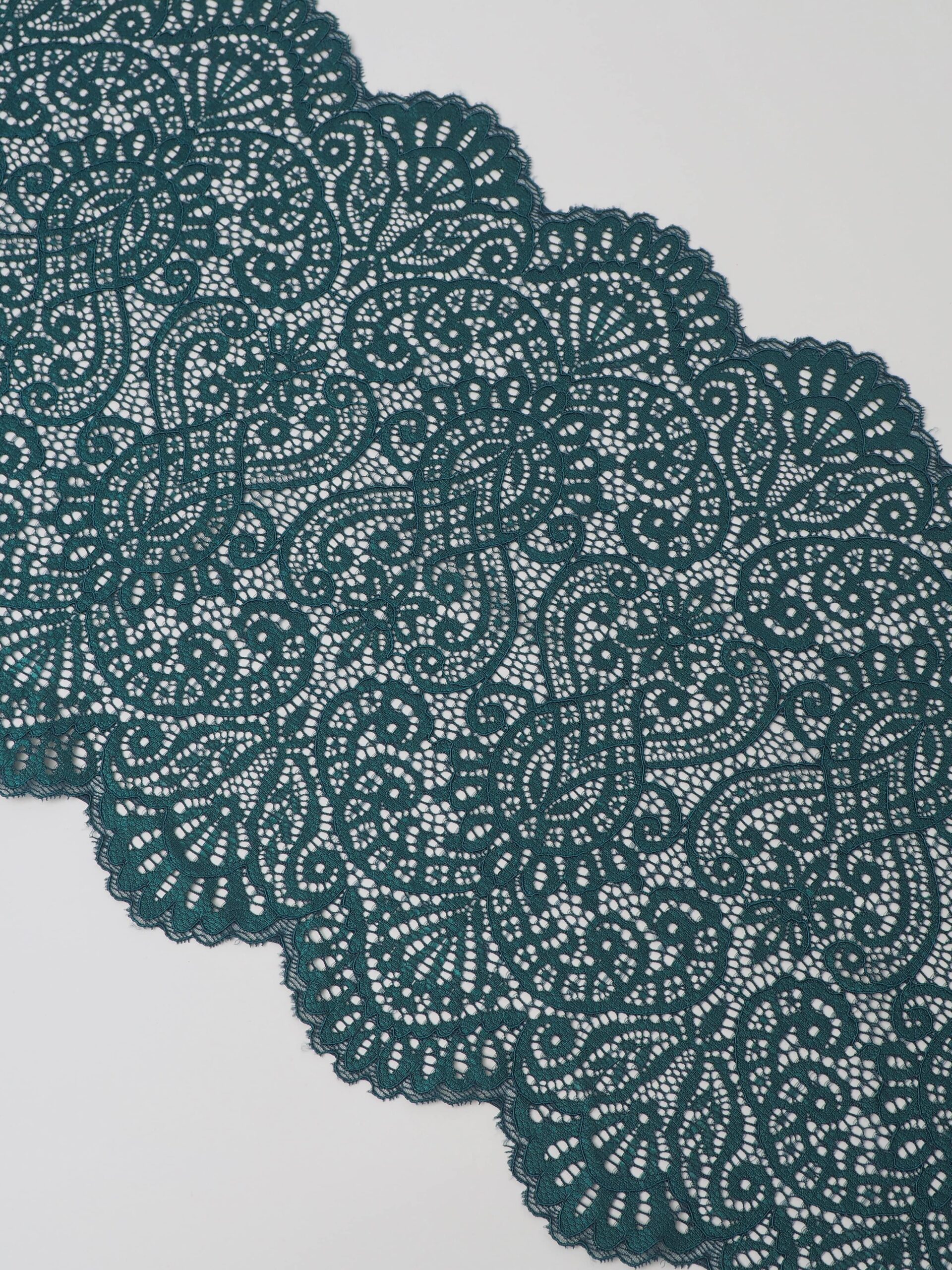 Эластичное кружево изумруд используется для изготовления разнообразной одежды и предметов декора. Данный материал, как правило, хорошо сохраняет форму, но при этом неплохо тянется. Такие свойства делают его действительно универсальным в применении. Кружево стрейч можно использовать для пошива нижнего белья, чулков, сценических костюмов, элементов декора. С материалом достаточно просто работать - не только профессионалам, но и новичкам.
