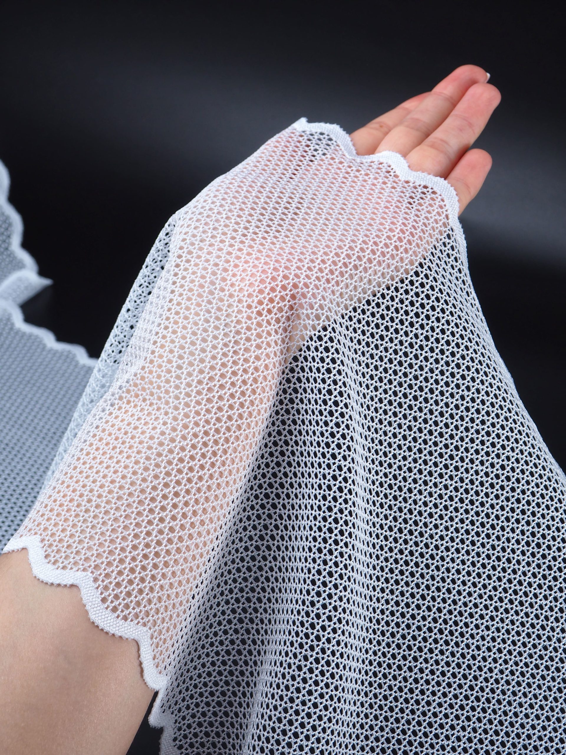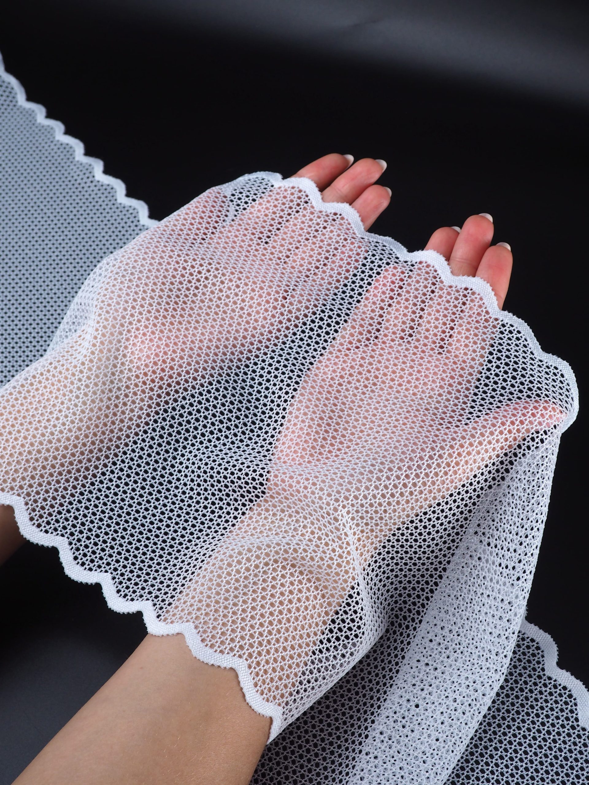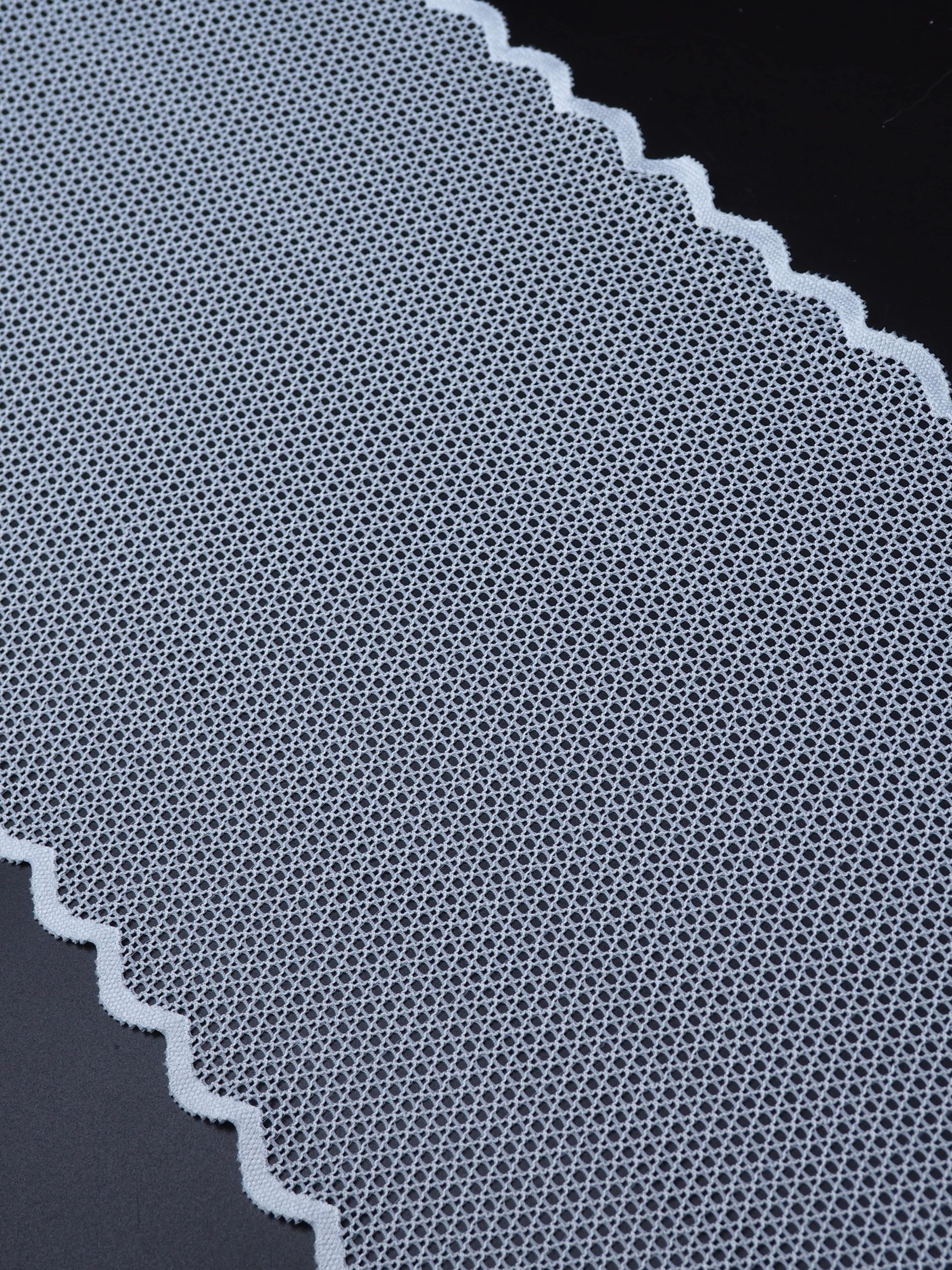 Кружево эластичное стрейч белого оттенка в сетку крупная ячейка.
