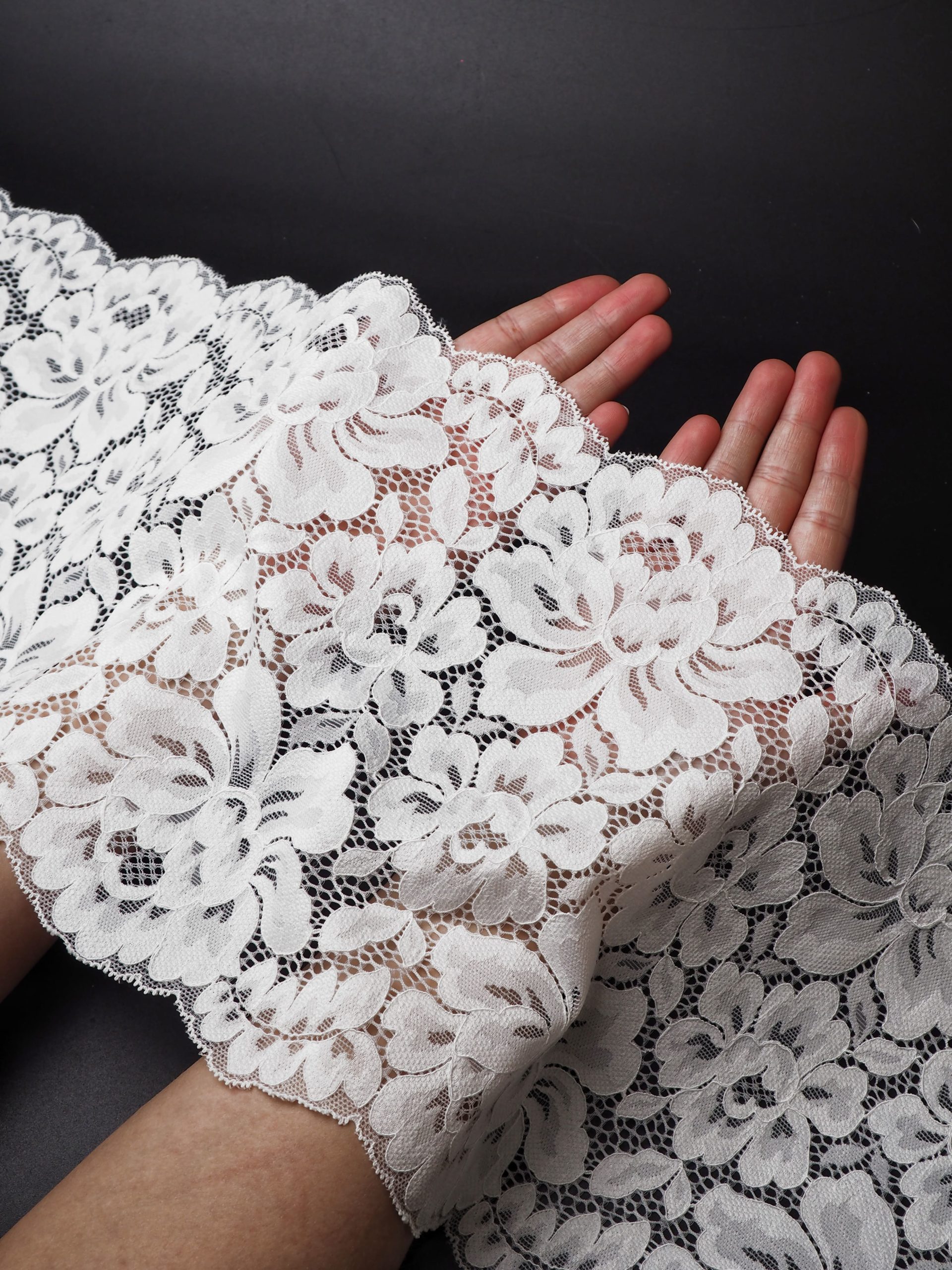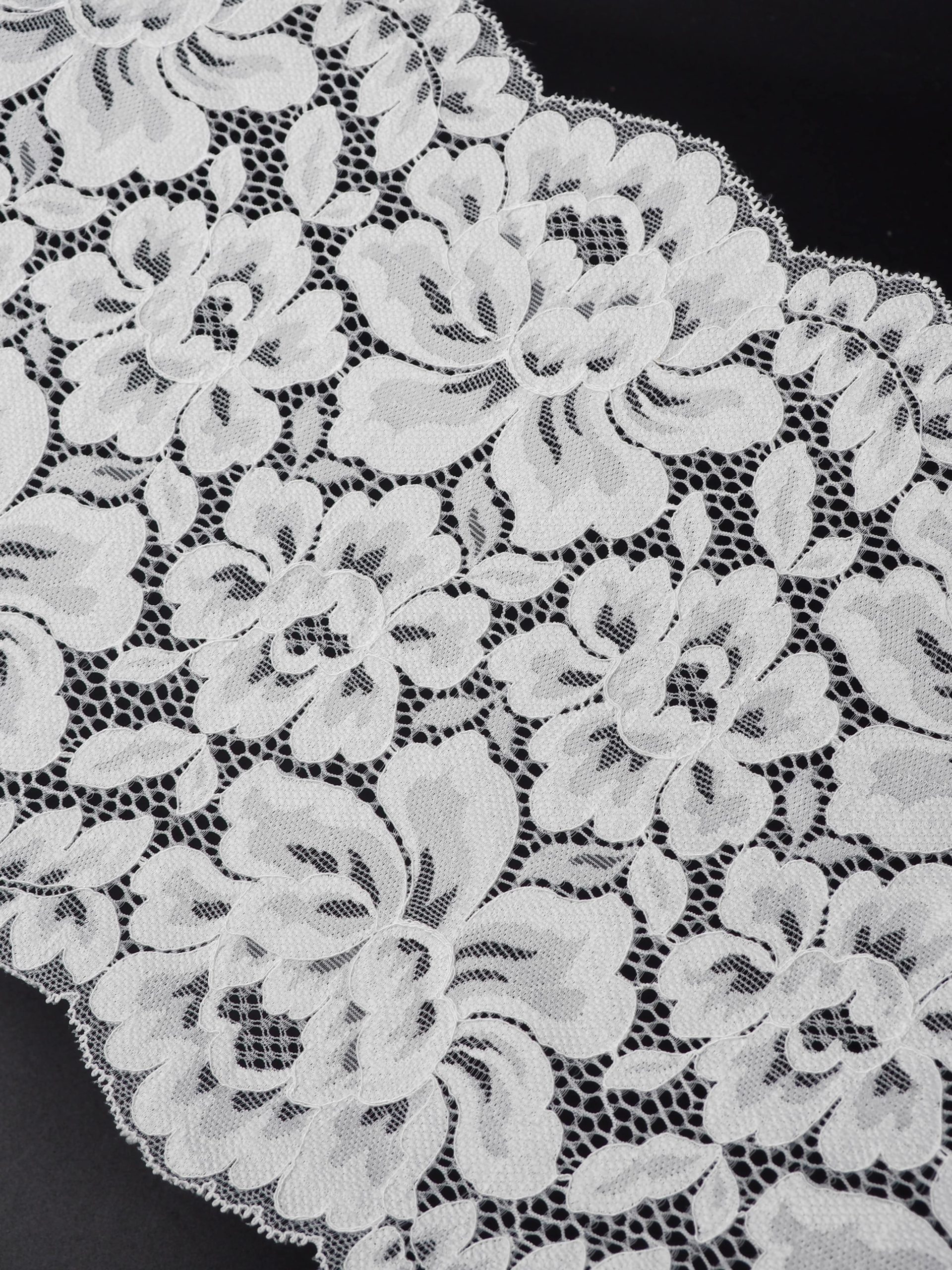 Кружево эластичное стрейч белого оттенка. Рисунок цветочный.