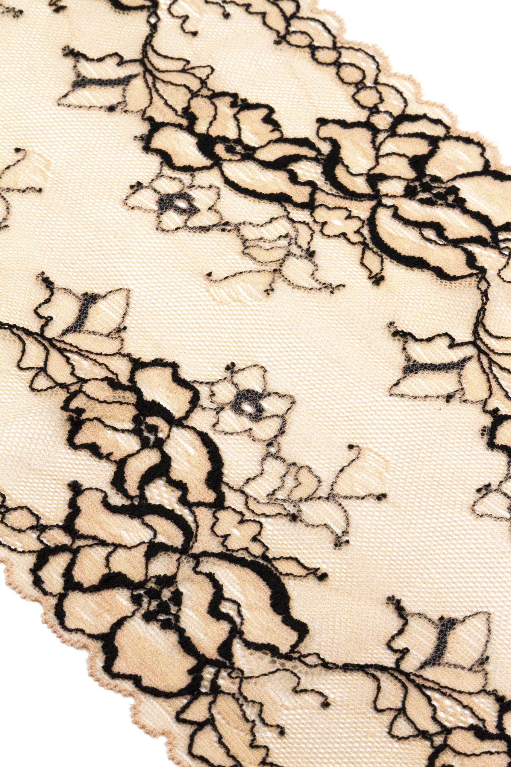 Кружево эластичное персикового цвета. Стрейч кружево коралловый миндаль с черным цветочным рисунком. Резинки коралловый миндаль более насыщенные по оттенку, чем это кружево.