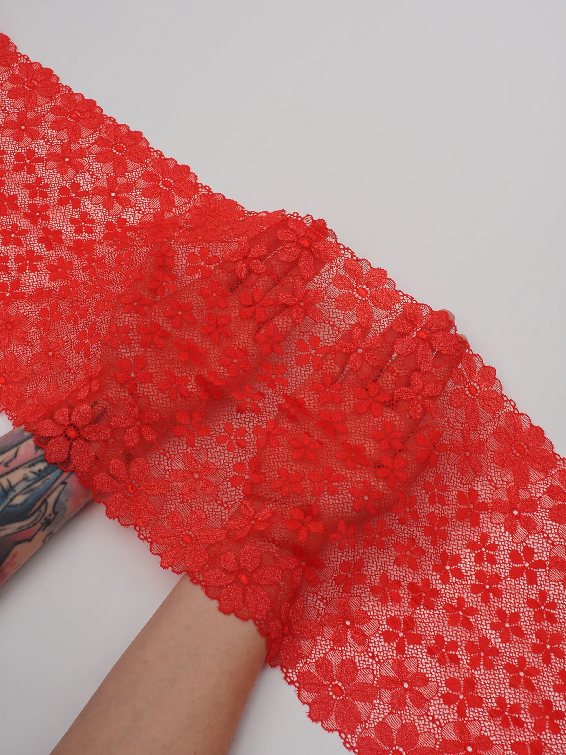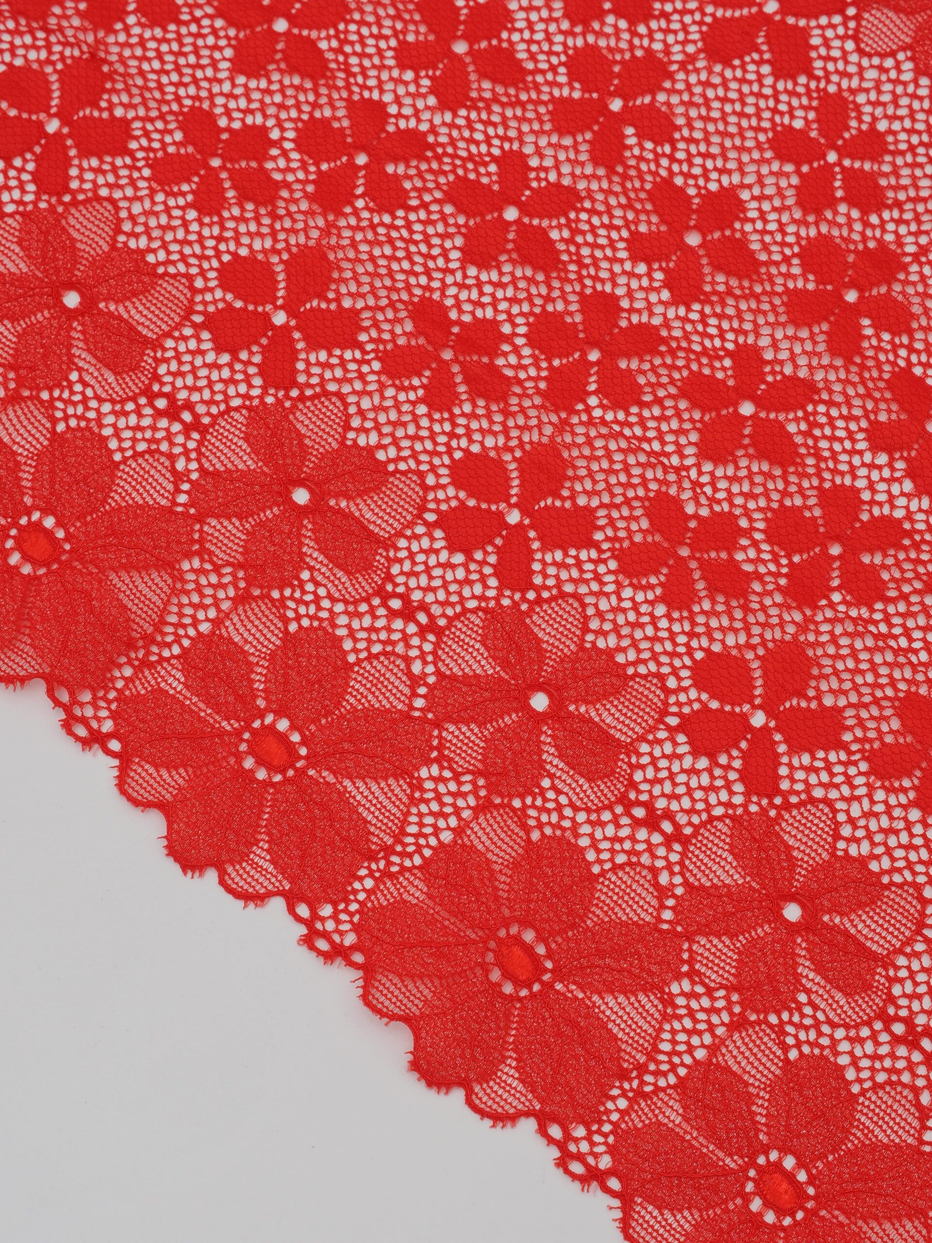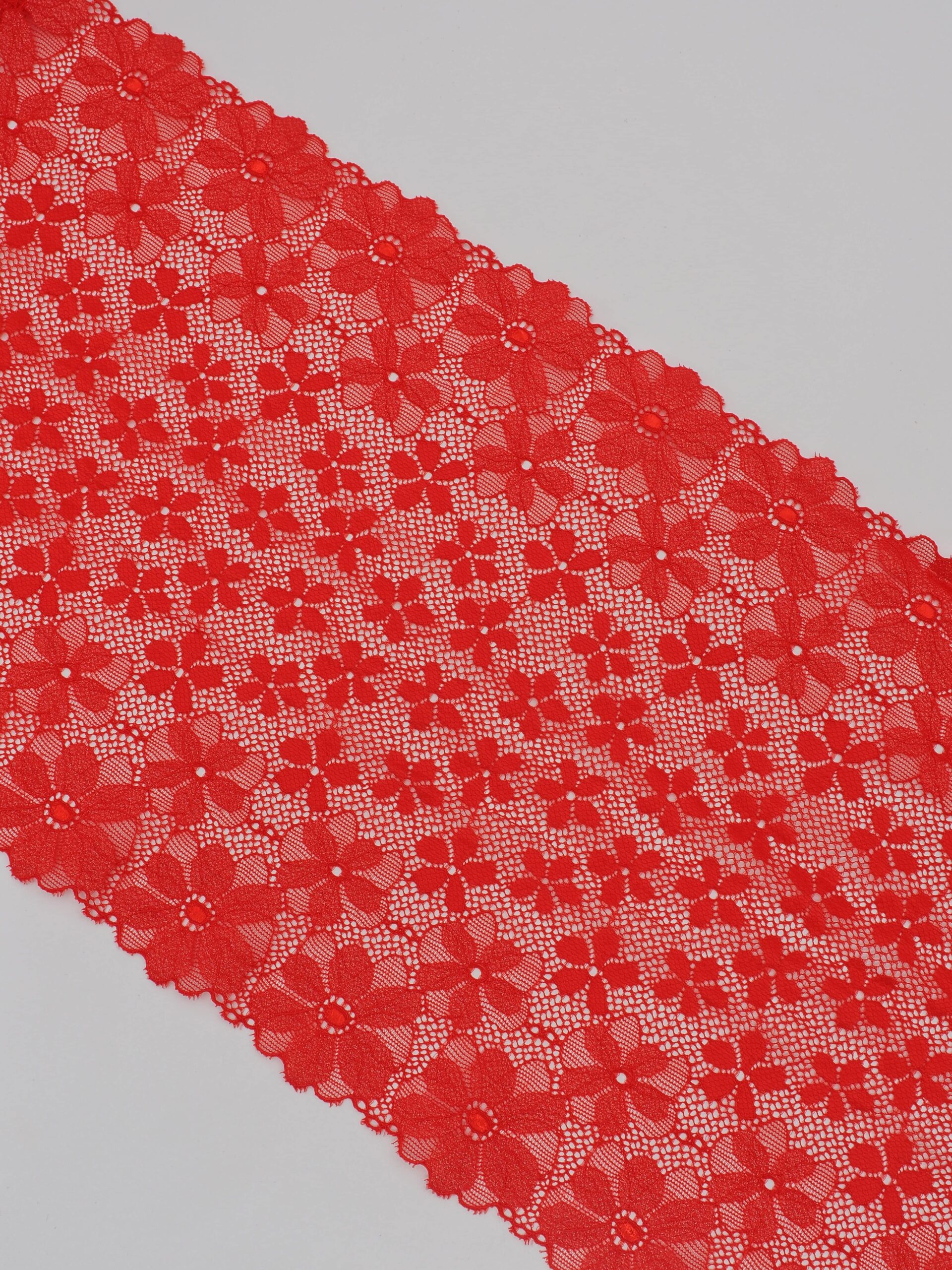 Кружево эластичное красное c люрексом. Рисунок цветочный с нитью цвета серебра.