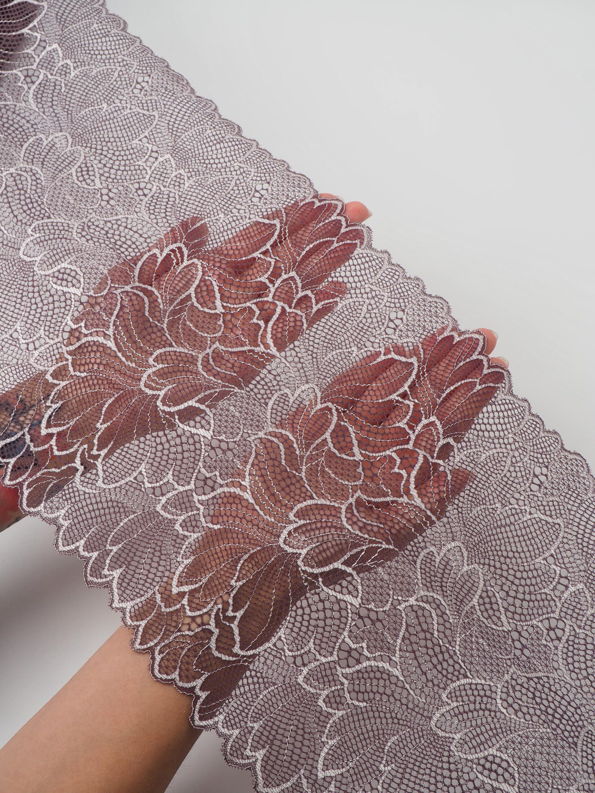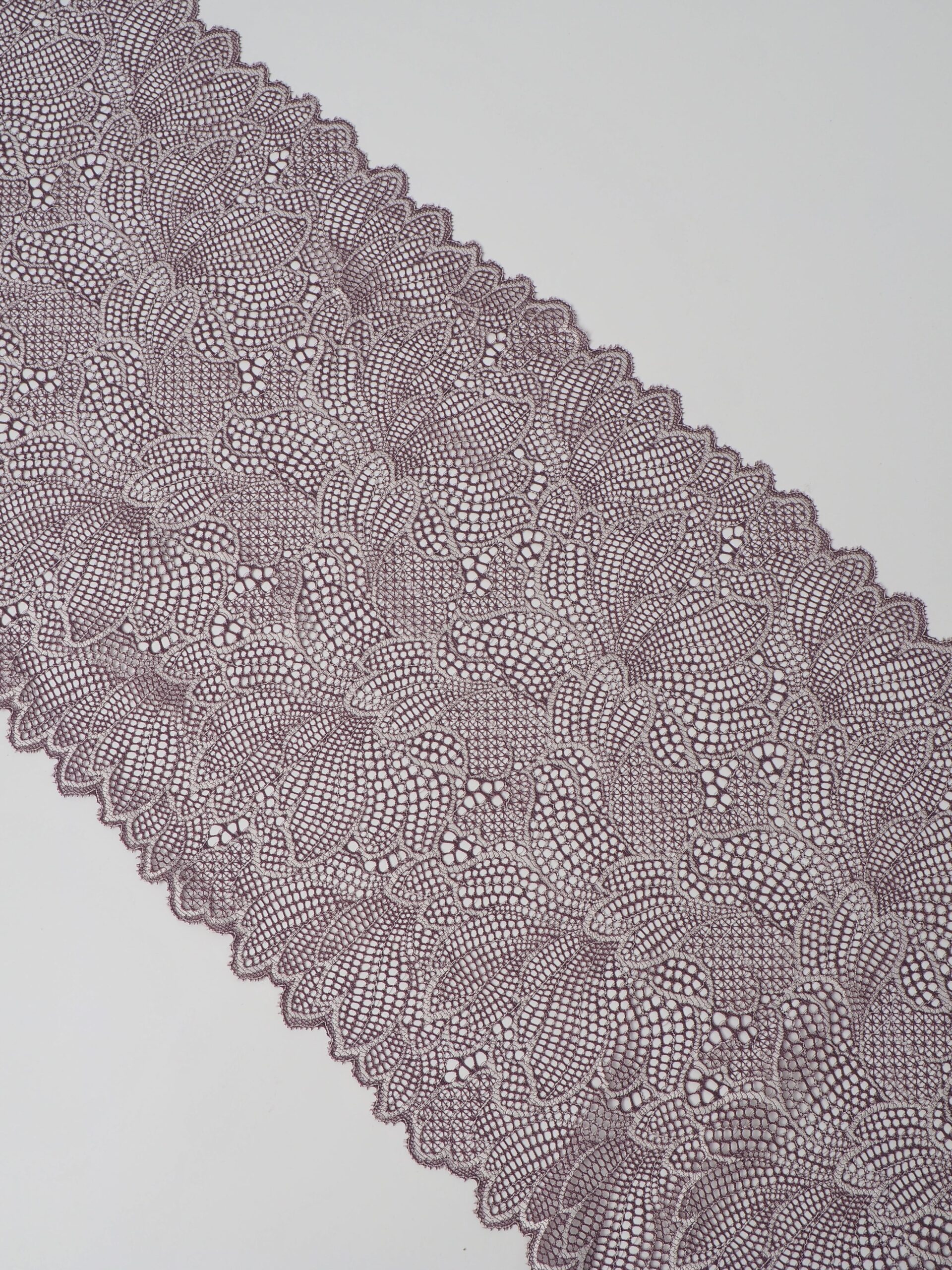 Кружево эластичное фиолетового цвета. Кружево стрейч оттенка крокус с молочным цветочным рисунком.