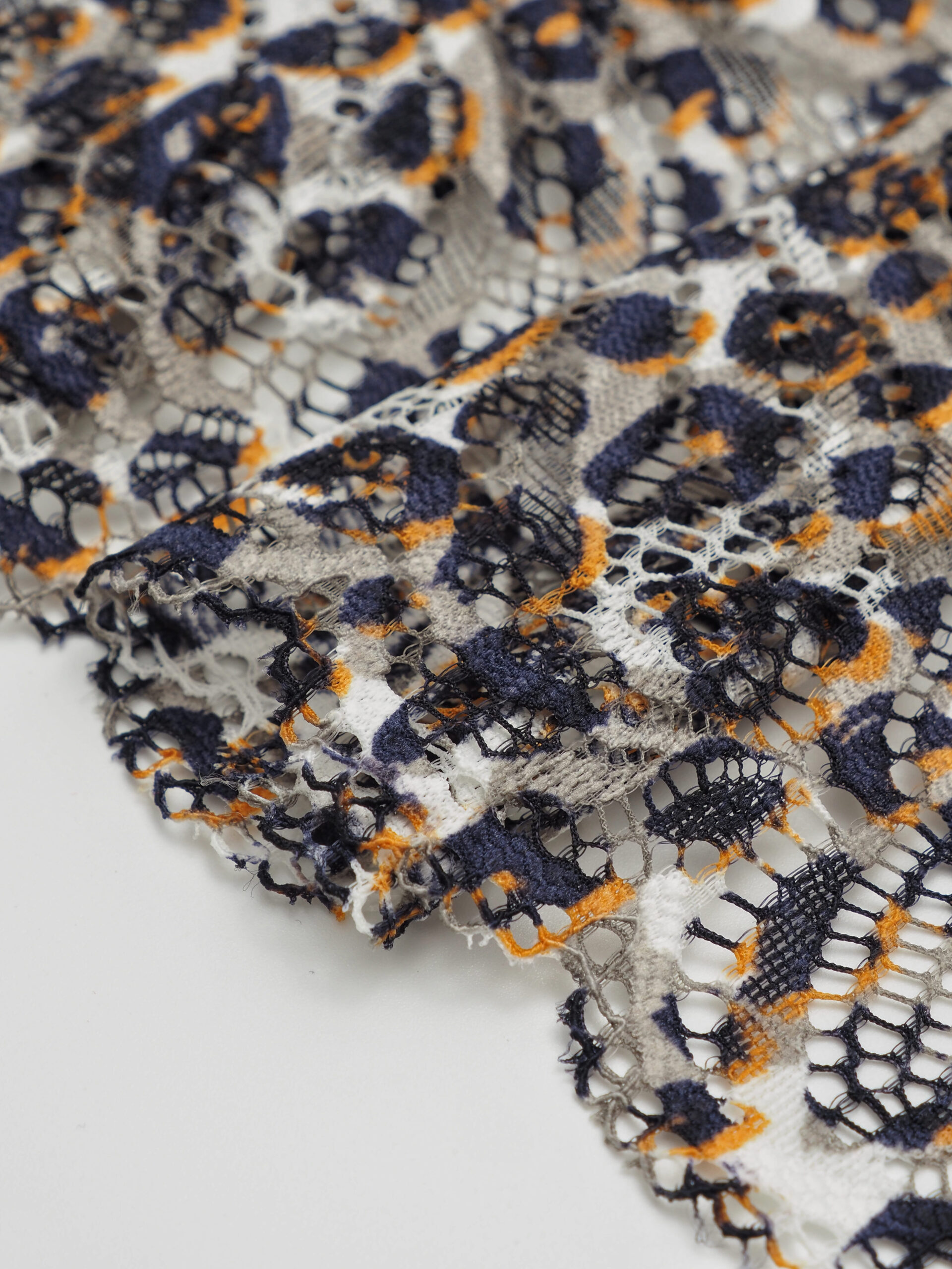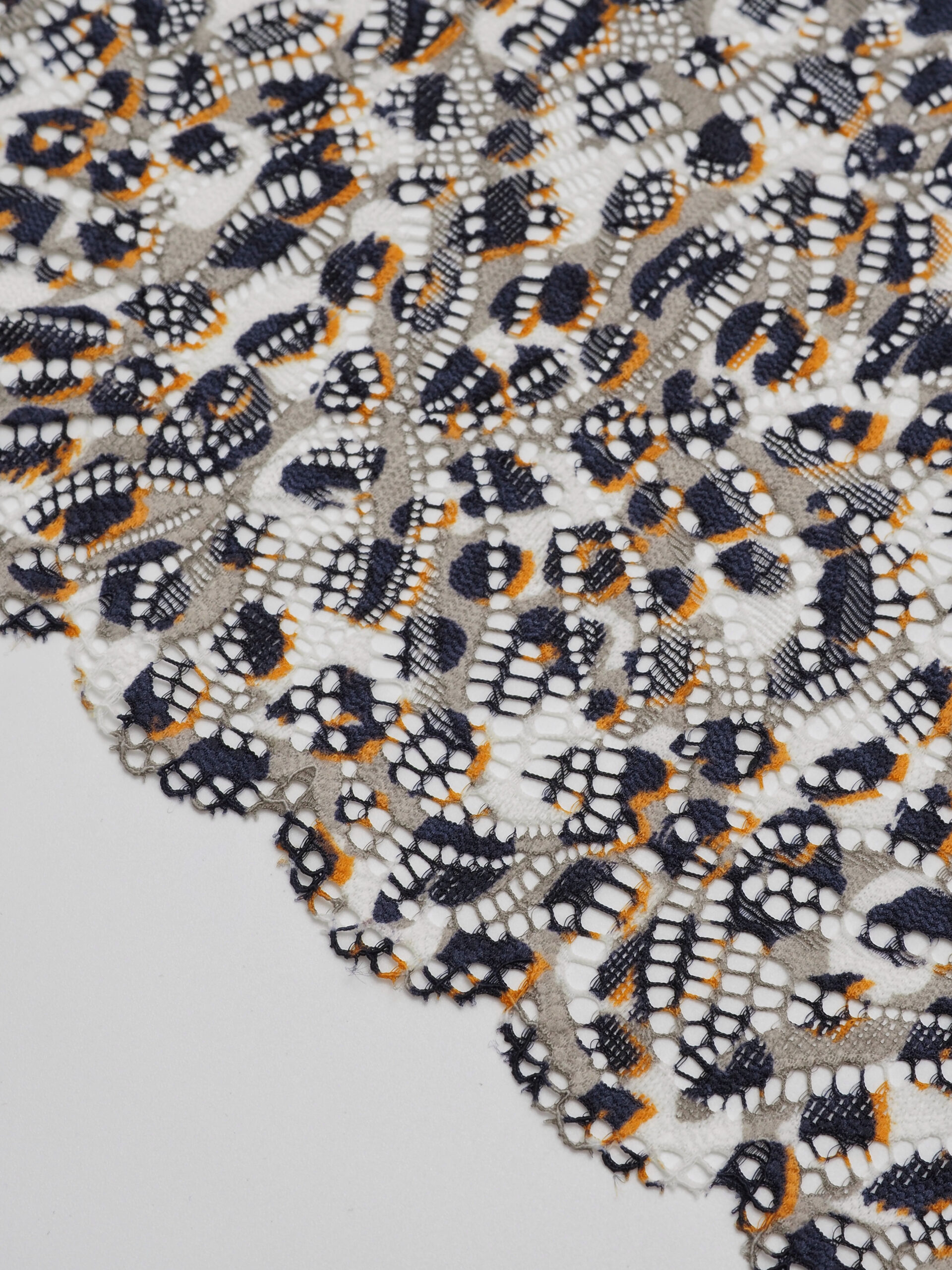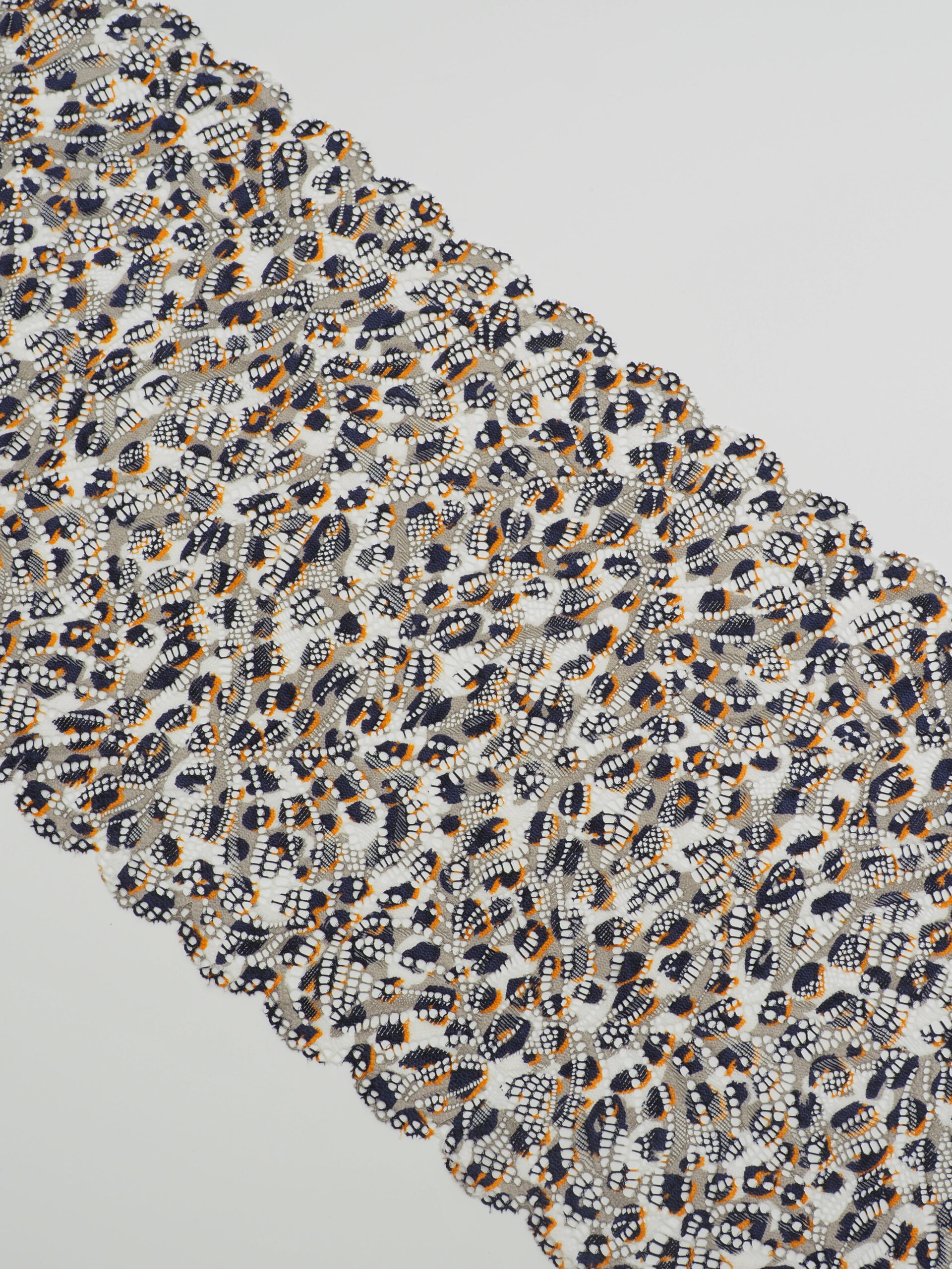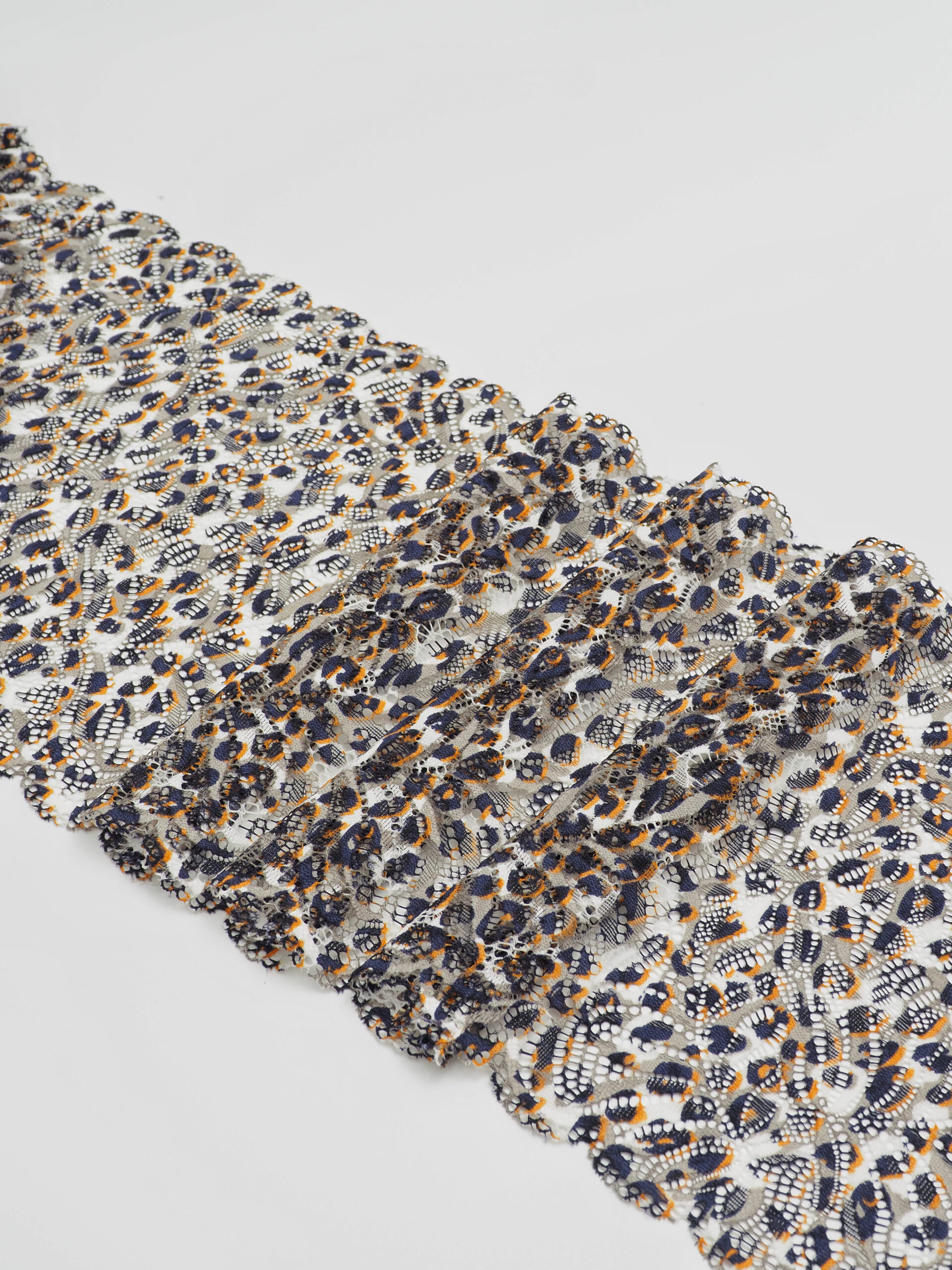 Эластичное кружево леопард белый с оранжевым и темно-синим используется для изготовления разнообразной одежды и предметов декора. Данный материал, как правило, хорошо сохраняет форму, но при этом неплохо тянется. Такие свойства делают его действительно универсальным в применении. Кружево стрейч можно использовать для пошива нижнего белья, чулков, сценических костюмов, элементов декора. С материалом достаточно просто работать - не только профессионалам, но и новичкам.