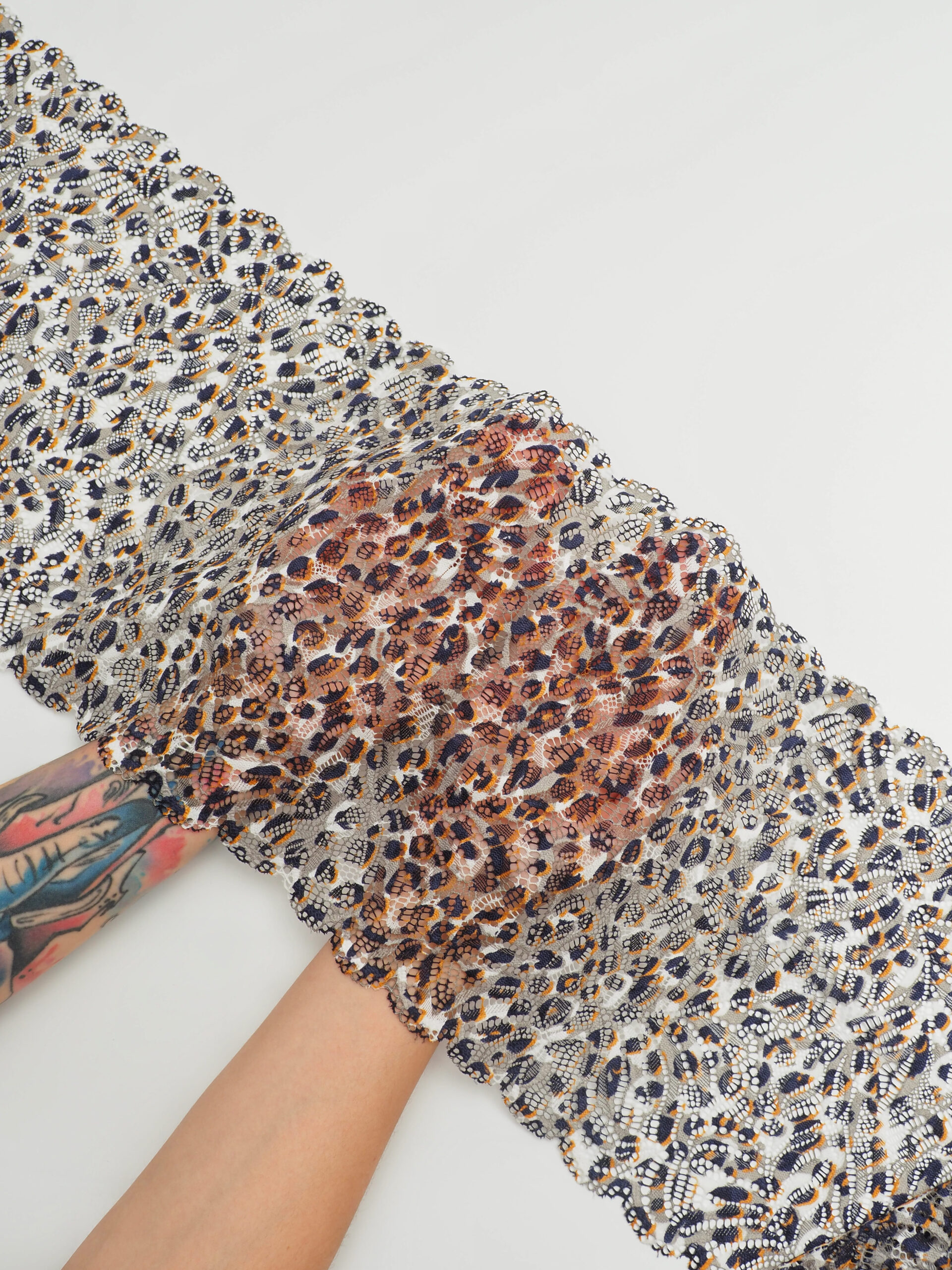 Кружево эластичное белого цвета. Стрейч кружево с леопардовым принтом.