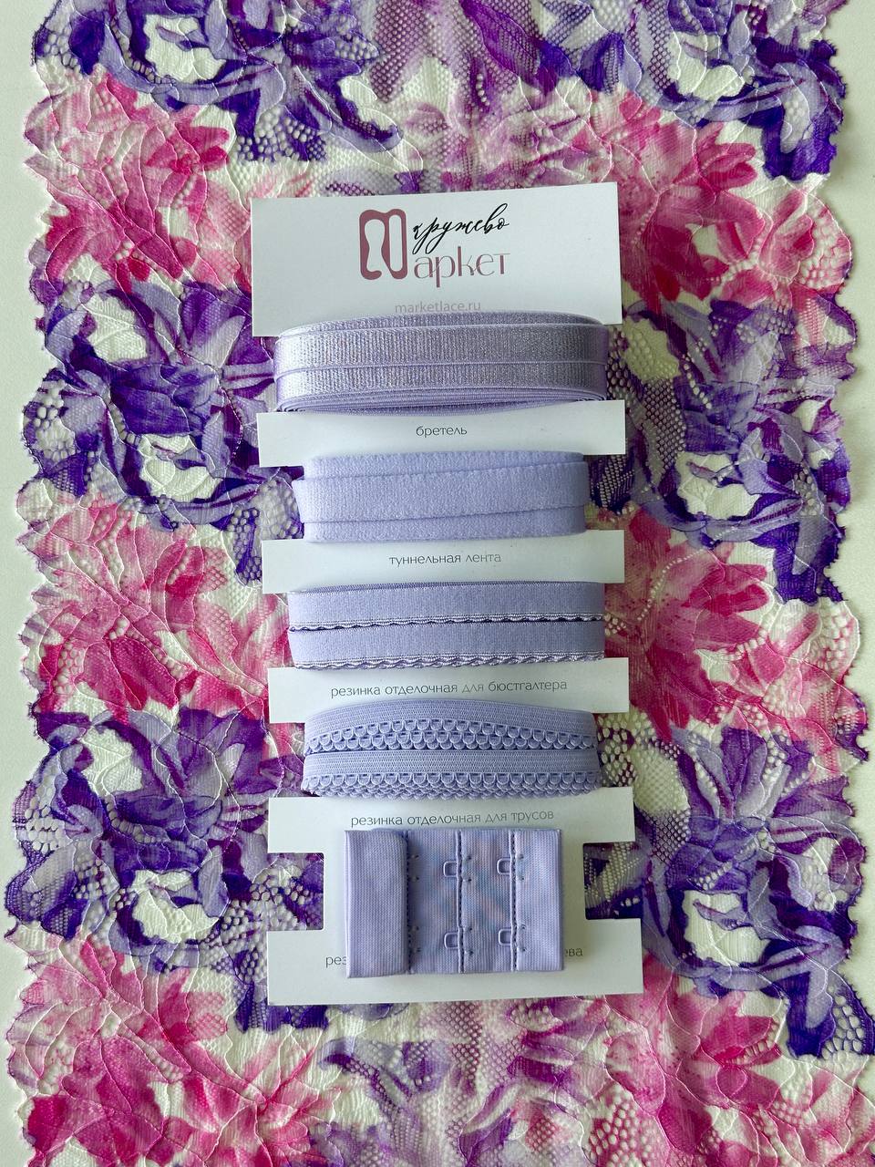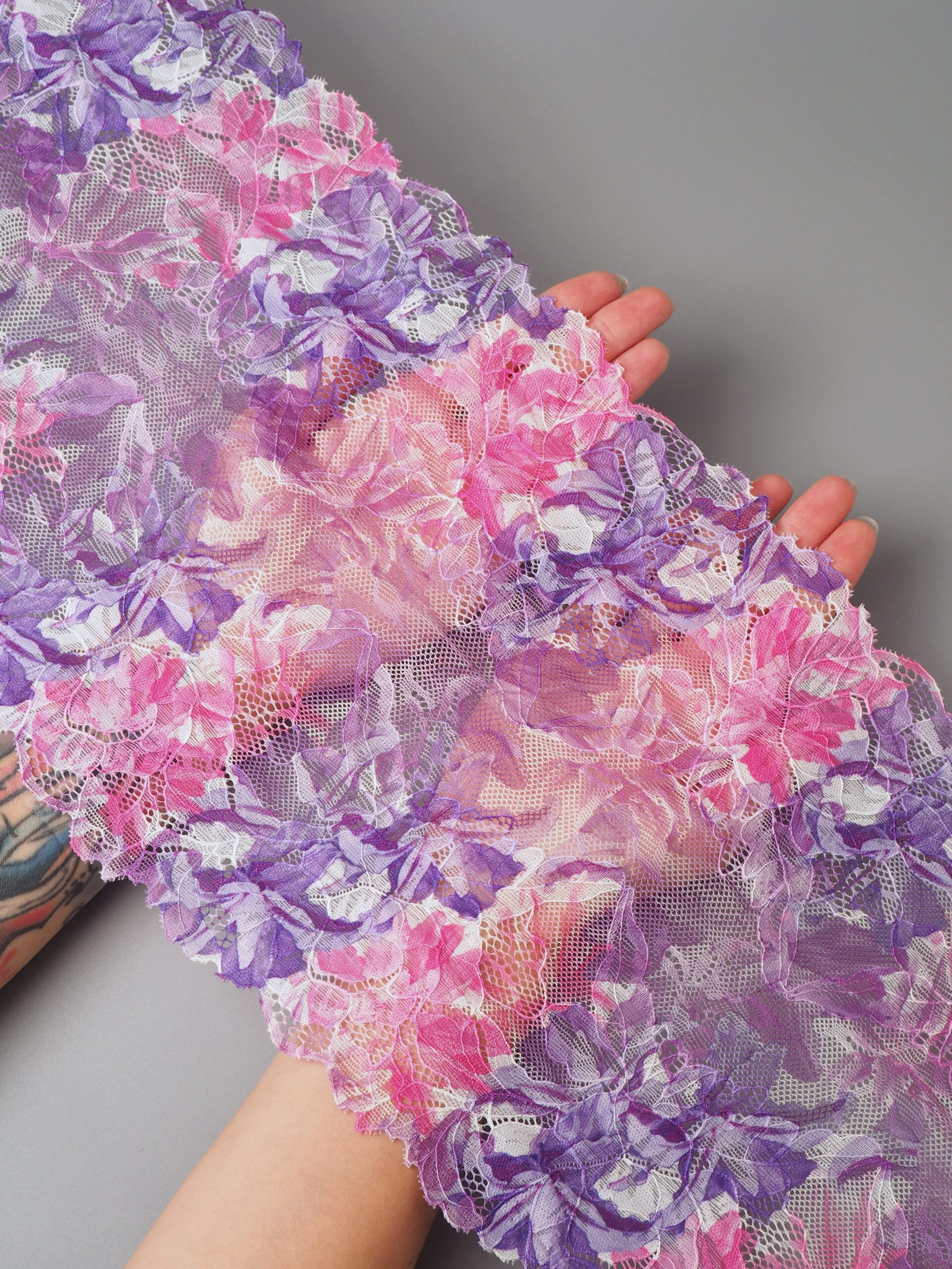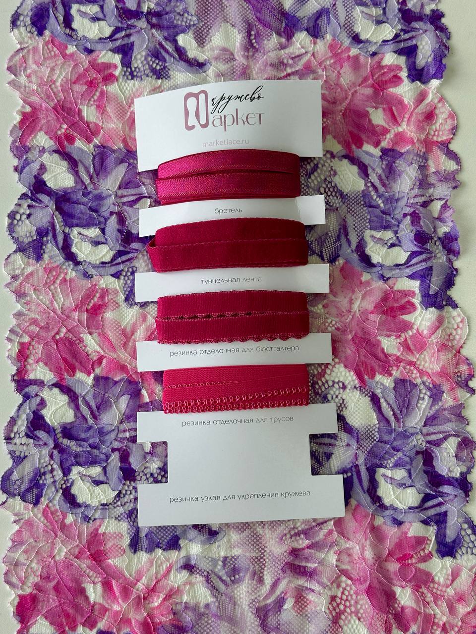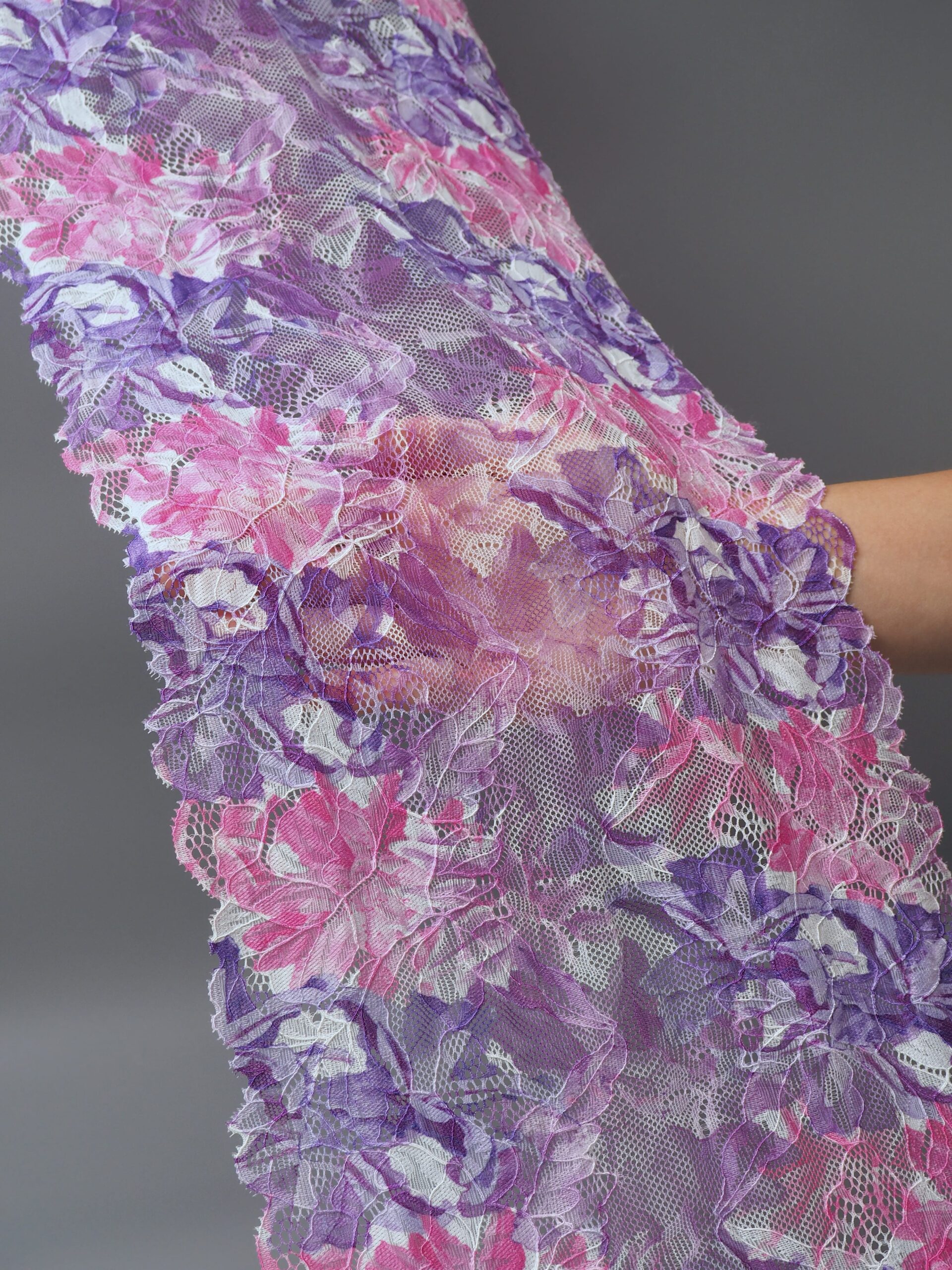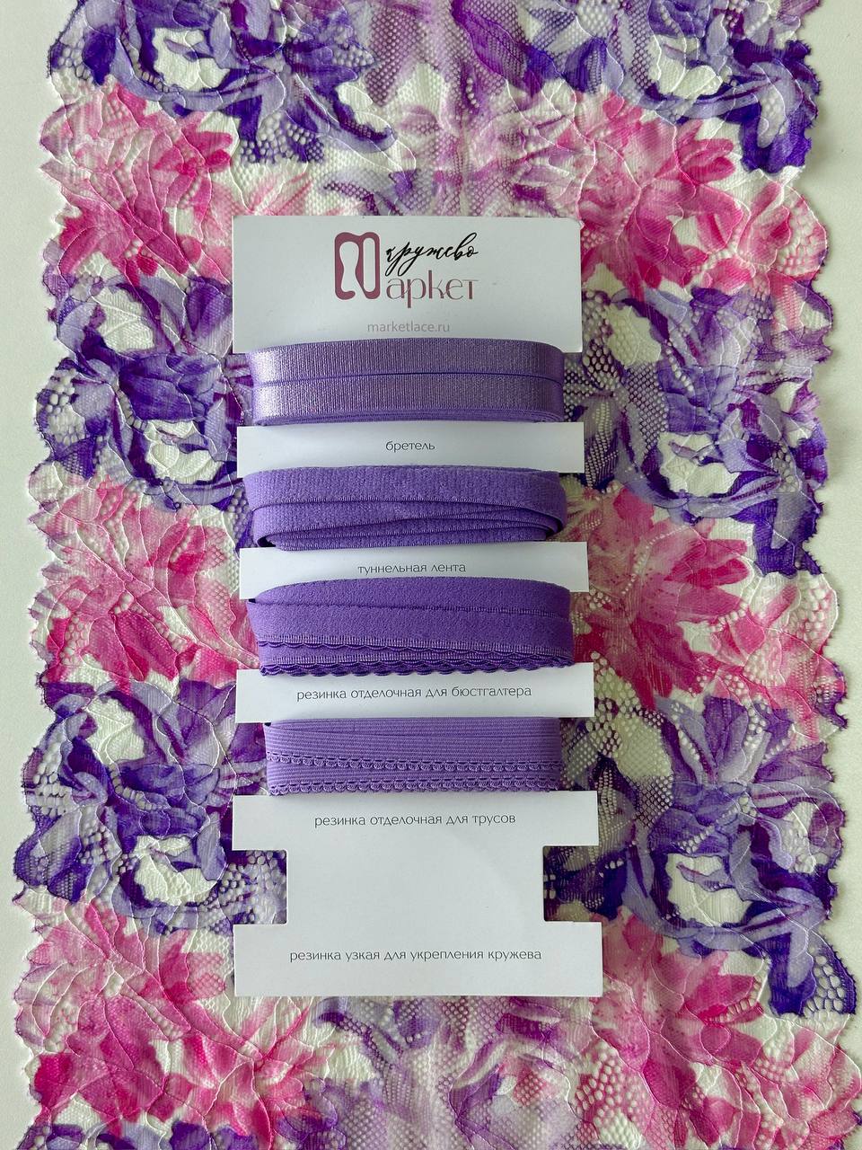 Кружево эластичное фиолетового цвета. Кружево стрейч многоцветное с цветочным рисунком. В тон резинок нет, но орхидея и яркая лаванда смотрятся наиболее органично.
