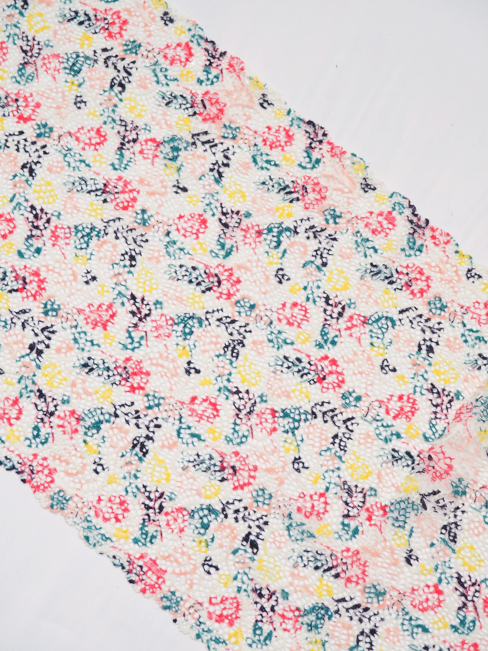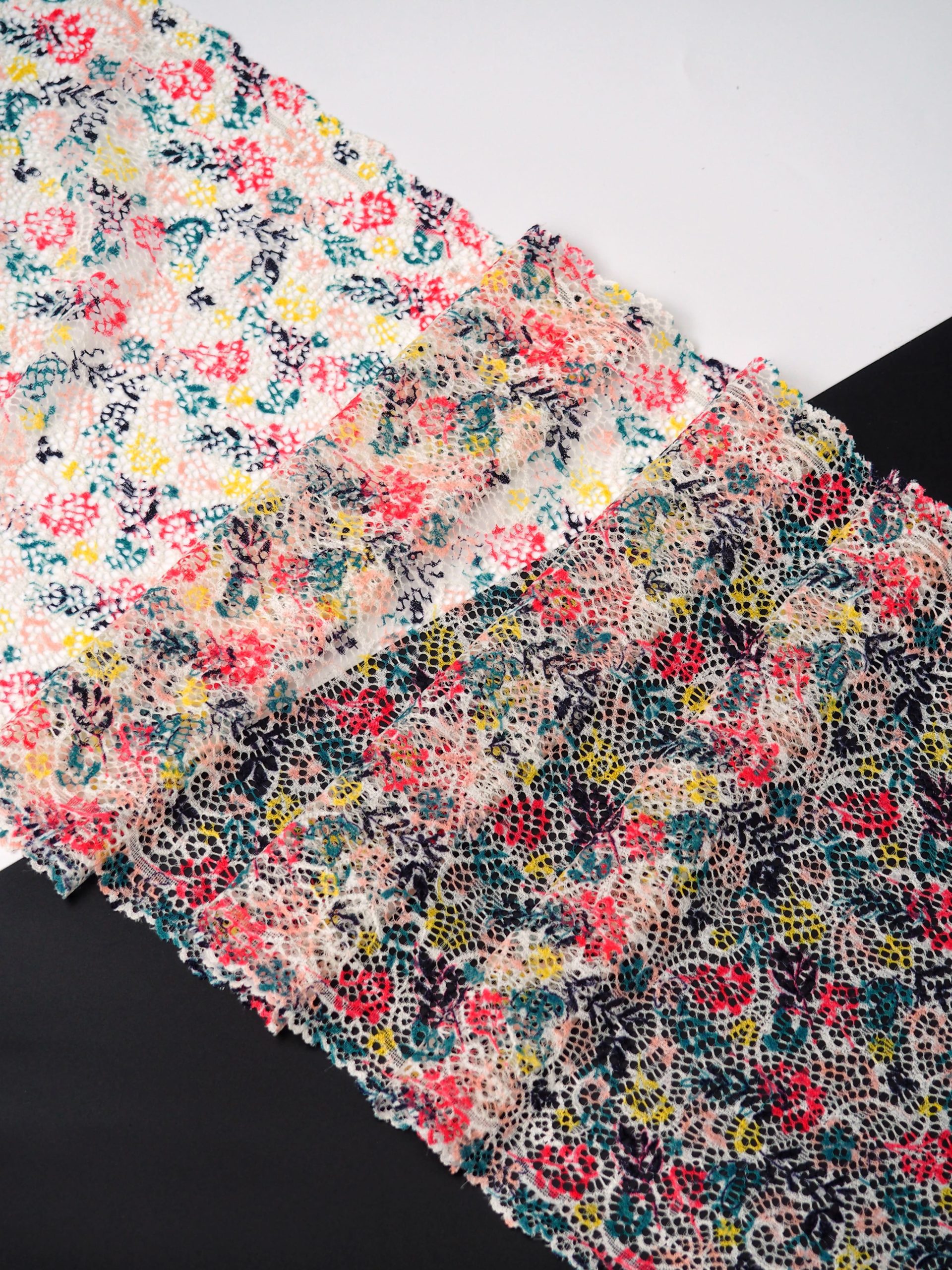 Эластичное кружево мультиколор используется для изготовления разнообразной одежды и предметов декора. Данный материал, как правило, хорошо сохраняет форму, но при этом неплохо тянется. Такие свойства делают его действительно универсальным в применении. Кружево стрейч можно использовать для пошива нижнего белья, чулков, сценических костюмов, элементов декора. С материалом достаточно просто работать - не только профессионалам, но и новичкам.