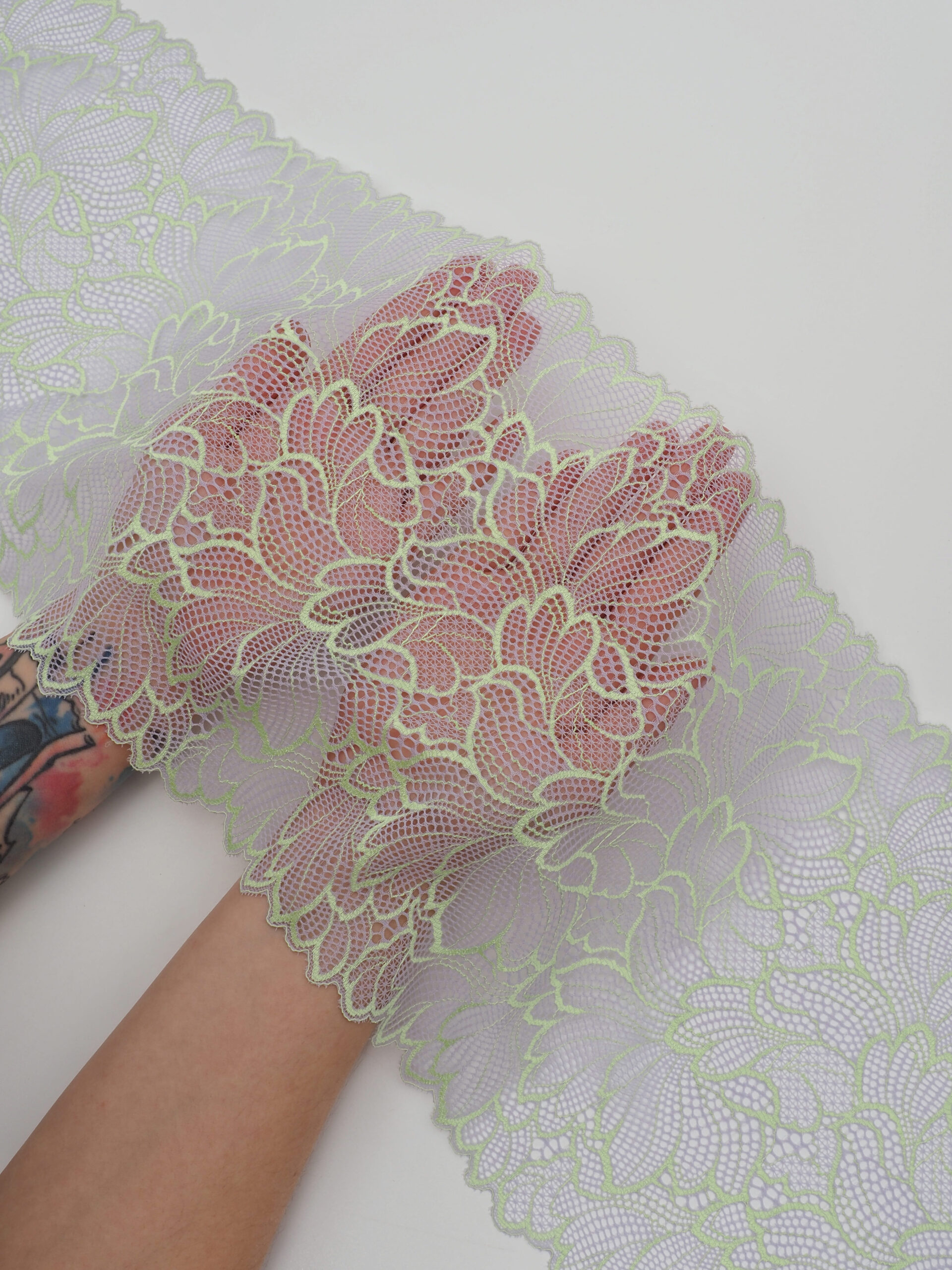 Эластичное кружево орхидея с желто-зеленым неоновым используется для изготовления разнообразной одежды и предметов декора. Данный материал, как правило, хорошо сохраняет форму, но при этом неплохо тянется. Такие свойства делают его действительно универсальным в применении. Кружево стрейч можно использовать для пошива нижнего белья, чулков, сценических костюмов, элементов декора. С материалом достаточно просто работать - не только профессионалам, но и новичкам.