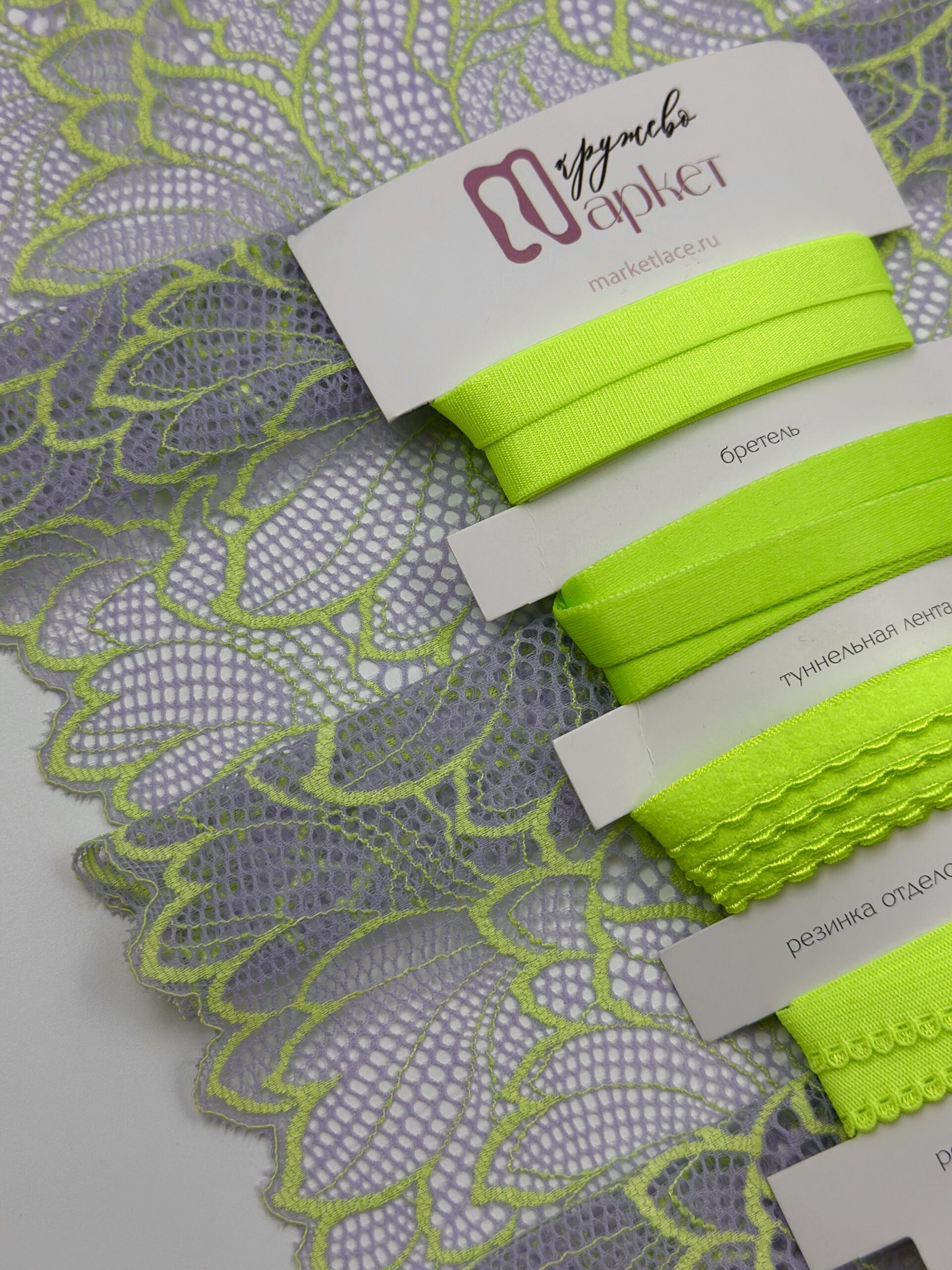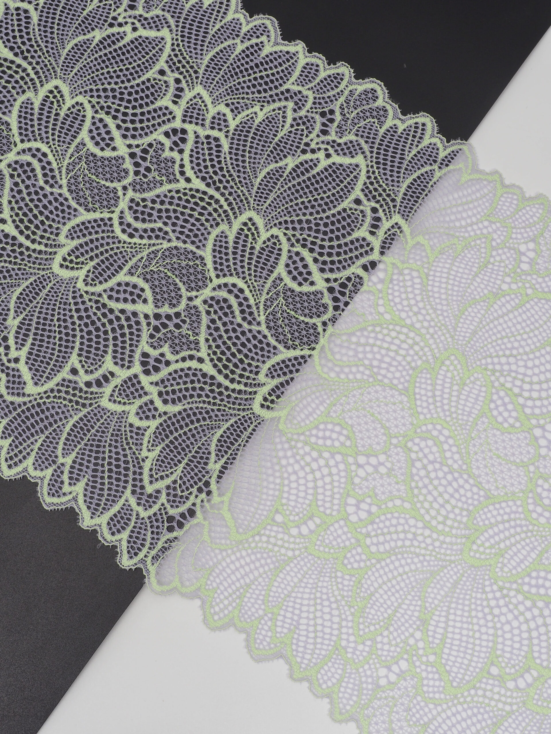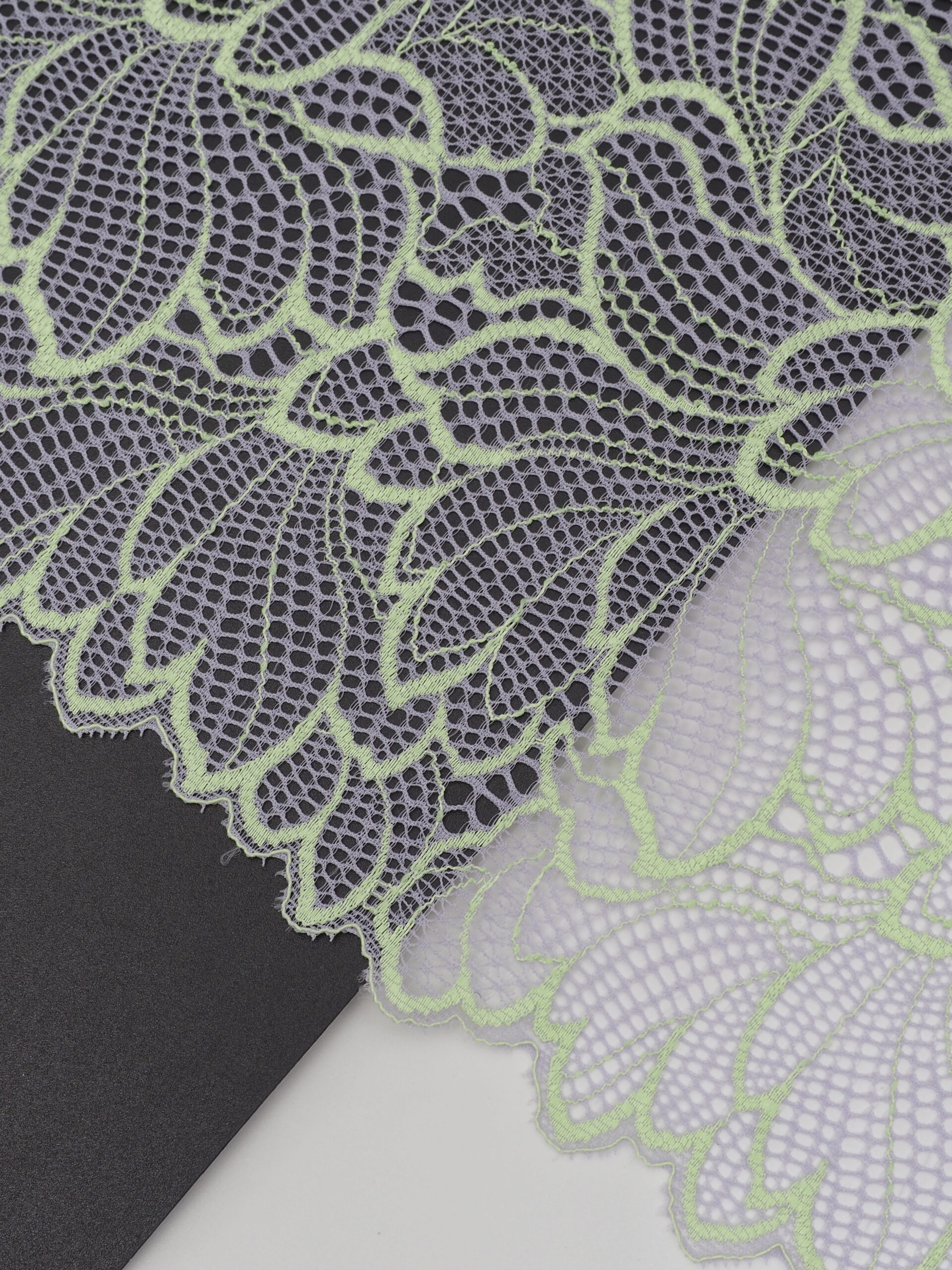Кружево эластичное фиолетового цвета. Стрейч кружево цвета орхидеи с зеленым узором.