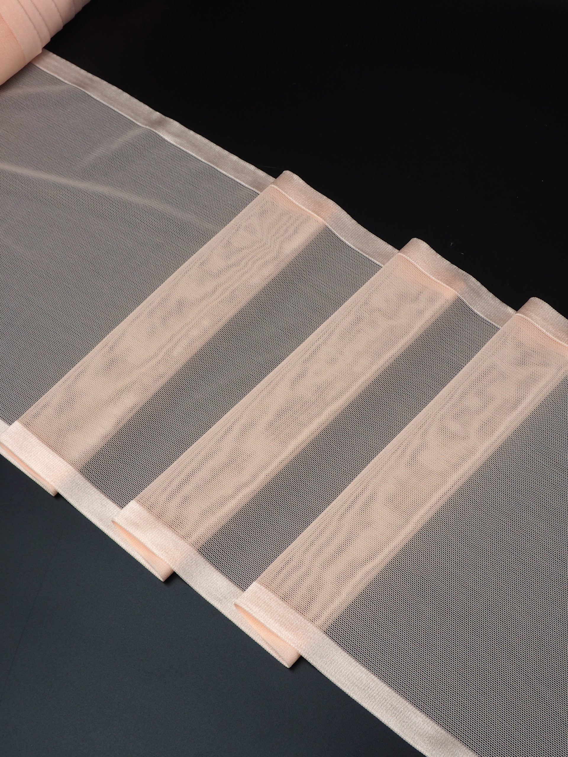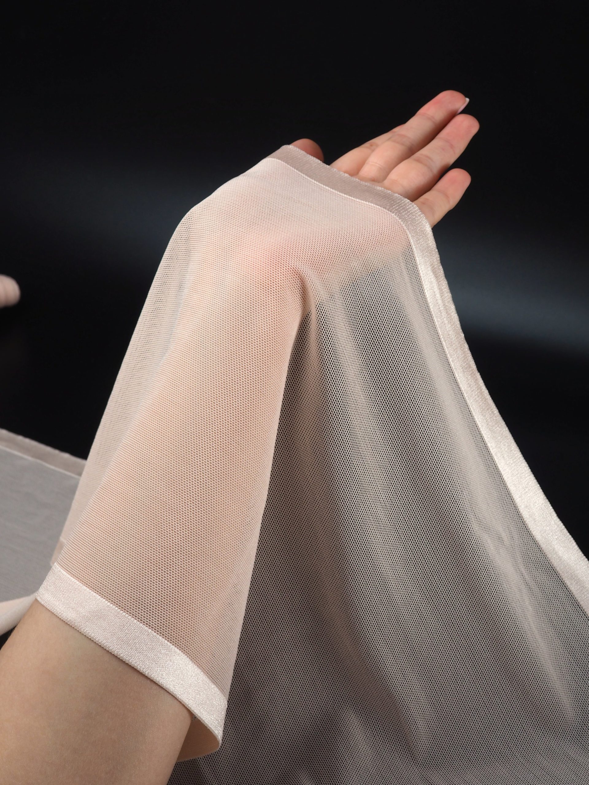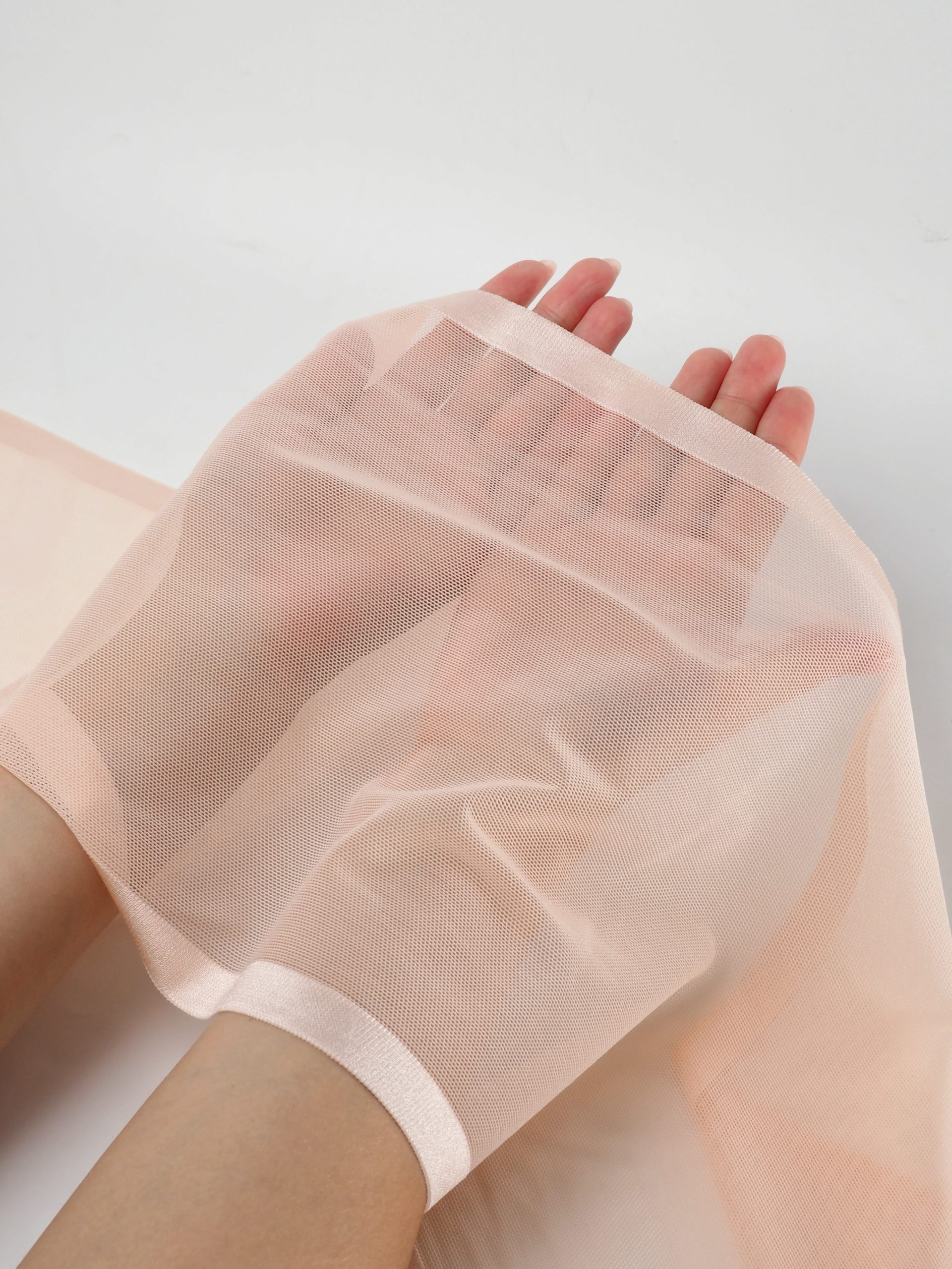 Кружево эластичное стрейч персикового оттенка. В стрейч сетку мелкая ячейка.
