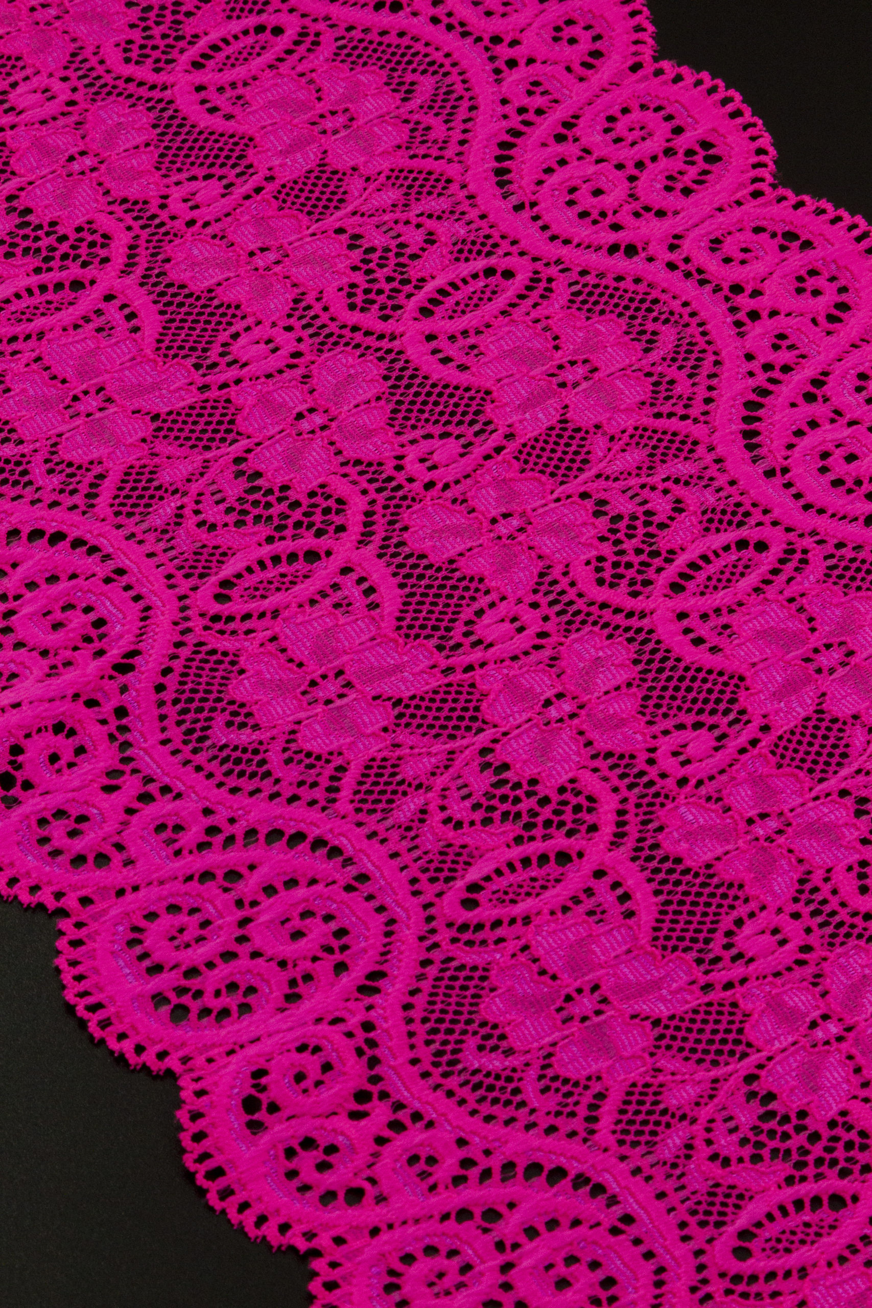 Эластичное кружево розовое неоновое используется для изготовления разнообразной одежды и предметов декора. Данный материал, как правило, хорошо сохраняет форму, но при этом неплохо тянется. Такие свойства делают его действительно универсальным в применении. Кружево стрейч можно использовать для пошива нижнего белья, чулков, сценических костюмов, элементов декора. С материалом достаточно просто работать - не только профессионалам, но и новичкам.