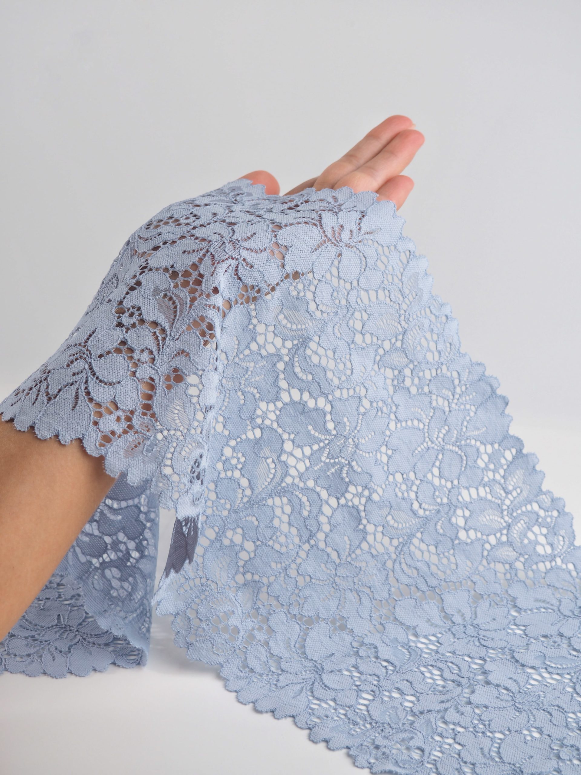 Эластичное кружево серо-голубое используется для изготовления разнообразной одежды и предметов декора. Данный материал, как правило, хорошо сохраняет форму, но при этом неплохо тянется. Такие свойства делают его действительно универсальным в применении. Кружево стрейч можно использовать для пошива нижнего белья, чулков, сценических костюмов, элементов декора. С материалом достаточно просто работать - не только профессионалам, но и новичкам.
