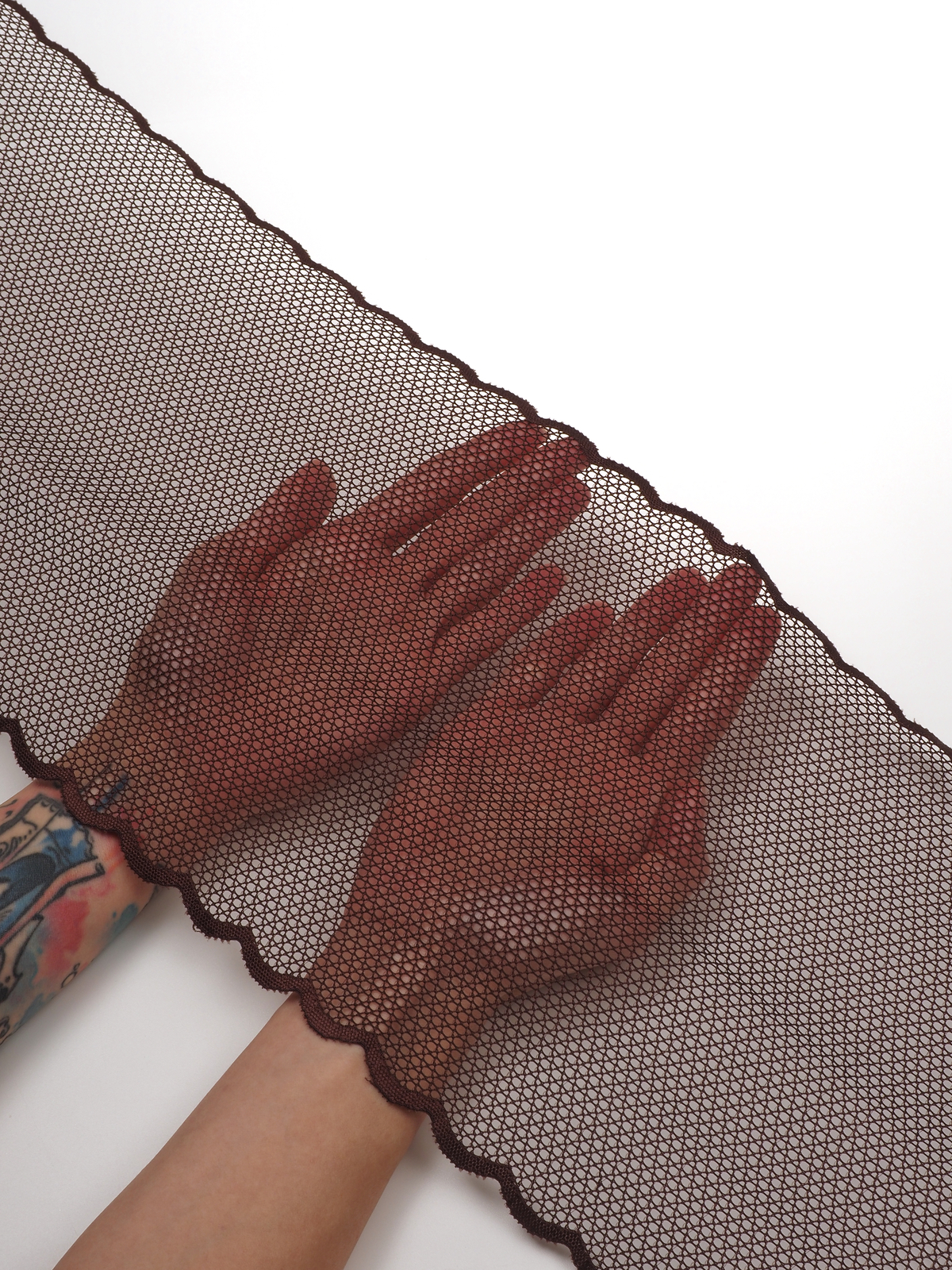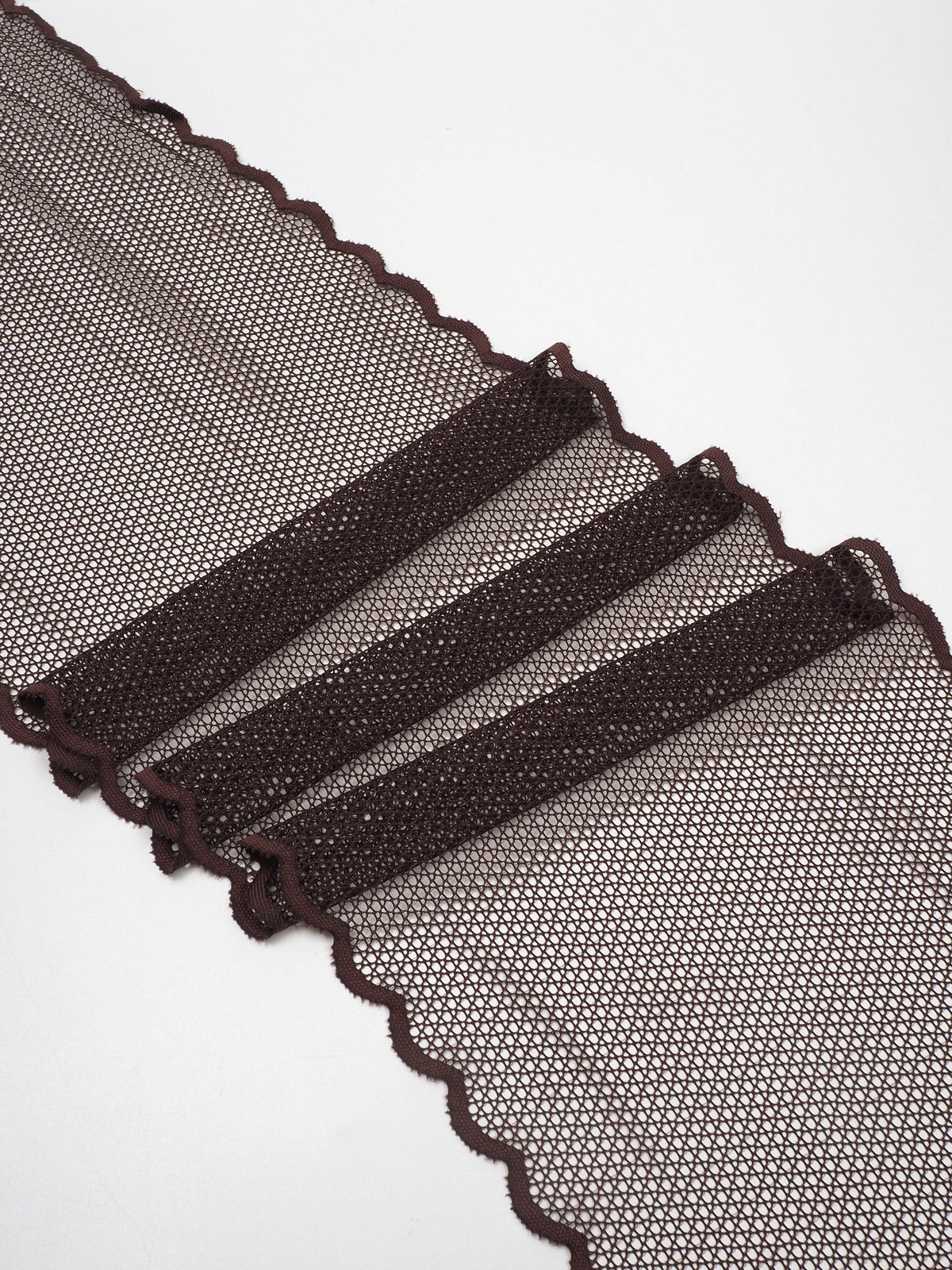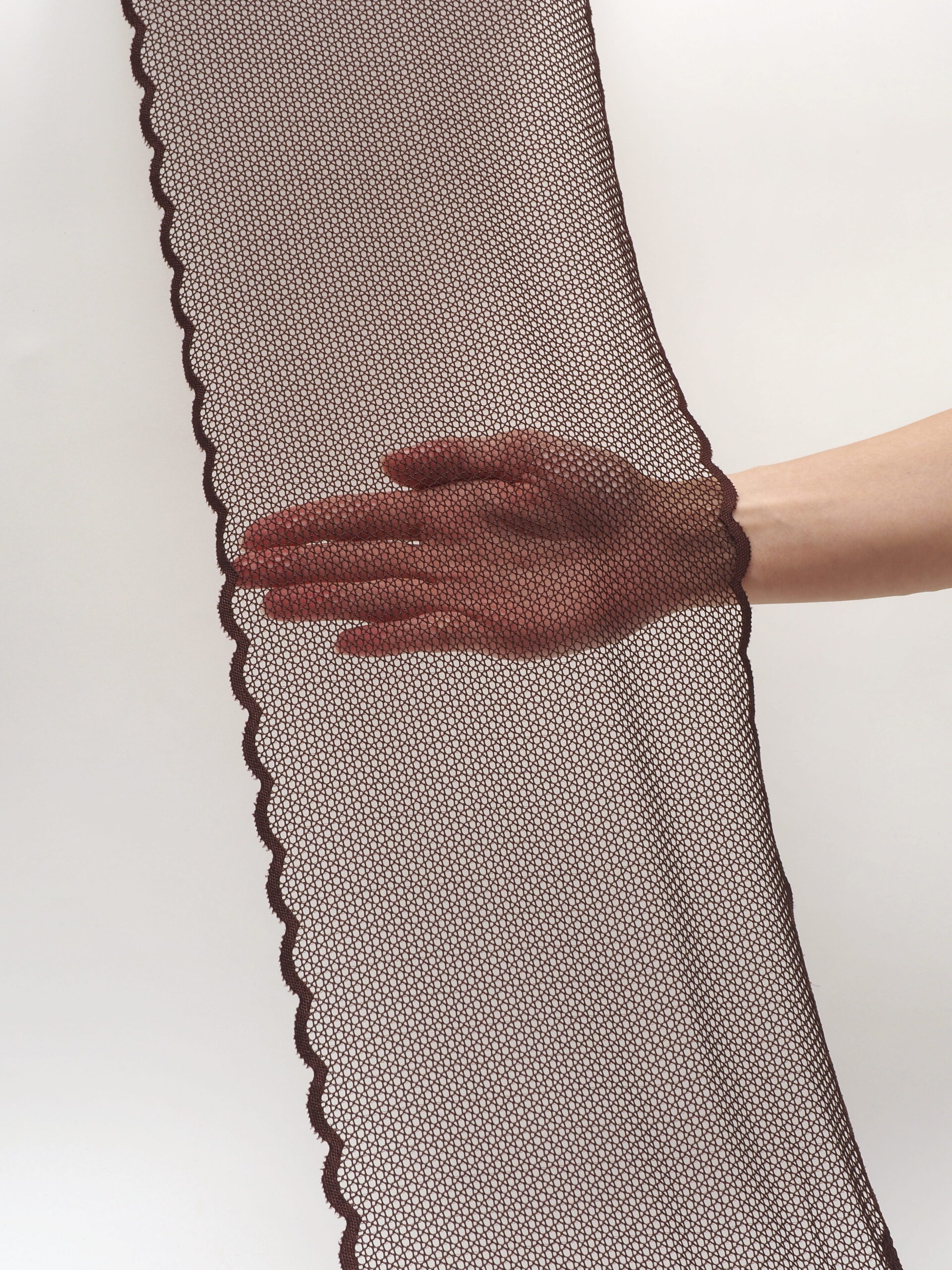 Изысканное стрейч кружево в коричневом цвете станет идеальным выбором для создания роскошного нижнего белья. Ширина полотна позволяет использовать материал как для декоративных элементов, так и для основного кроя.