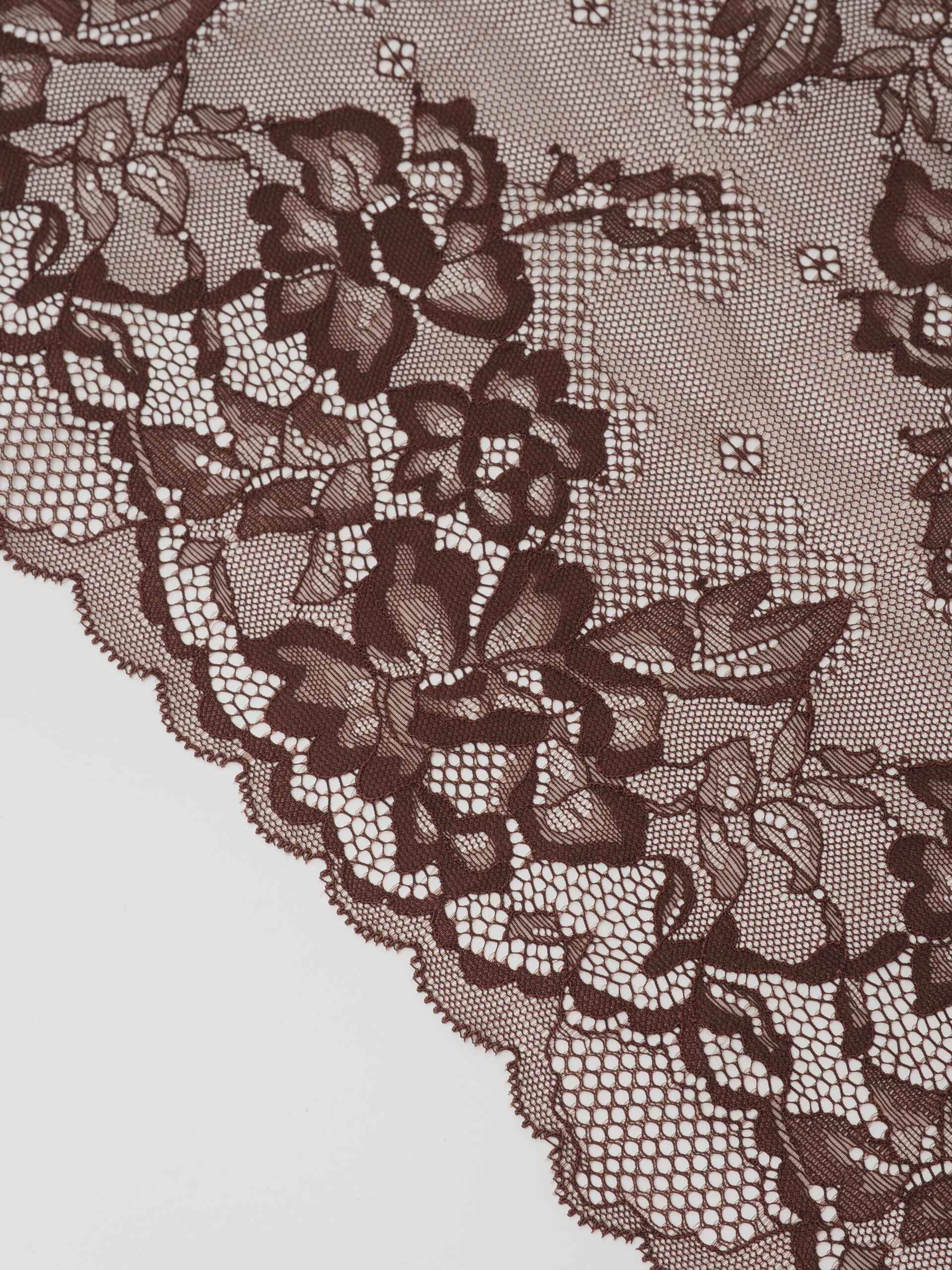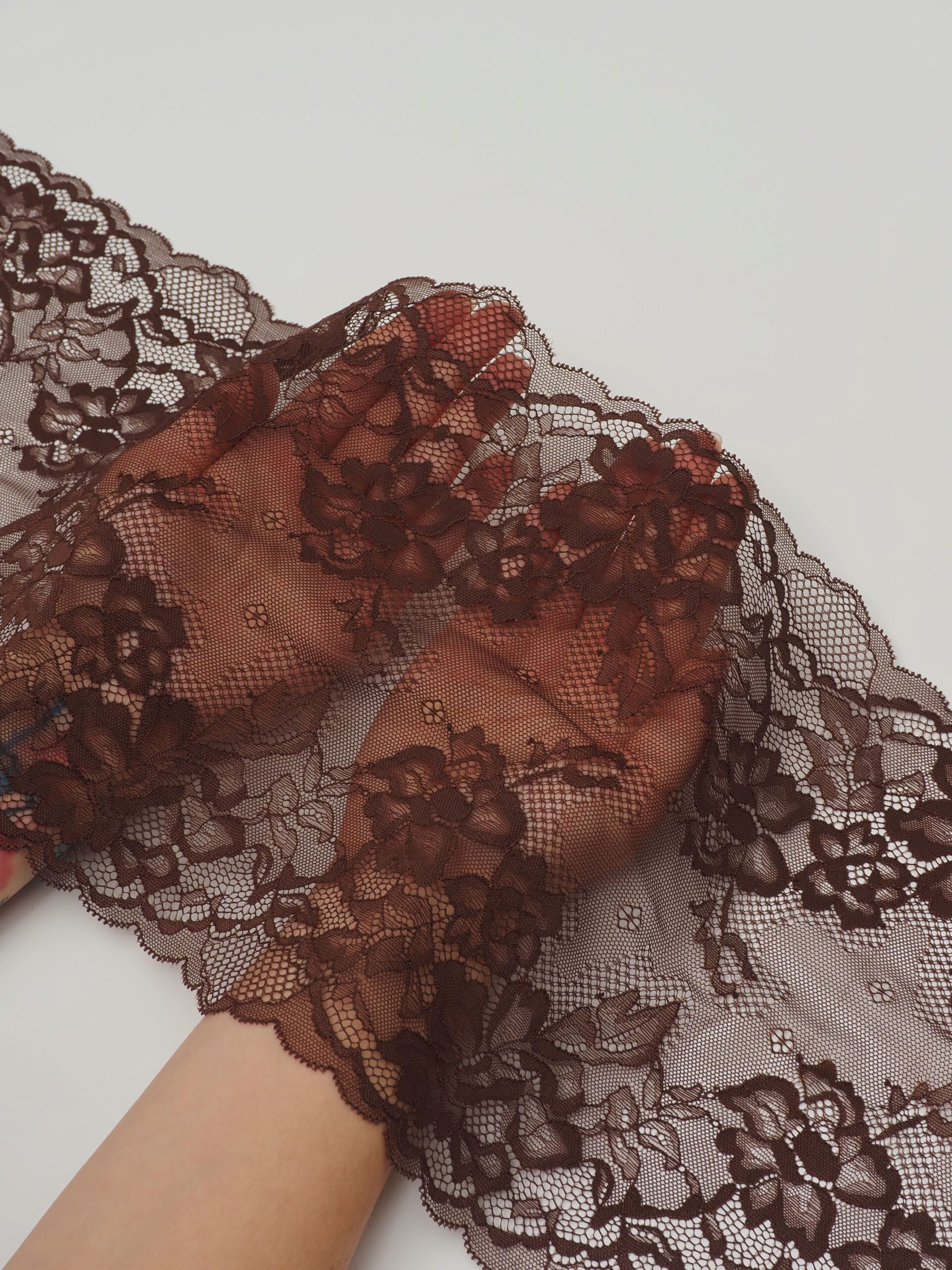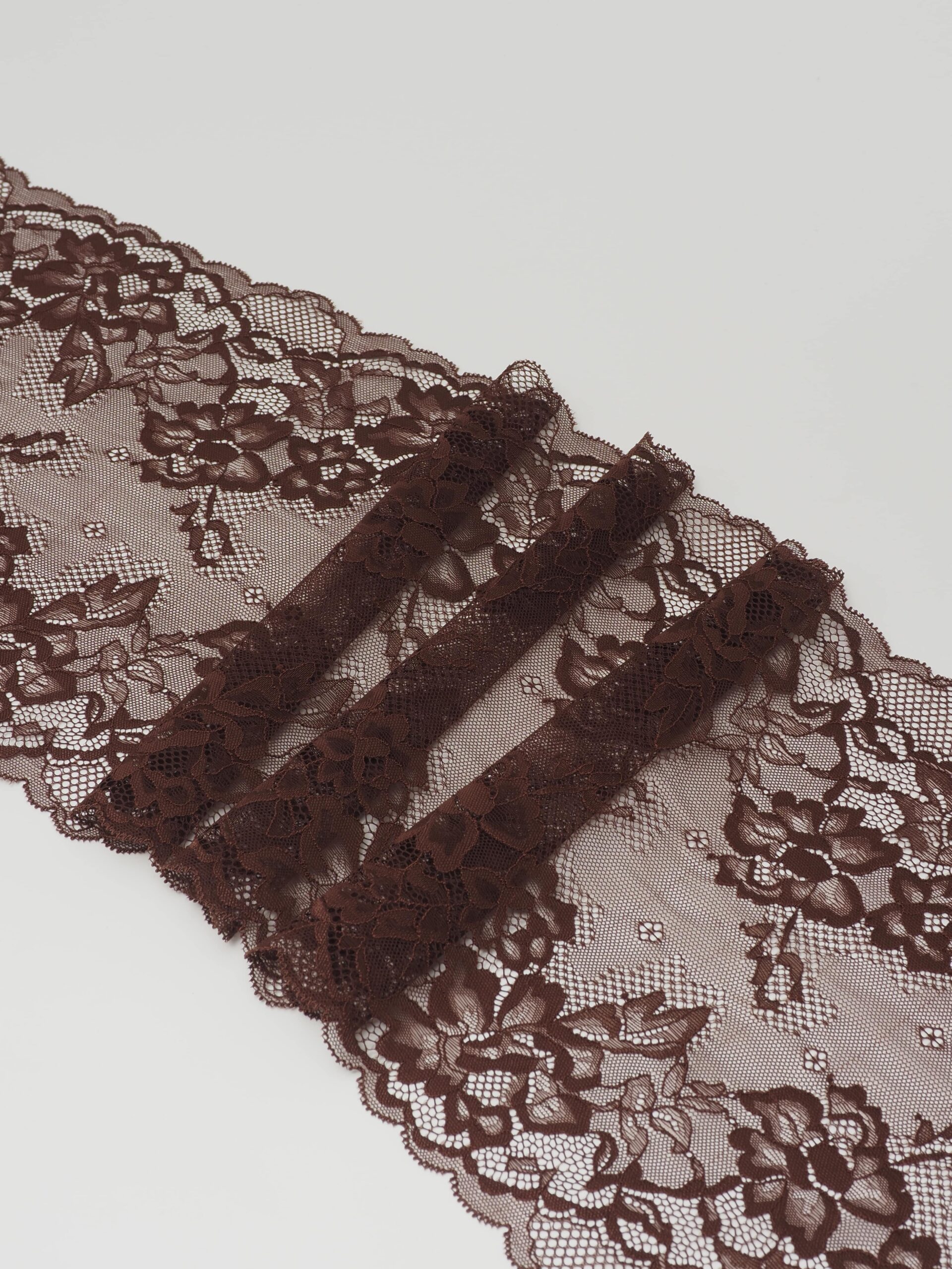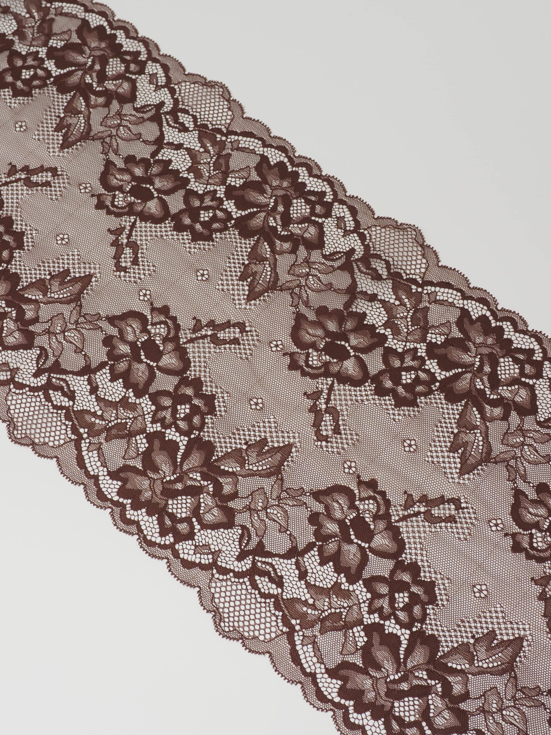 Кружево эластичное коричневое. Стрейч кружево шоколадное с цветочным узором.