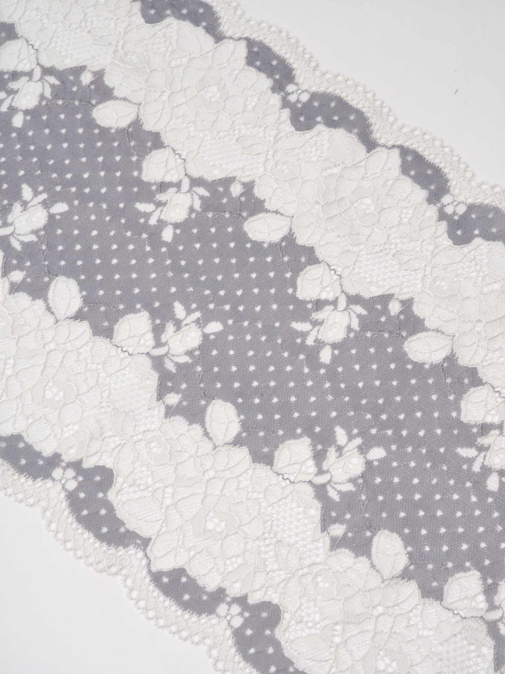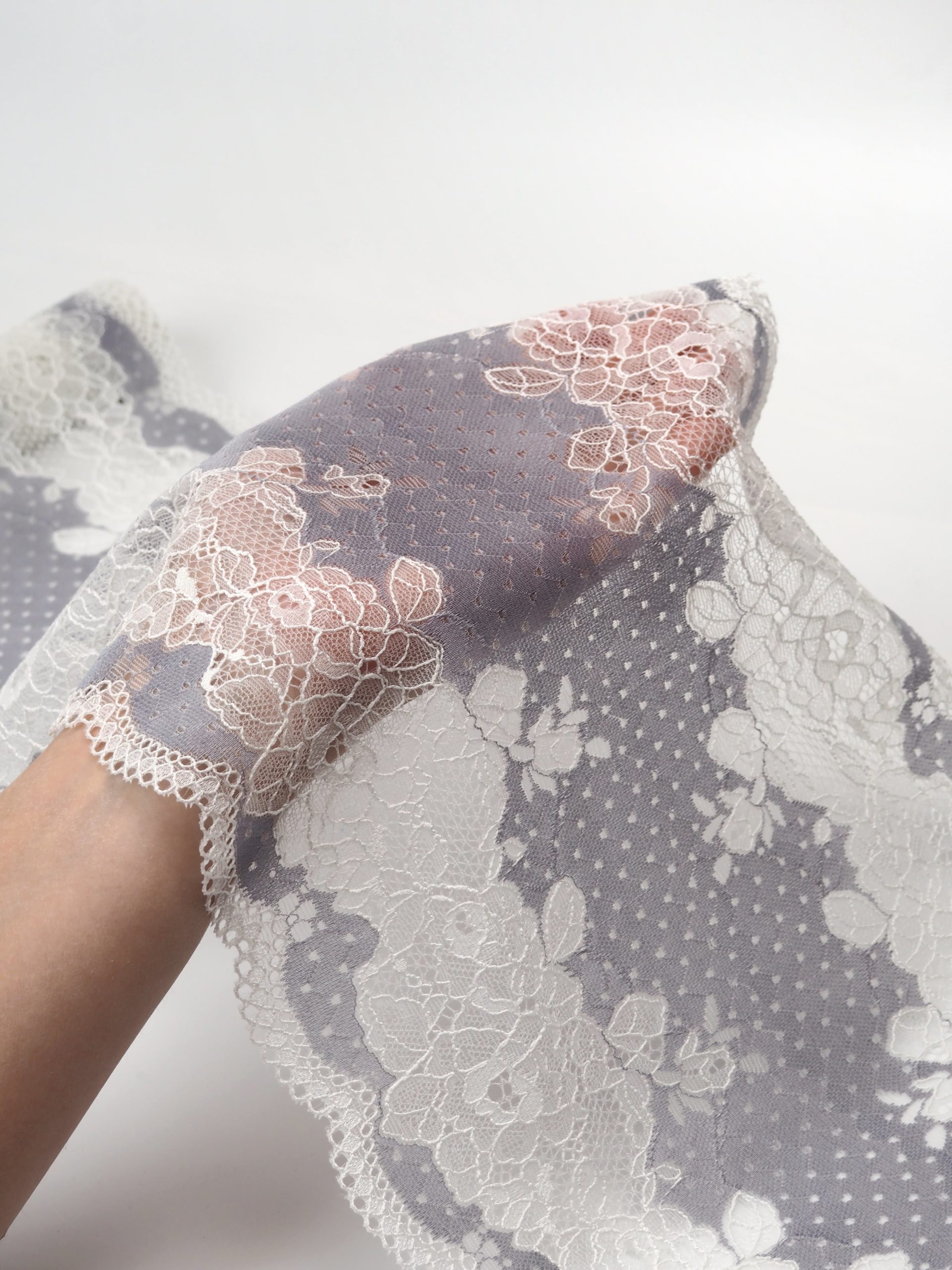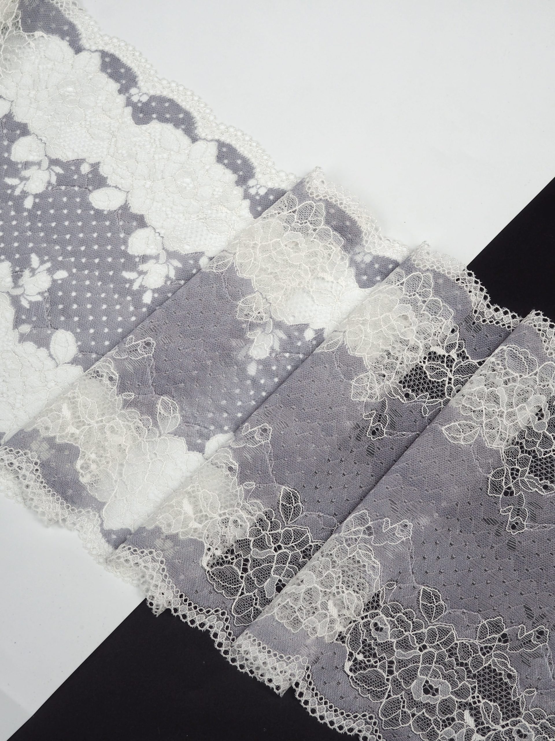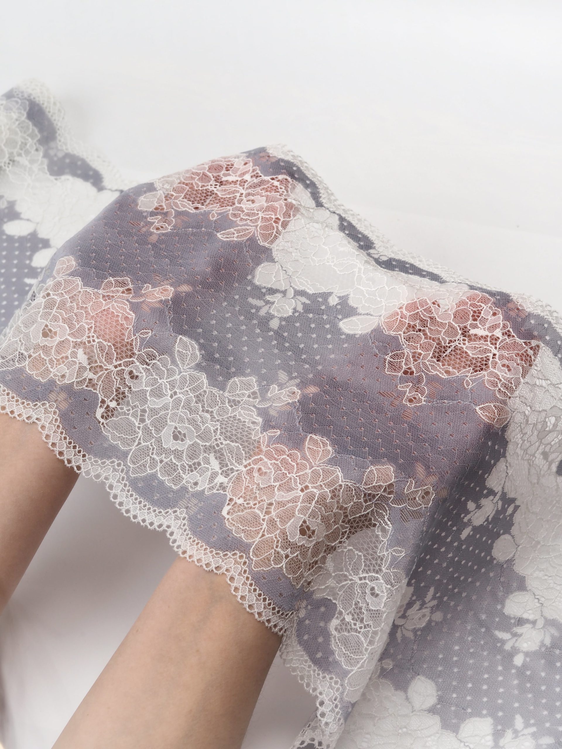 Кружево эластичное серого и кремового цвета. Стрейч кружево синевато-серое с кремовым цветочным рисунком.