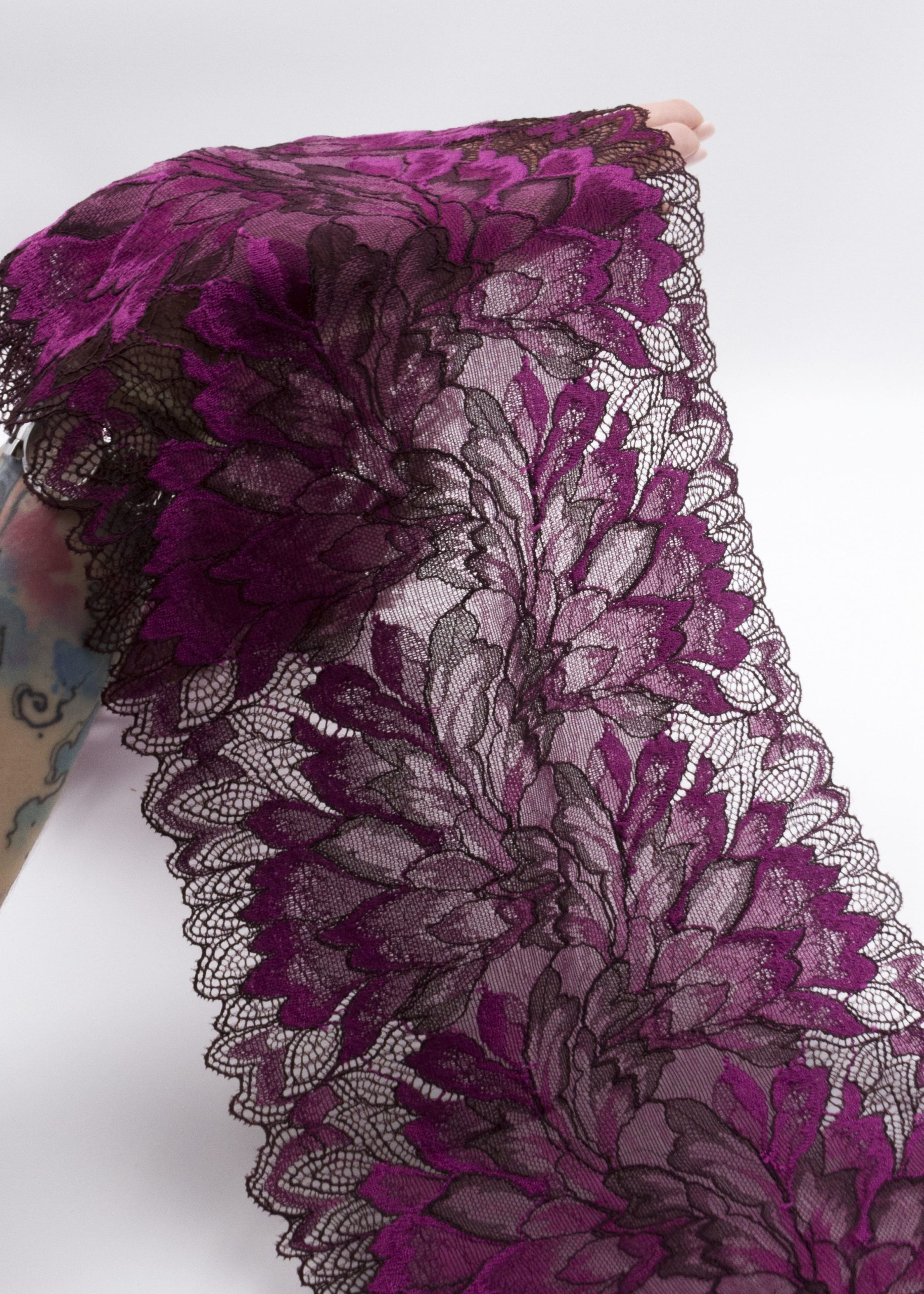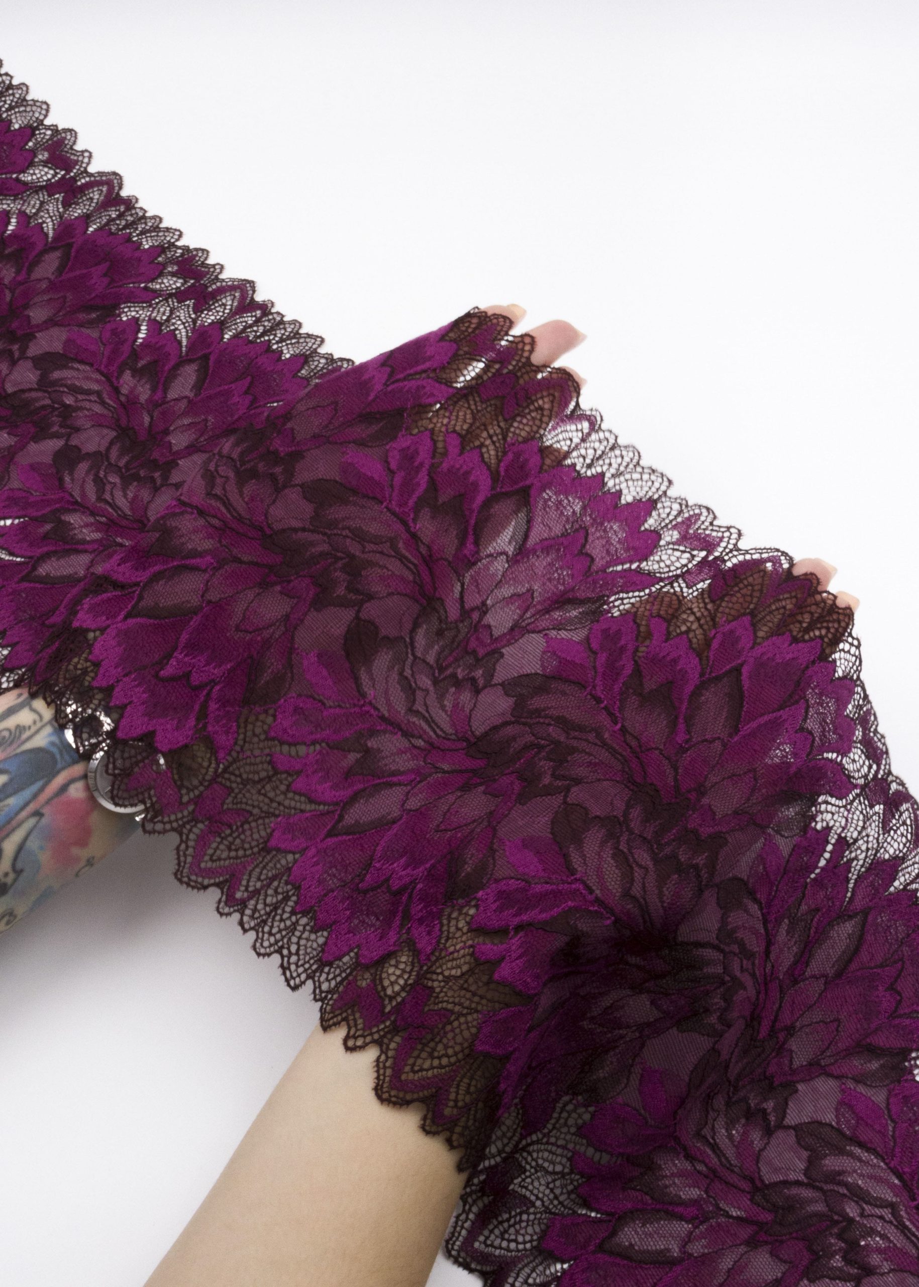 Кружево эластичное фиолетового цвета. Кружево стрейч сливовое с цветочным рисунком.