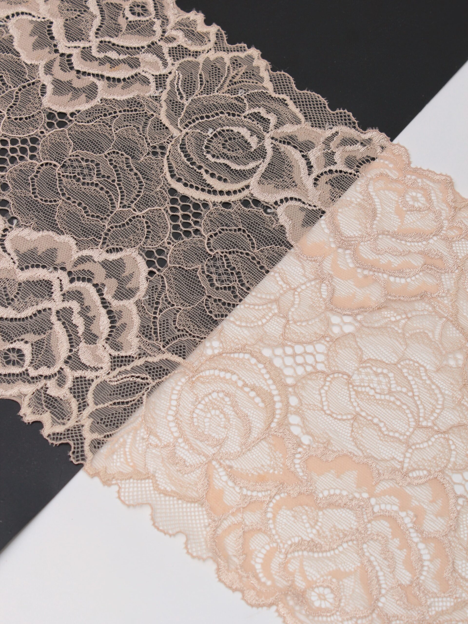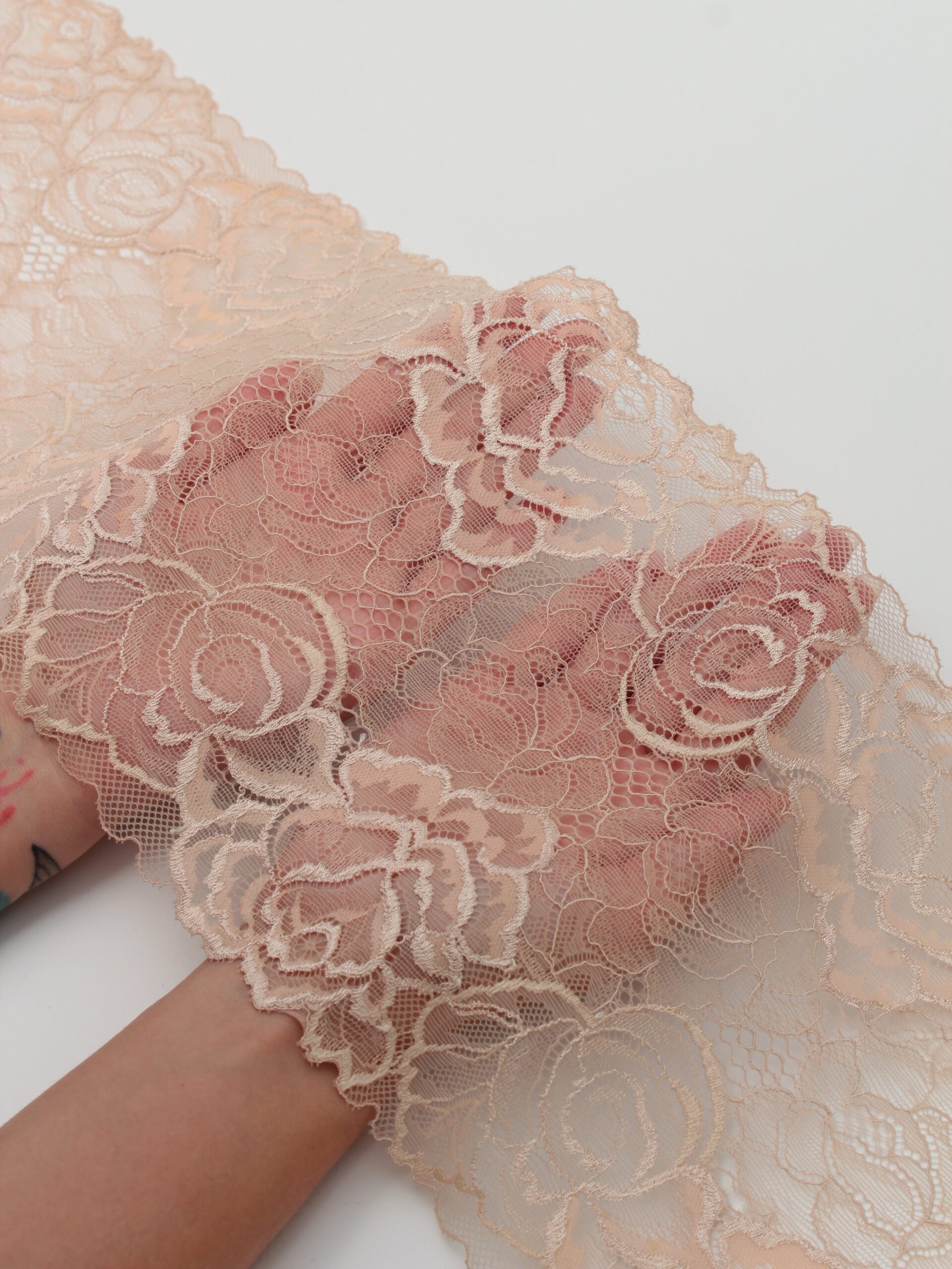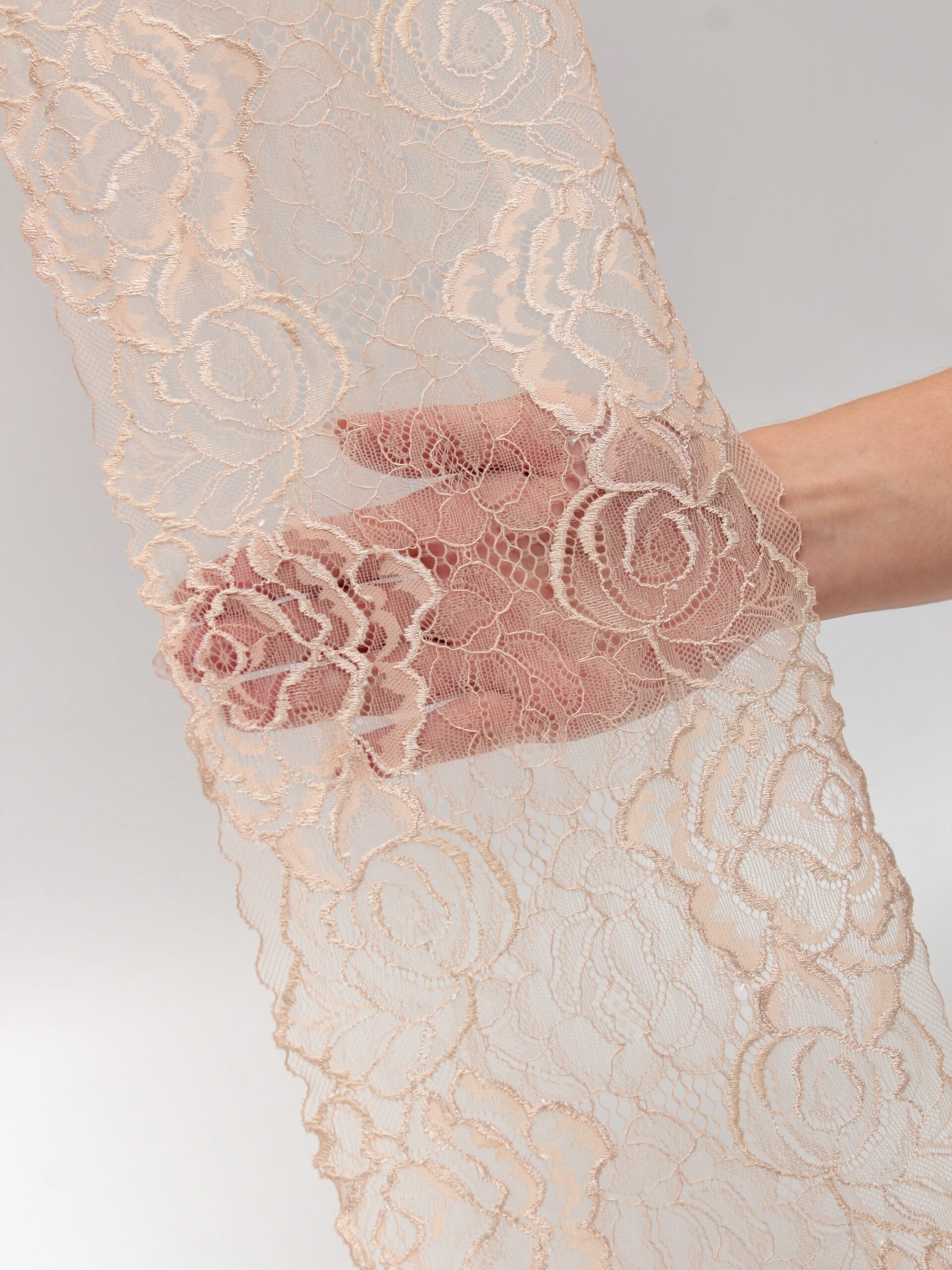 Кружево эластичное бежевого цвета. Тонкое стрейч кружево телесного оттенка с цветочным рисунком.
