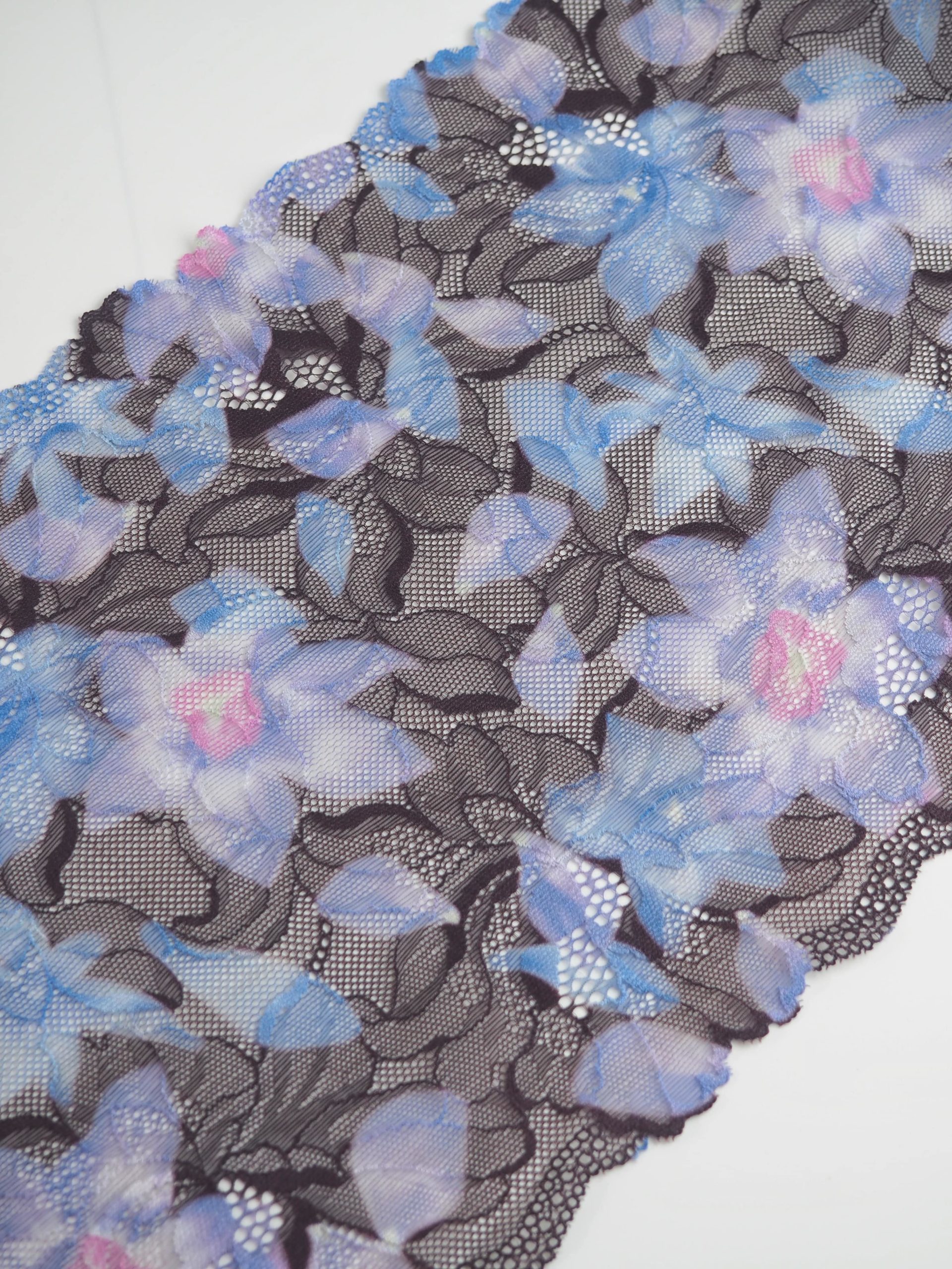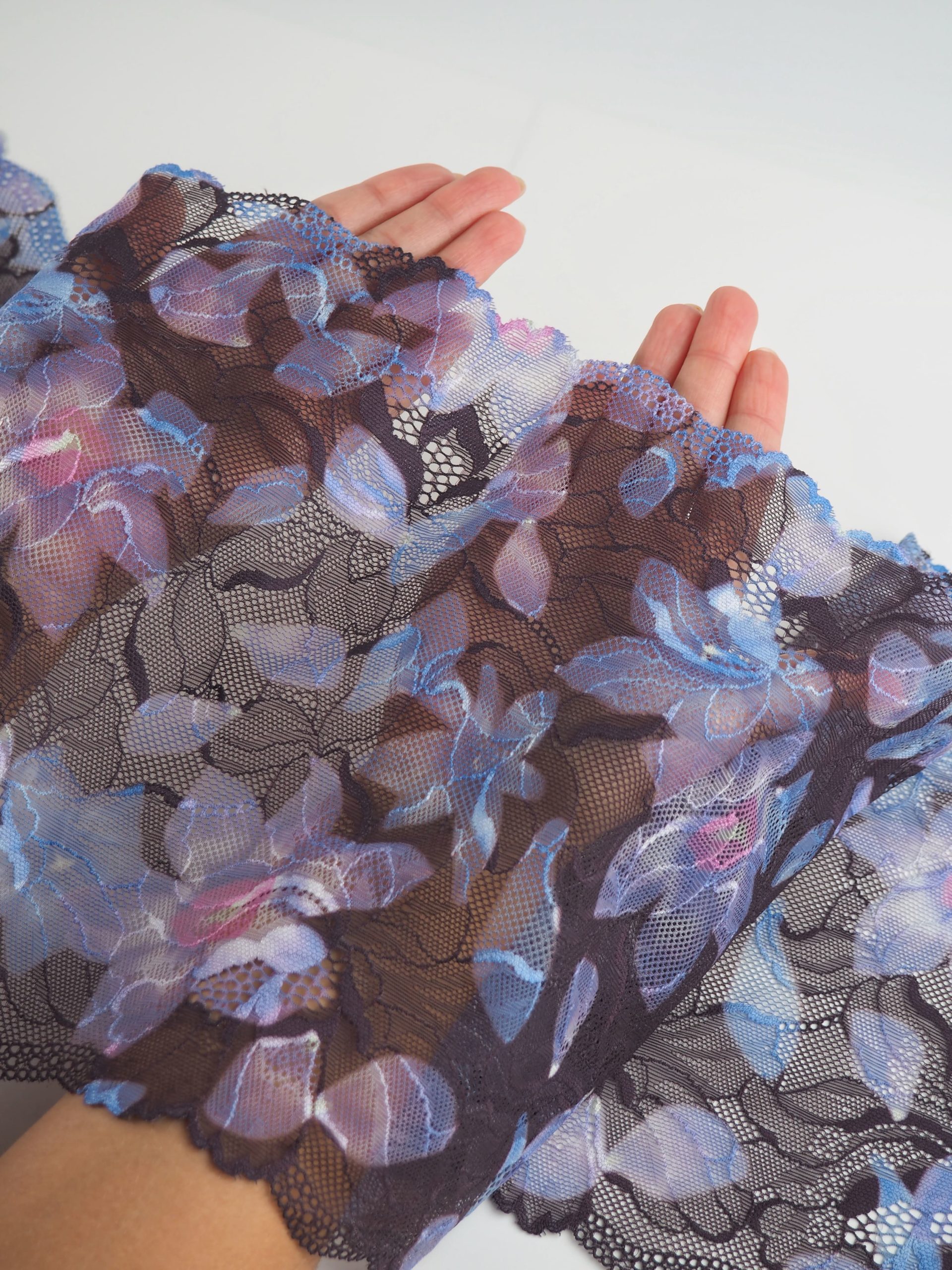 Кружево эластичное коричневое. Кружево стрейч темно-коричневое с мультиколор с цветочным рисунком.