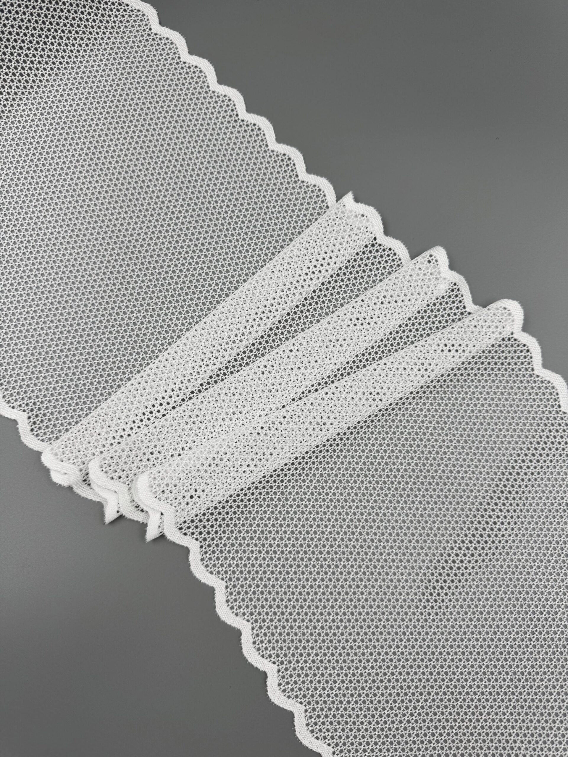 Кружево эластичное стрейч белого оттенка в сетку крупная ячейка.