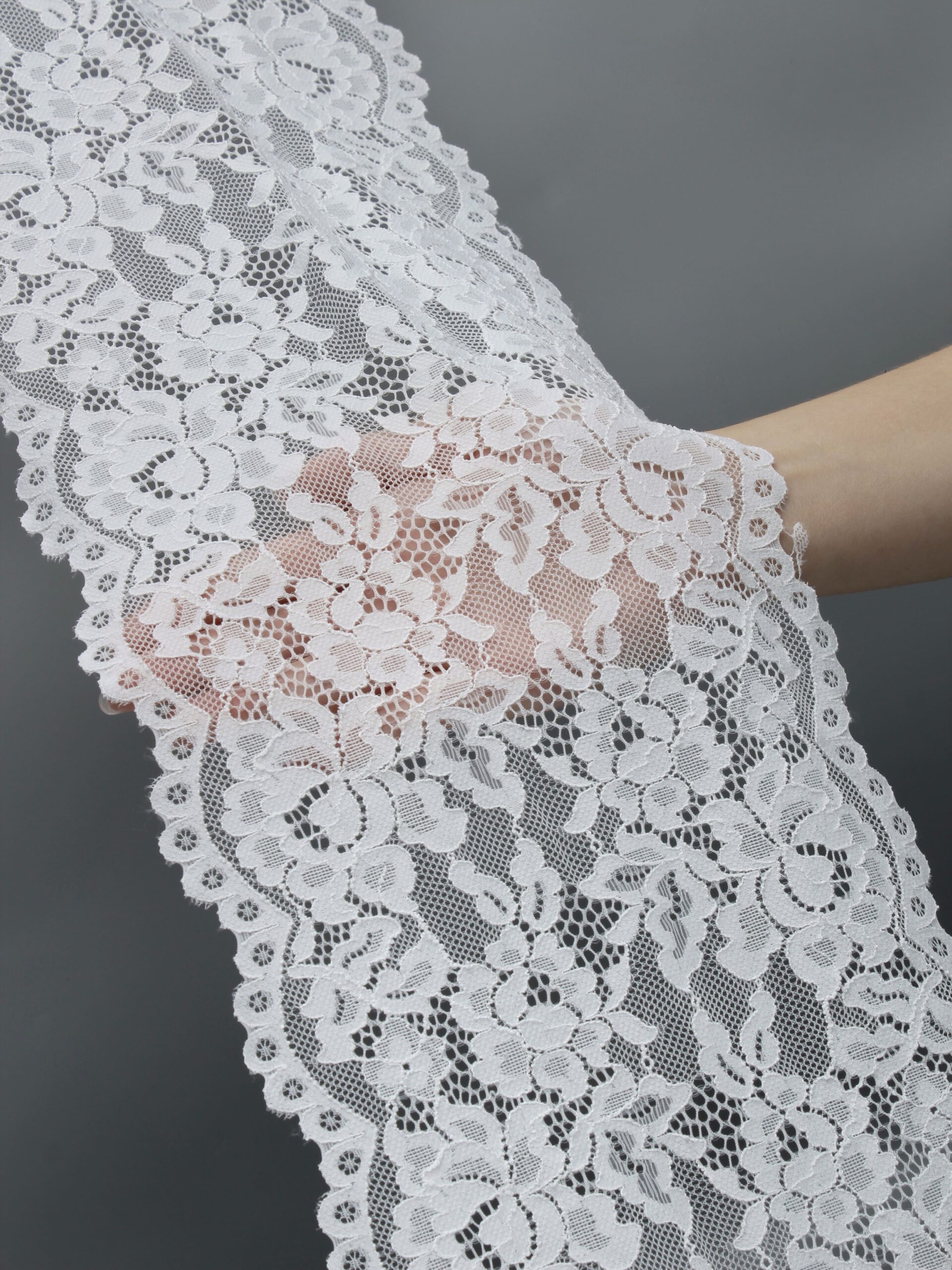 Кружево эластичное белого цвета. Кружево стрейч теплого белого оттенка с цветочным рисунком.