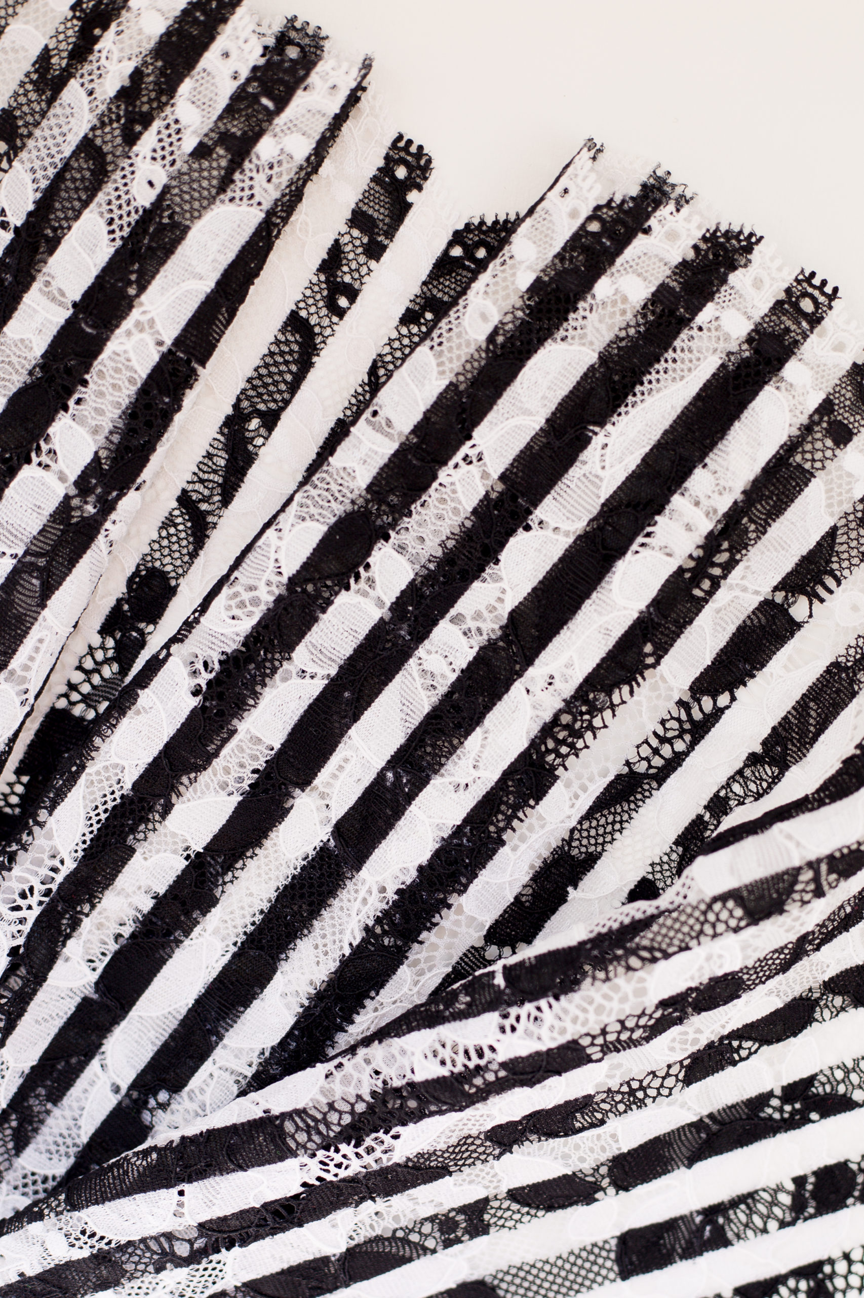 Кружево эластичное стрейч чёрного цвета с белым. Расцветка в полоску. Рисунок цветочный.