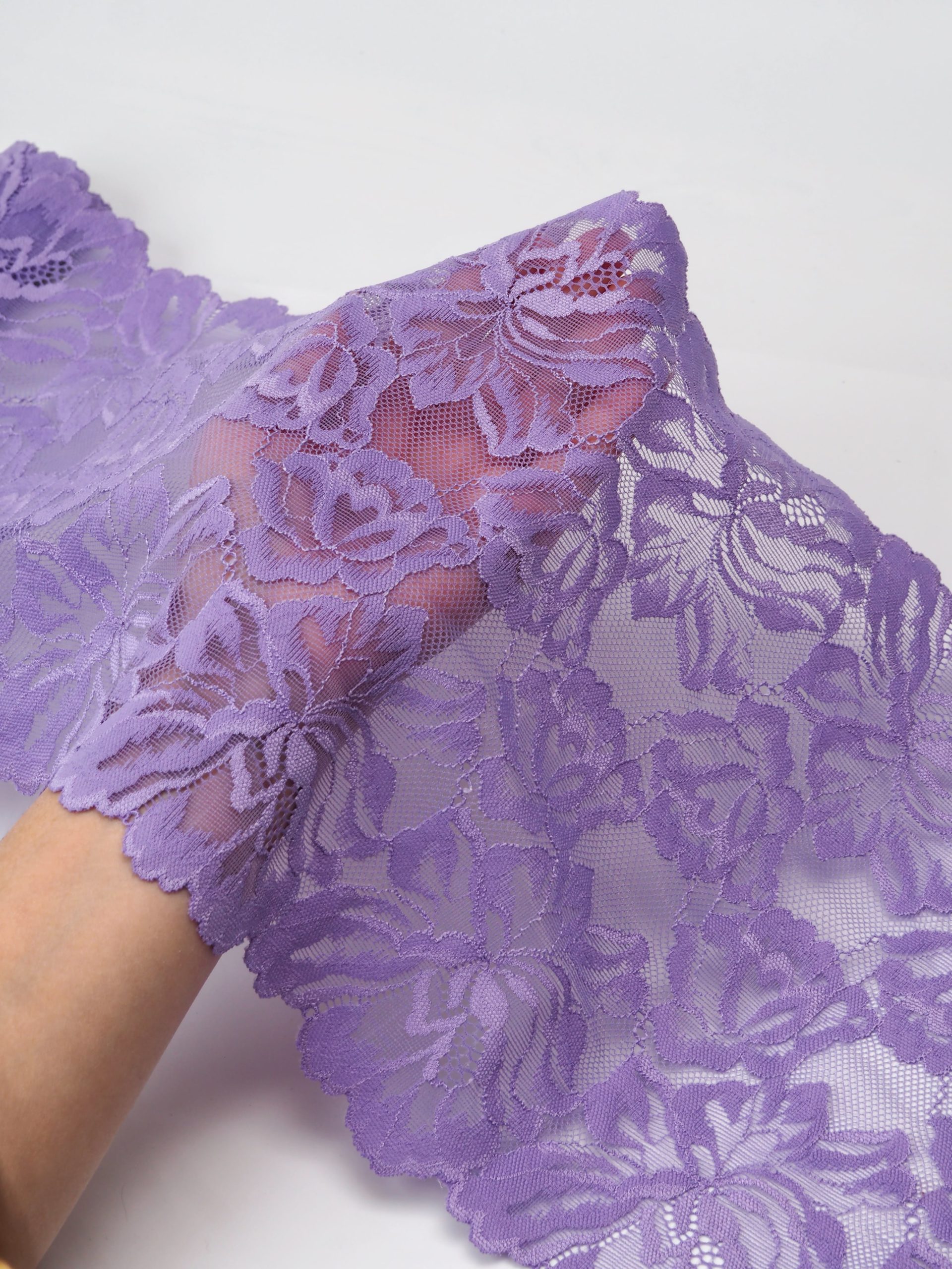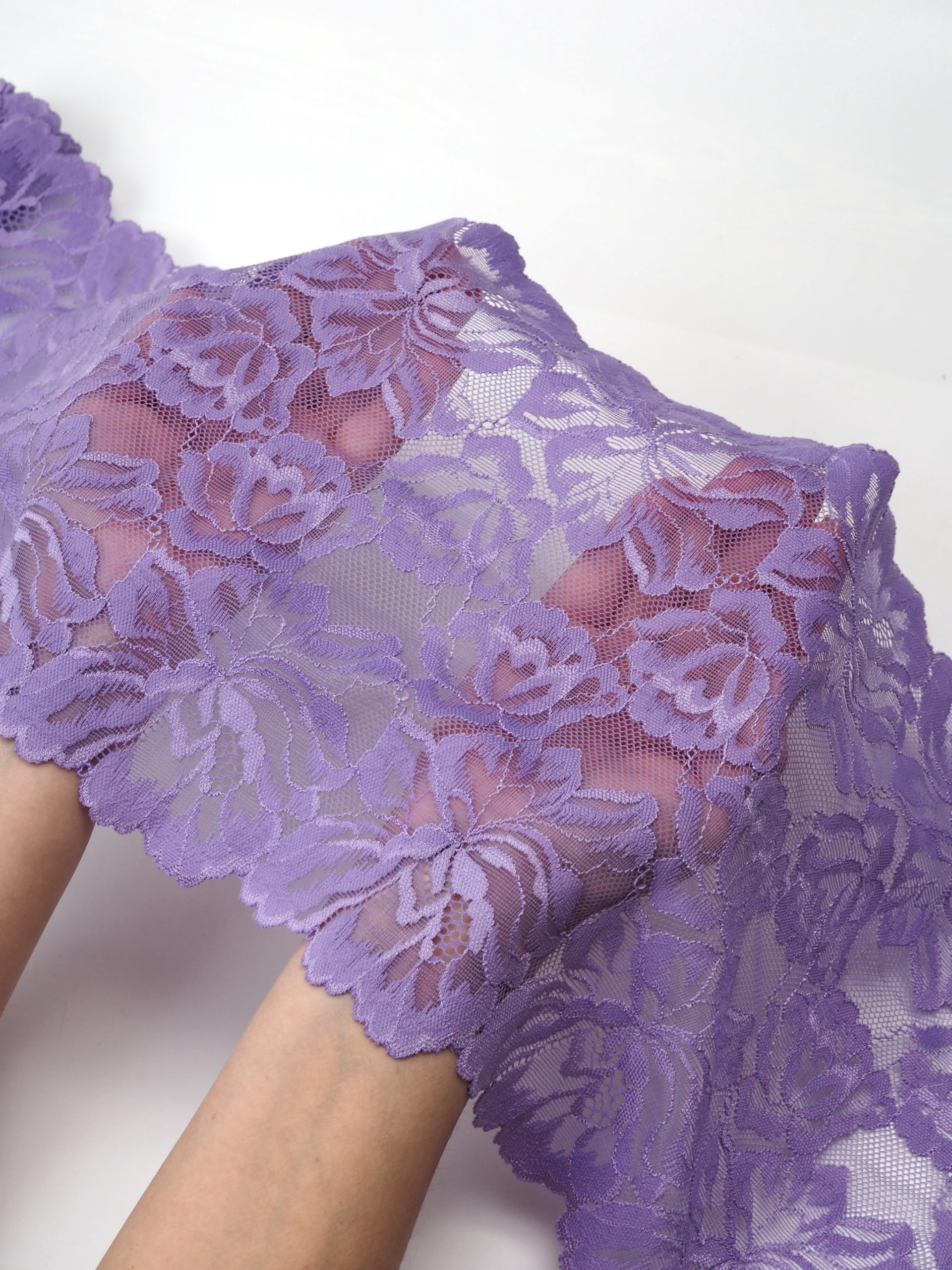 Кружево эластичное фиолетовго цвета. Стрейч кружево яркая лаванда с цветочным рисунком.